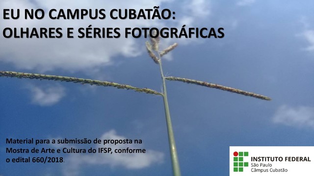 seleção de fotografias produzidas no Campus IFSP Cubatão por alunos dos 1ºs anos dos cursos de Ensino Médio Técnicos em Eventos e Informática durante as aulas de Arte em 2018, coordenados pela Profª Rita Demarchi. O projeto envolveu a prática de fotografar com celular e também aulas teóricas sobre linguagem fotográfica e leitura de imagens. Cada aluno pode fazer muitas descobertas e expressar um olhar particular sobre os diferentes espaços em nosso campus. Samira Santana “Céu”