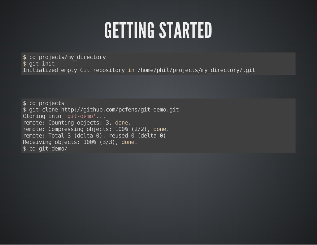 c t s / m y _ d i r e c t o r y $ g i t i n i t I n i t i a l i z e d e m p t y G i t r e p o s i t o r y i n / h o m e / p h i l / p r o j e c t s / m y _ d i r e c t o r y / . g i t $ c d p r o j e c t s $ g i t c l o n e h t t p : / / g i t h u b . c o m / p c f e n s / g i t - d e m o . g i t C l o n i n g i n t o ' g i t - d e m o ' . . . r e m o t e : C o u n t i n g o b j e c t s : 3 , d o n e . r e m o t e : C o m p r e s s i n g o b j e c t s : 1 0 0 % ( 2 / 2 ) , d o n e . r e m o t e : T o t a l 3 ( d e l t a 0 ) , r e u s e d 0 ( d e l t a 0 ) R e c e i v i n g o b j e c t s : 1 0 0 % ( 3 / 3 ) , d o n e . $ c d g i t - d e m o /