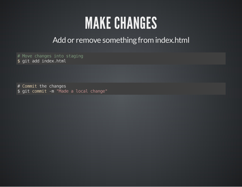 o v e c h a n g e s i n t o s t a g i n g $ g i t a d d i n d e x . h t m l # C o m m i t t h e c h a n g e s $ g i t c o m m i t - m " M a d e a l o c a l c h a n g e "