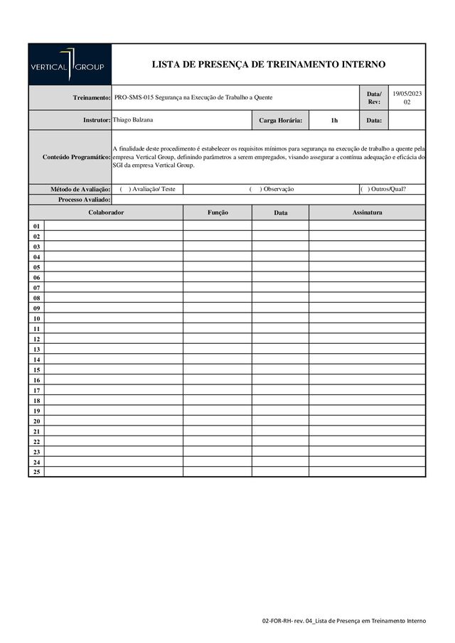 02 03 04 05 06 07 08 09 10 11 12 13 14 15 16 17 18 19 20 21 22 23 24 25 LISTA DE PRESENÇA DE TREINAMENTO INTERNO Treinamento: Colaborador Função Método de Avaliação: Thiago Balzana PRO-SMS-015 Segurança na Execução de Trabalho a Quente ( ) Avaliação/ Teste ( ) Observação ( ) Outros/Qual? Assinatura Instrutor: Conteúdo Programático: A finalidade deste procedimento é estabelecer os requisitos mínimos para segurança na execução de trabalho a quente pela empresa Vertical Group, definindo parâmetros a serem empregados, visando assegurar a contínua adequação e eficácia do SGI da empresa Vertical Group. Processo Avaliado: 02-FOR-RH- rev. 04_Lista de Presença em Treinamento Interno