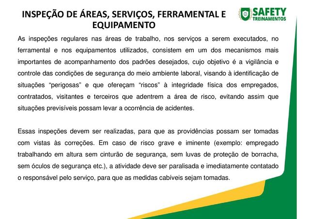 nas áreas de trabalho, nos serviços a serem executados, no ferramental e nos equipamentos utilizados, consistem em um dos mecanismos mais importantes de acompanhamento dos padrões desejados, cujo objetivo é a vigilância e controle das condições de segurança do meio ambiente laboral, visando à identificação de situações “perigosas” e que ofereçam “riscos” à integridade física dos empregados, contratados, visitantes e terceiros que adentrem a área de risco, evitando assim que situações previsíveis possam levar a ocorrência de acidentes. Essas inspeções devem ser realizadas, para que as providências possam ser tomadas com vistas às correções. Em caso de risco grave e iminente (exemplo: empregado trabalhando em altura sem cinturão de segurança, sem luvas de proteção de borracha, sem óculos de segurança etc.), a atividade deve ser paralisada e imediatamente contatado o responsável pelo serviço, para que as medidas cabíveis sejam tomadas.