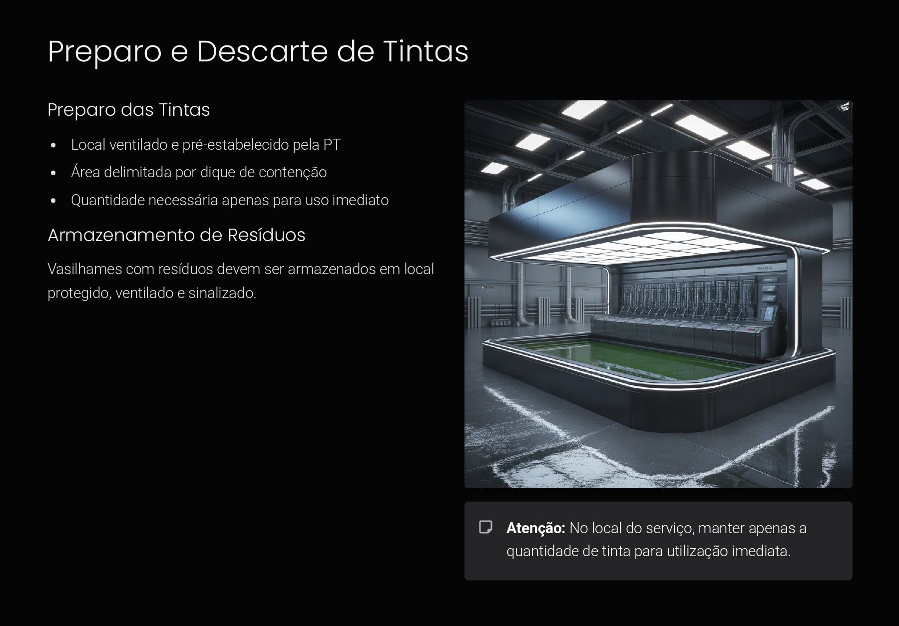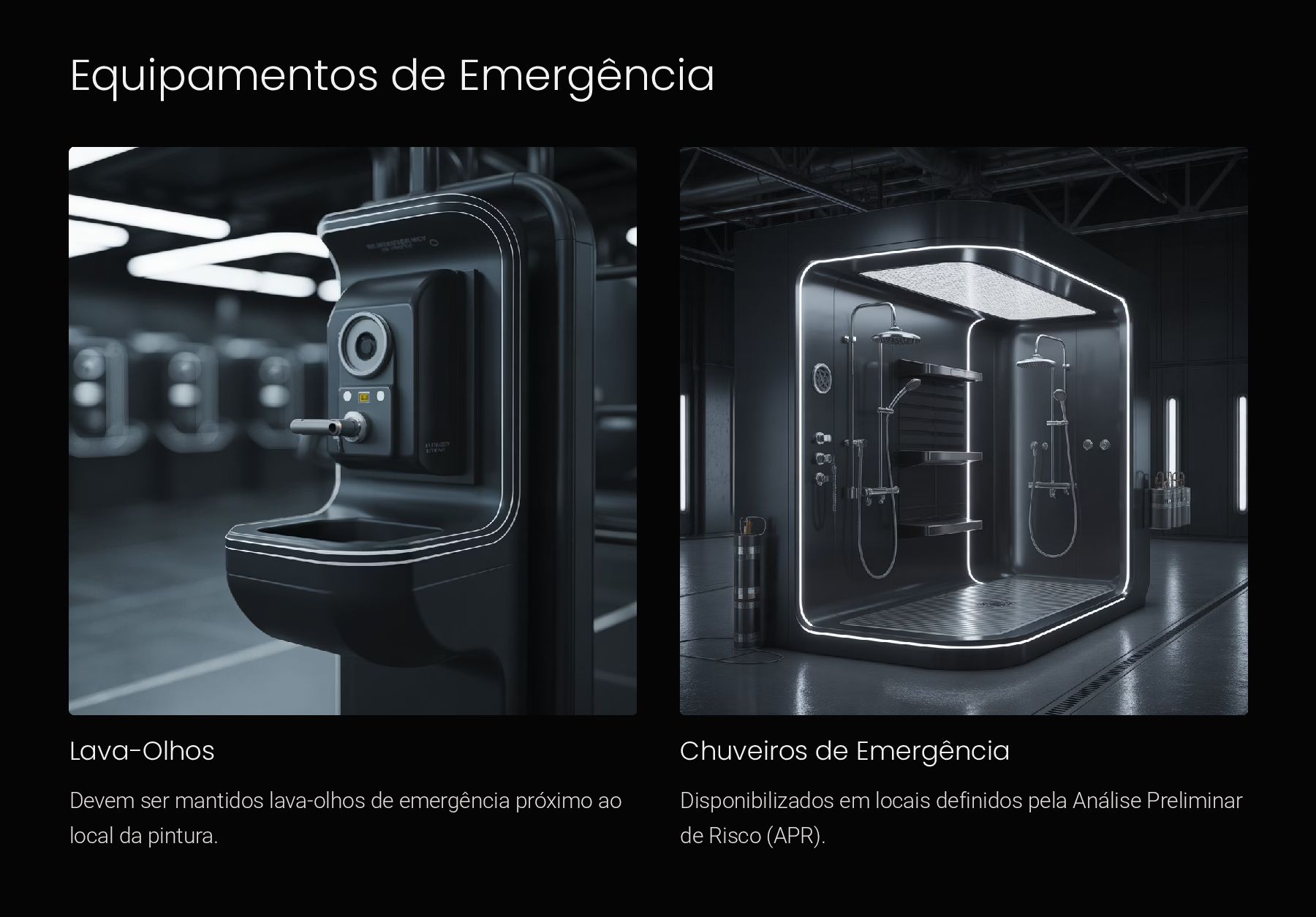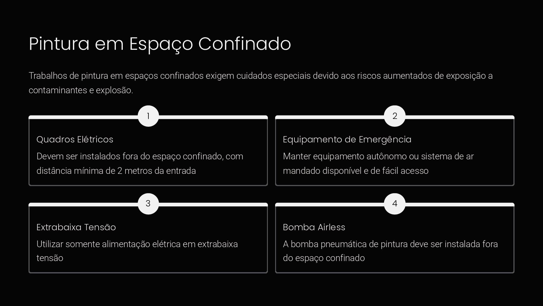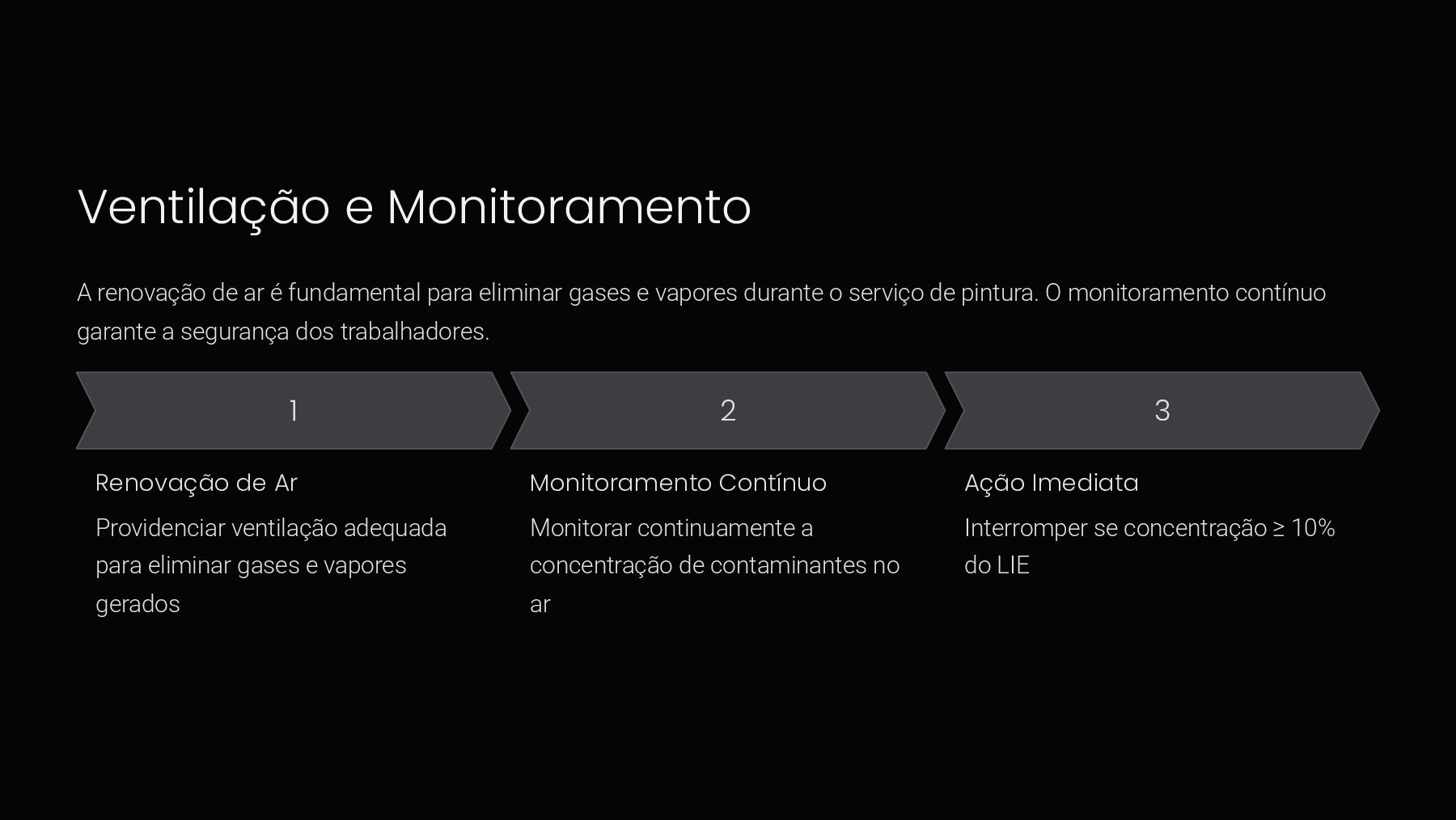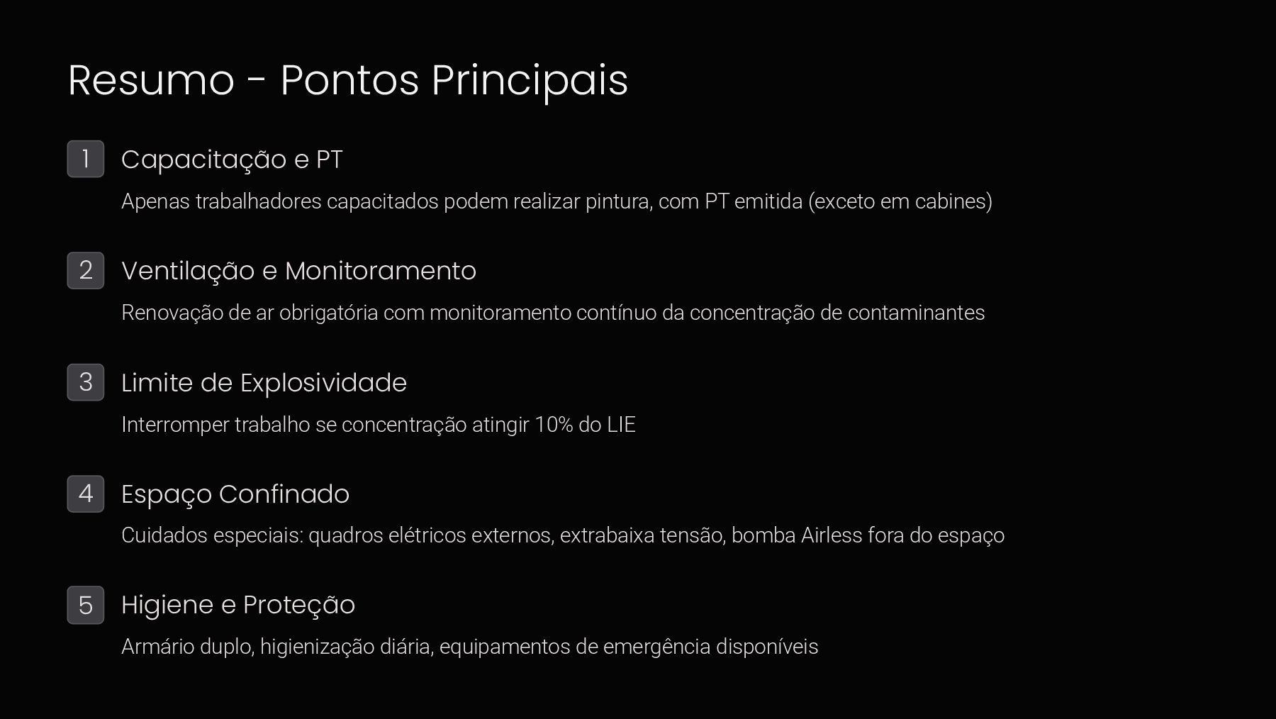 capacitados podem realizar pintura, com PT emitida (exceto em cabines) 2 Ventilação e Monitoramento Renovação de ar obrigatória com monitoramento contínuo da concentração de contaminantes 3 Limite de Explosividade Interromper trabalho se concentração atingir 10% do LIE 4 Espaço Confinado Cuidados especiais: quadros elétricos externos, extrabaixa tensão, bomba Airless fora do espaço 5 Higiene e Proteção Armário duplo, higienização diária, equipamentos de emergência disponíveis