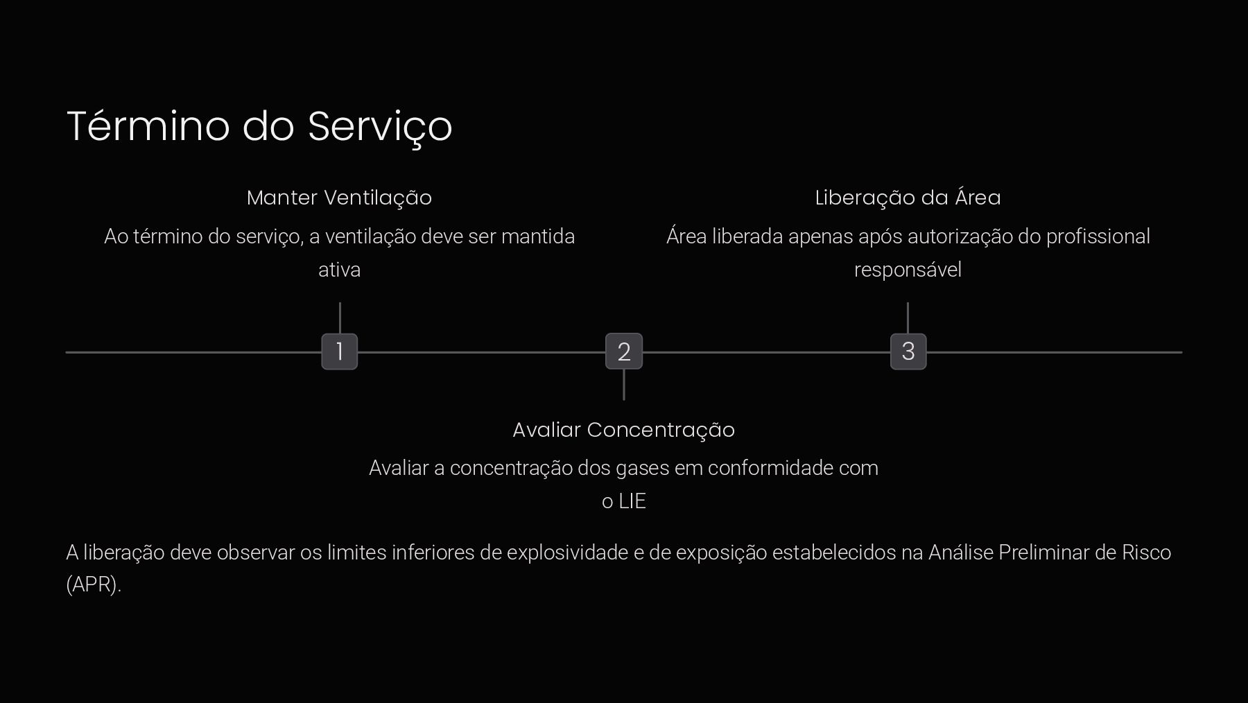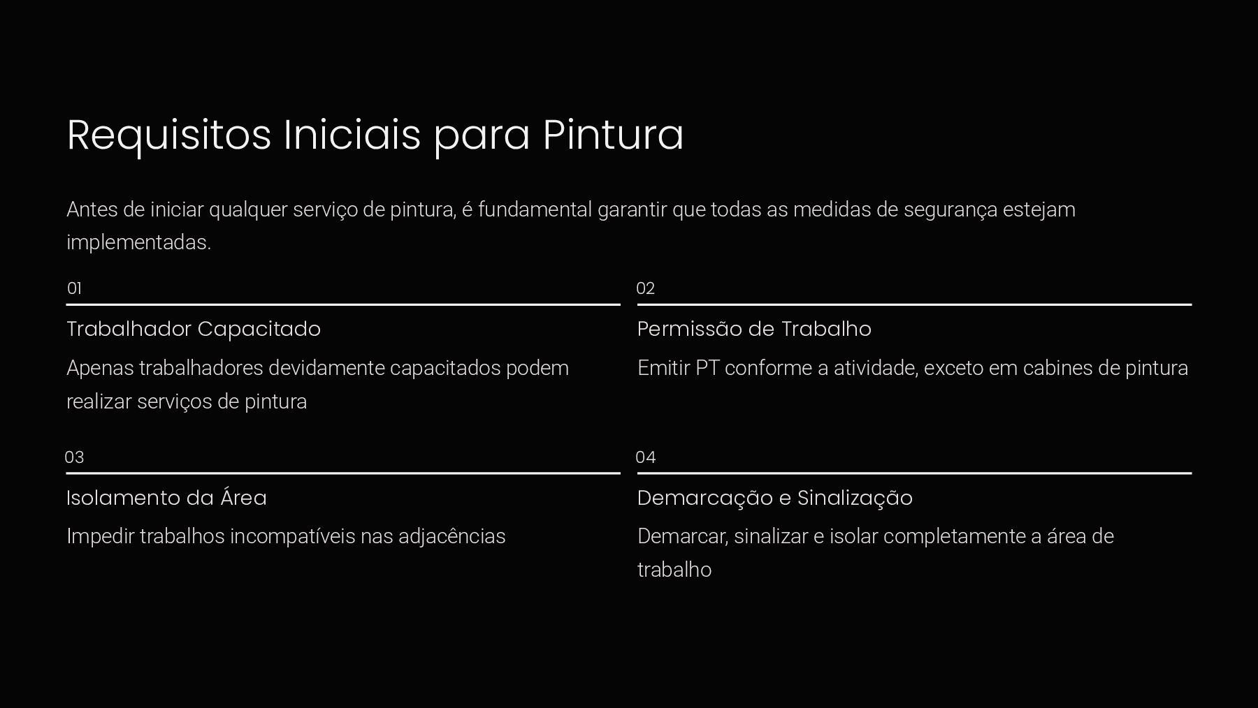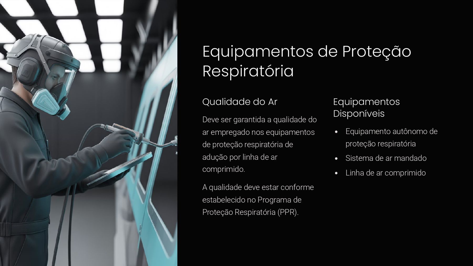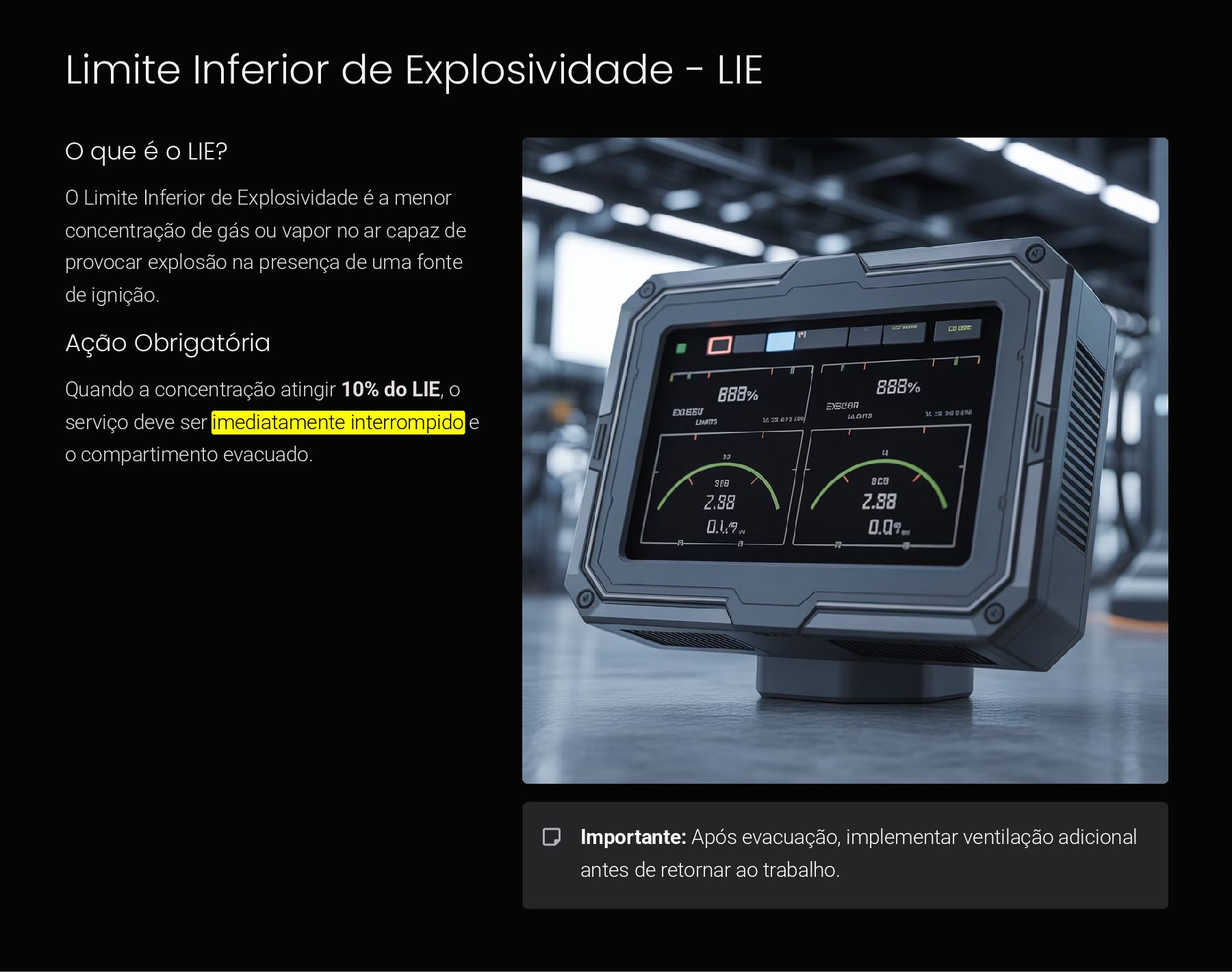 capacitados podem realizar pintura, com PT emitida (exceto em cabines) 2 Ventilação e Monitoramento Renovação de ar obrigatória com monitoramento contínuo da concentração de contaminantes 3 Limite de Explosividade Interromper trabalho se concentração atingir 10% do LIE 4 Espaço Confinado Cuidados especiais: quadros elétricos externos, extrabaixa tensão, bomba Airless fora do espaço 5 Higiene e Proteção Armário duplo, higienização diária, equipamentos de emergência disponíveis