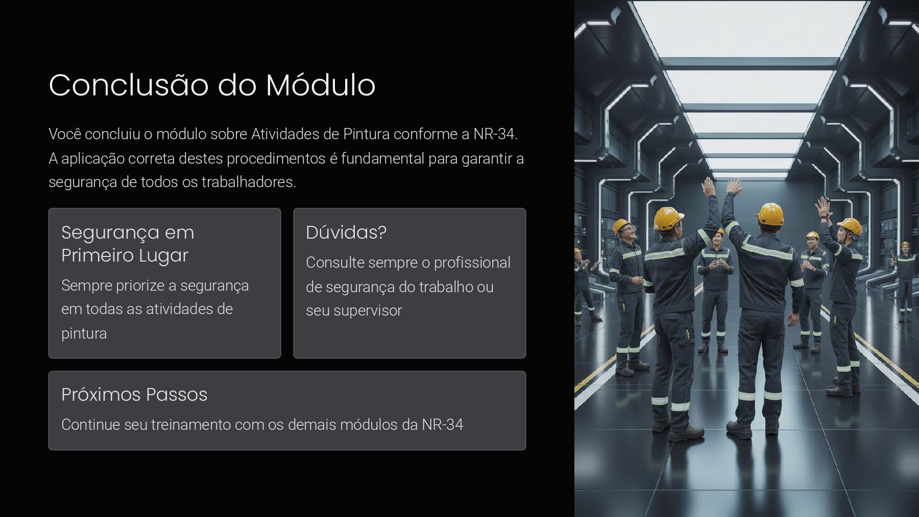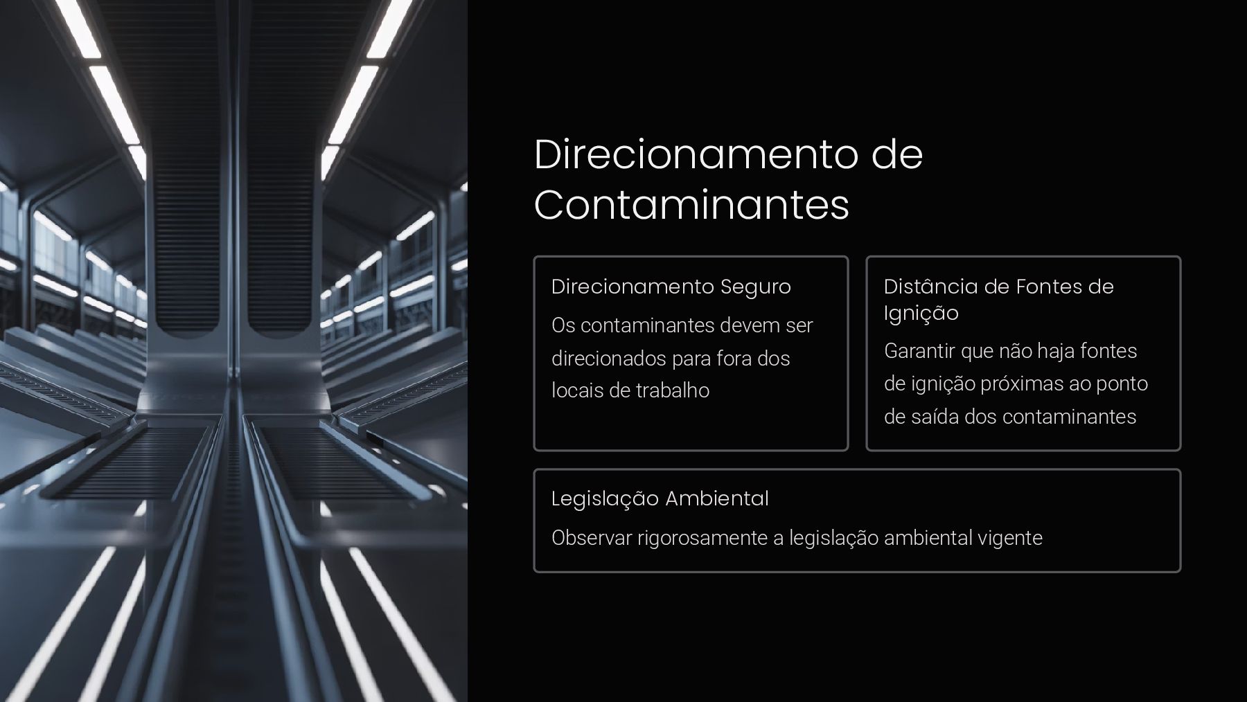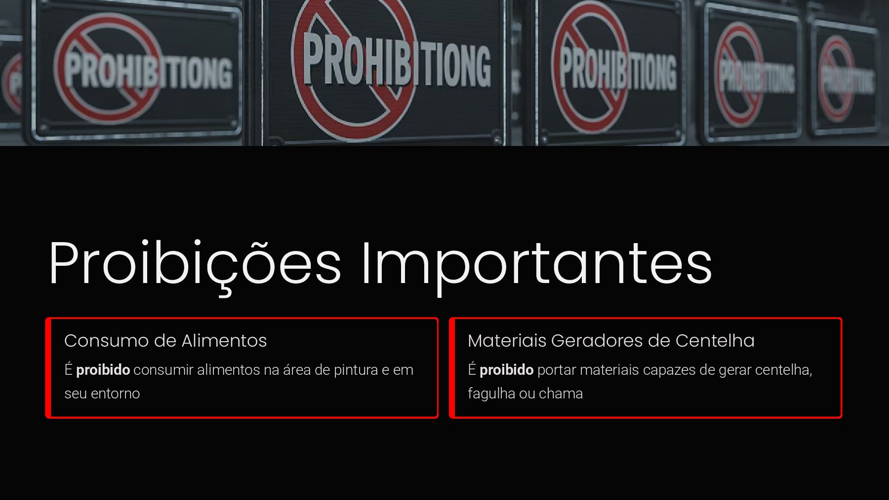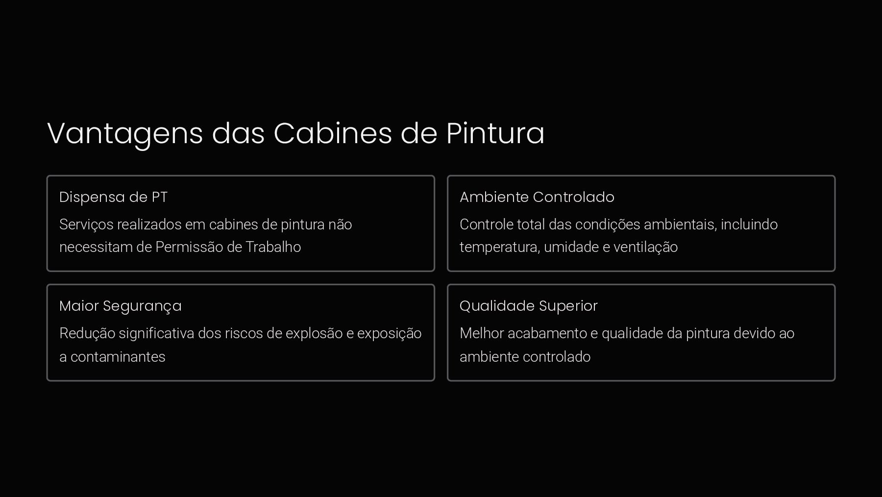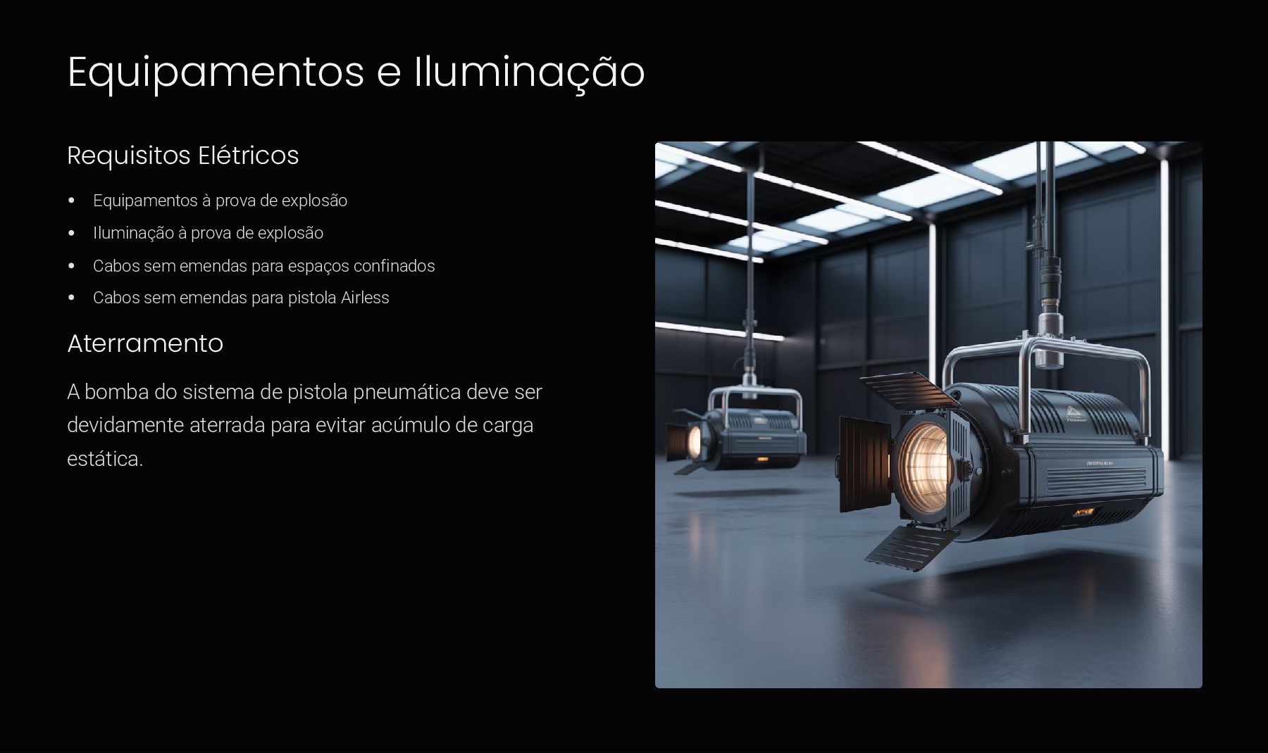 capacitados podem realizar pintura, com PT emitida (exceto em cabines) 2 Ventilação e Monitoramento Renovação de ar obrigatória com monitoramento contínuo da concentração de contaminantes 3 Limite de Explosividade Interromper trabalho se concentração atingir 10% do LIE 4 Espaço Confinado Cuidados especiais: quadros elétricos externos, extrabaixa tensão, bomba Airless fora do espaço 5 Higiene e Proteção Armário duplo, higienização diária, equipamentos de emergência disponíveis