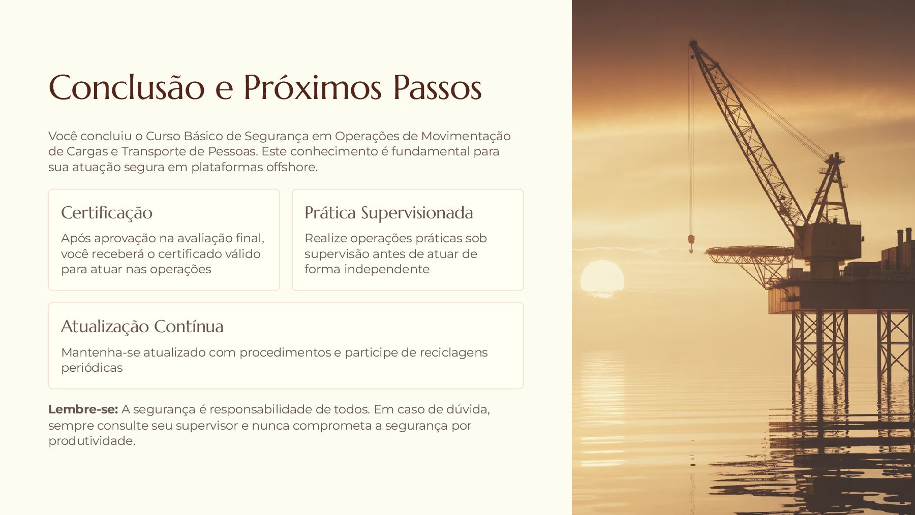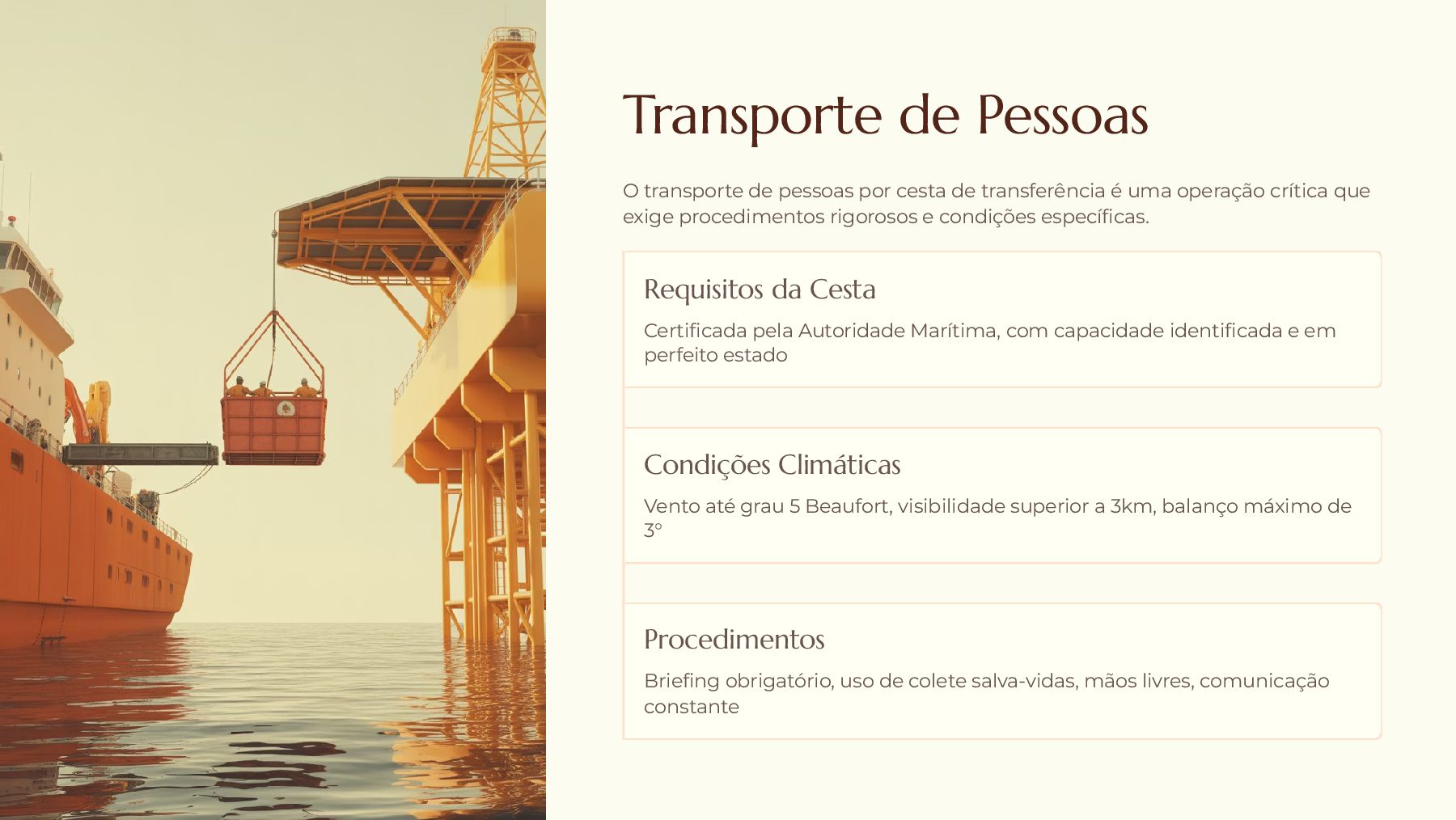 transferência é uma operação crítica que exige procedimentos rigorosos e condições específicas. Requisitos da Cesta Certificada pela Autoridade Marítima, com capacidade identificada e em perfeito estado Condições Climáticas Vento até grau 5 Beaufort, visibilidade superior a 3km, balanço máximo de 3° Procedimentos Briefing obrigatório, uso de colete salva-vidas, mãos livres, comunicação constante
