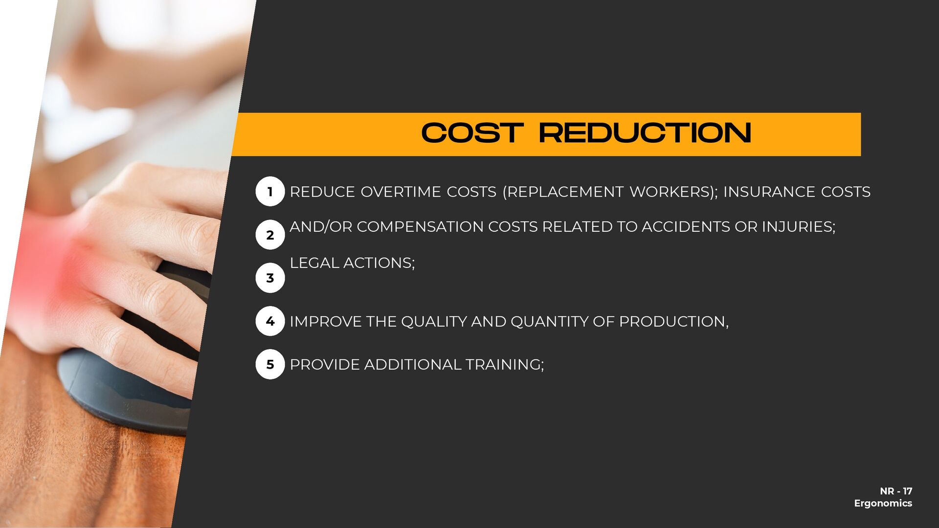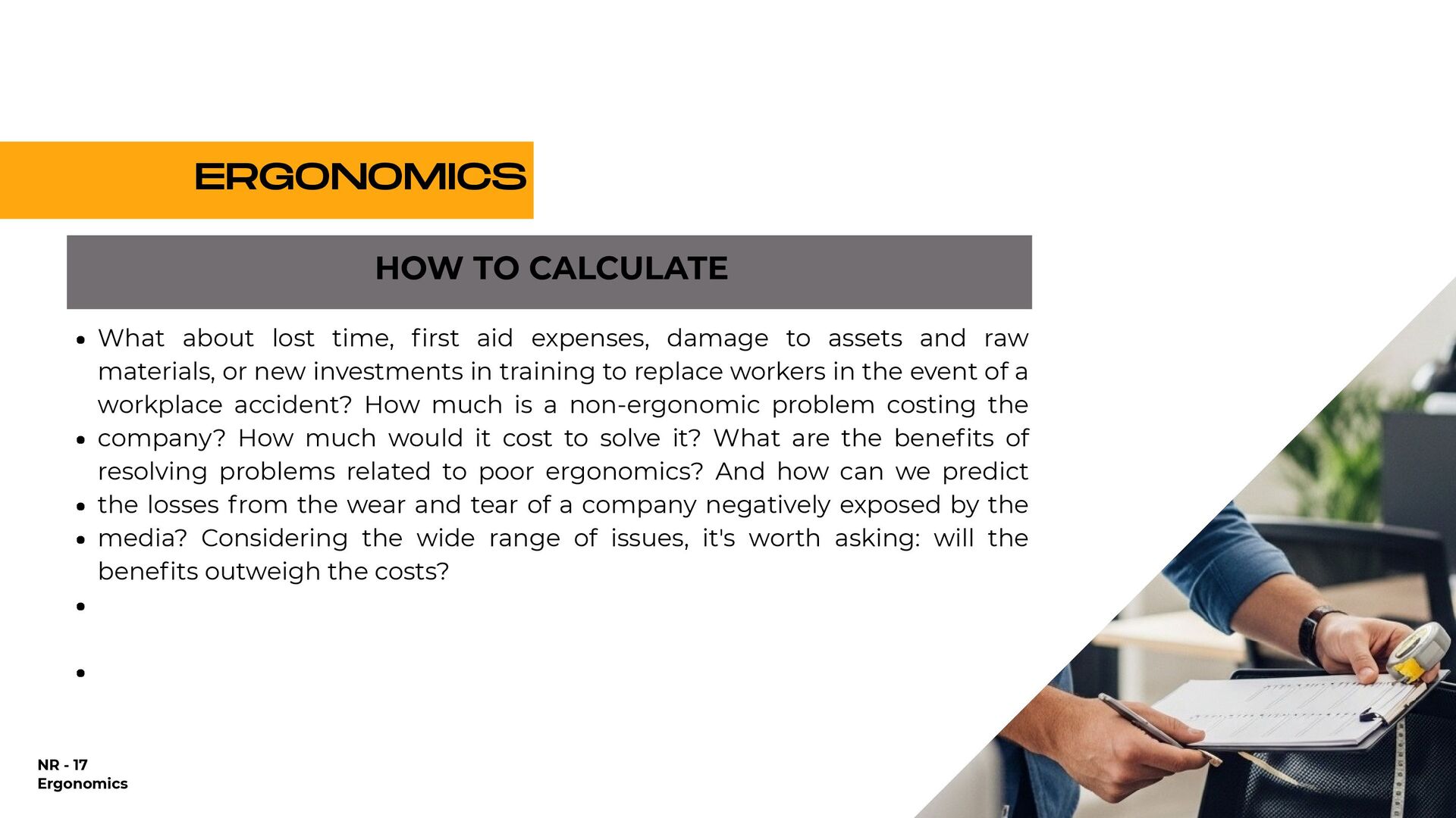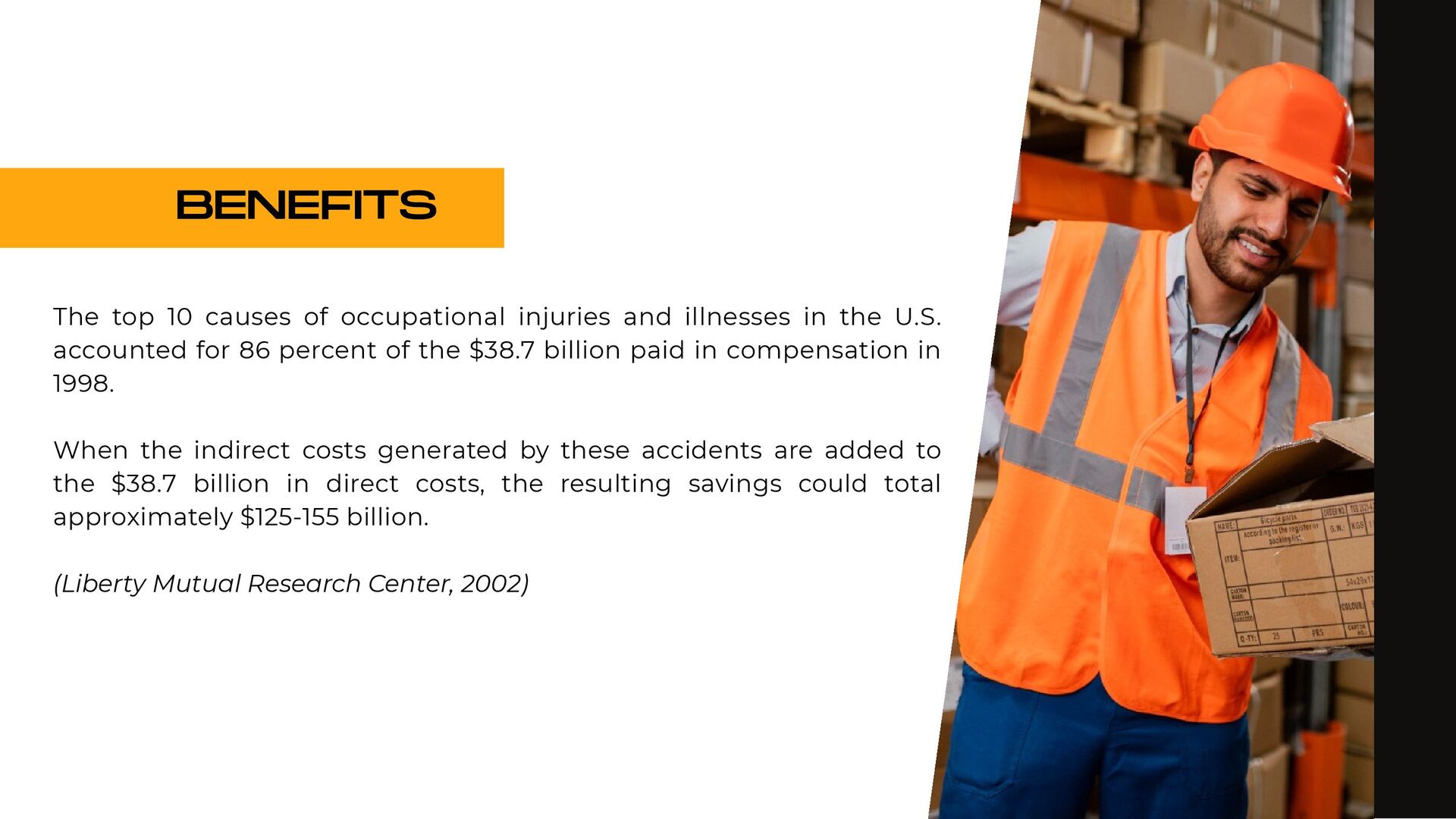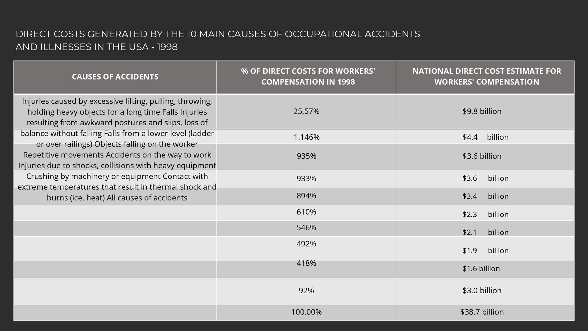 holding heavy objects for a long time Falls Injuries resulting from awkward postures and slips, loss of balance without falling Falls from a lower level (ladder or over railings) Objects falling on the worker Repetitive movements Accidents on the way to work Injuries due to shocks, collisions with heavy equipment Crushing by machinery or equipment Contact with extreme temperatures that result in thermal shock and burns (ice, heat) All causes of accidents 25,57% 1.146% 935% 933% 894% 610% 546% 492% 418% 92% 100,00% % OF DIRECT COSTS FOR WORKERS' COMPENSATION IN 1998 $9.8 billion $4.4 billion $3.6 billion $3.6 billion $3.4 billion $2.3 billion $2.1 billion $1.9 billion $1.6 billion $3.0 billion $38.7 billion NATIONAL DIRECT COST ESTIMATE FOR WORKERS' COMPENSATION DIRECT COSTS GENERATED BY THE 10 MAIN CAUSES OF OCCUPATIONAL ACCIDENTS AND ILLNESSES IN THE USA - 1998