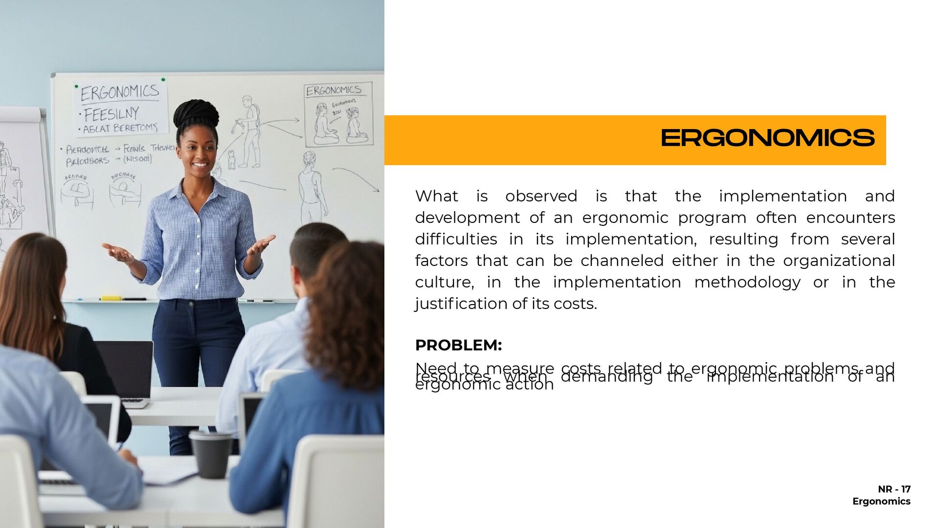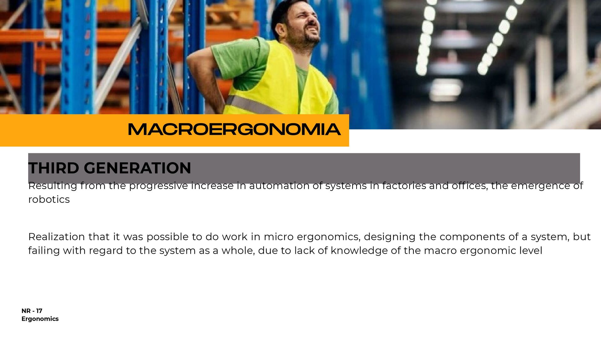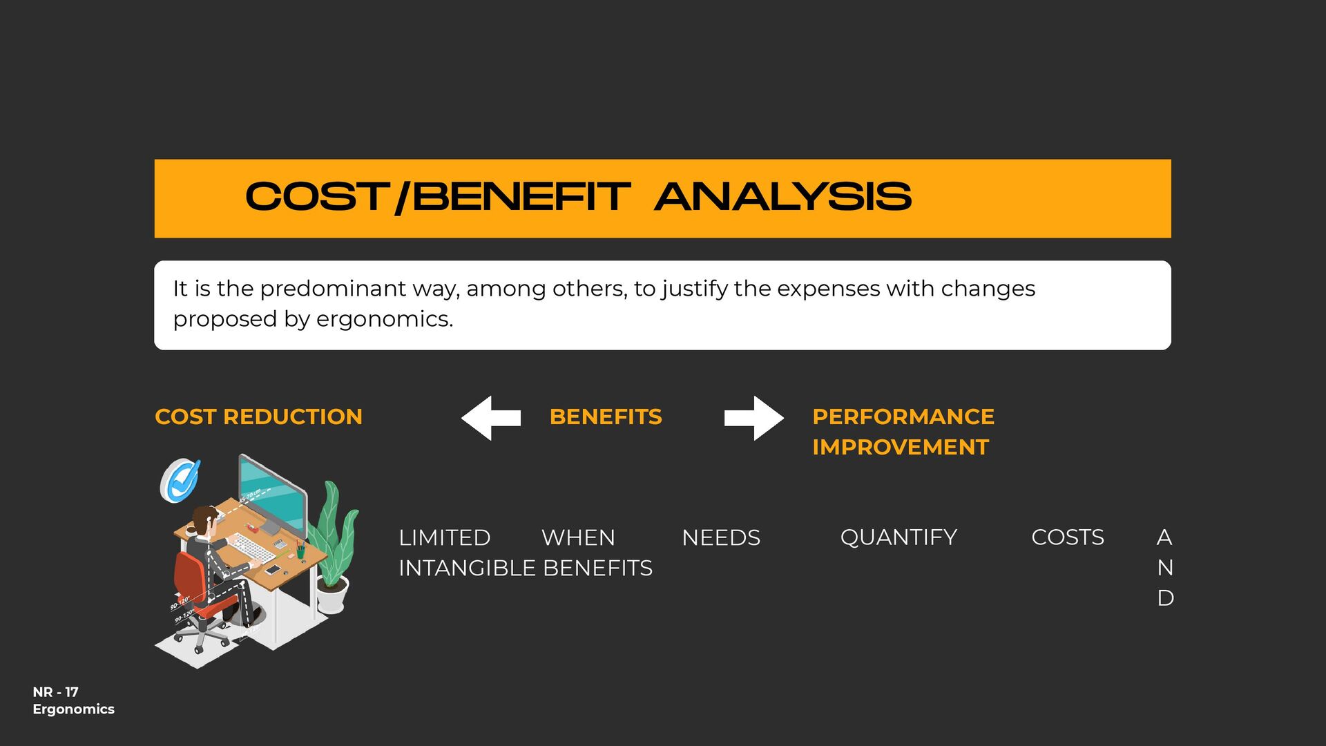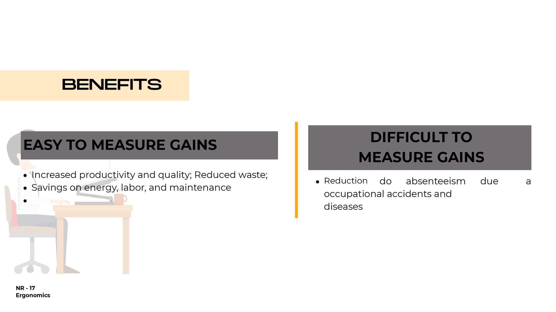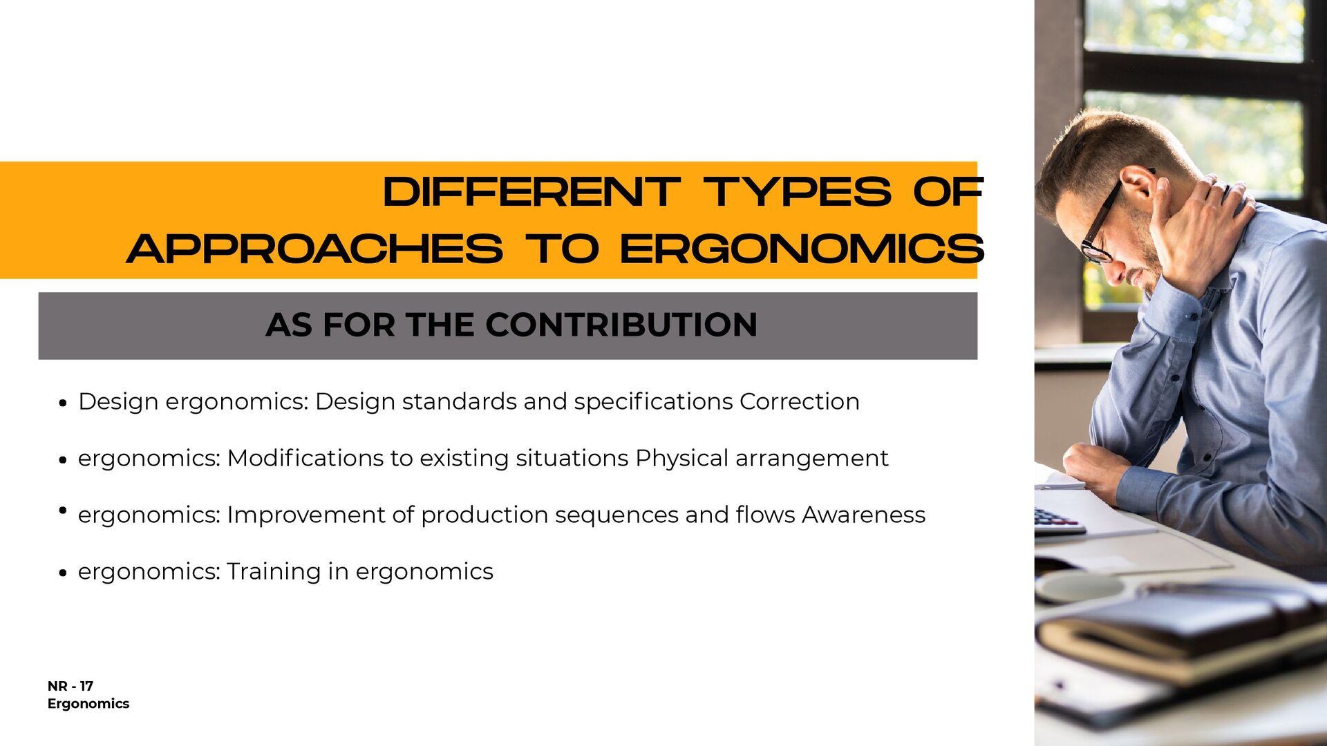 holding heavy objects for a long time Falls Injuries resulting from awkward postures and slips, loss of balance without falling Falls from a lower level (ladder or over railings) Objects falling on the worker Repetitive movements Accidents on the way to work Injuries due to shocks, collisions with heavy equipment Crushing by machinery or equipment Contact with extreme temperatures that result in thermal shock and burns (ice, heat) All causes of accidents 25,57% 1.146% 935% 933% 894% 610% 546% 492% 418% 92% 100,00% % OF DIRECT COSTS FOR WORKERS' COMPENSATION IN 1998 $9.8 billion $4.4 billion $3.6 billion $3.6 billion $3.4 billion $2.3 billion $2.1 billion $1.9 billion $1.6 billion $3.0 billion $38.7 billion NATIONAL DIRECT COST ESTIMATE FOR WORKERS' COMPENSATION DIRECT COSTS GENERATED BY THE 10 MAIN CAUSES OF OCCUPATIONAL ACCIDENTS AND ILLNESSES IN THE USA - 1998