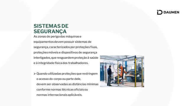 equipamentos devem possuir sistemas de segurança, caracterizados por proteções fixas, proteções móveis e dispositivos de segurança interligados, que resguardem proteção à saúde e à integridade física dos trabalhadores. ➢ Quando utilizadas proteções que restringem o acesso do corpo ou parte dele, devem ser observadas as distâncias mínimas conforme normas técnicas oficiais ou normas internacionais aplicáveis.