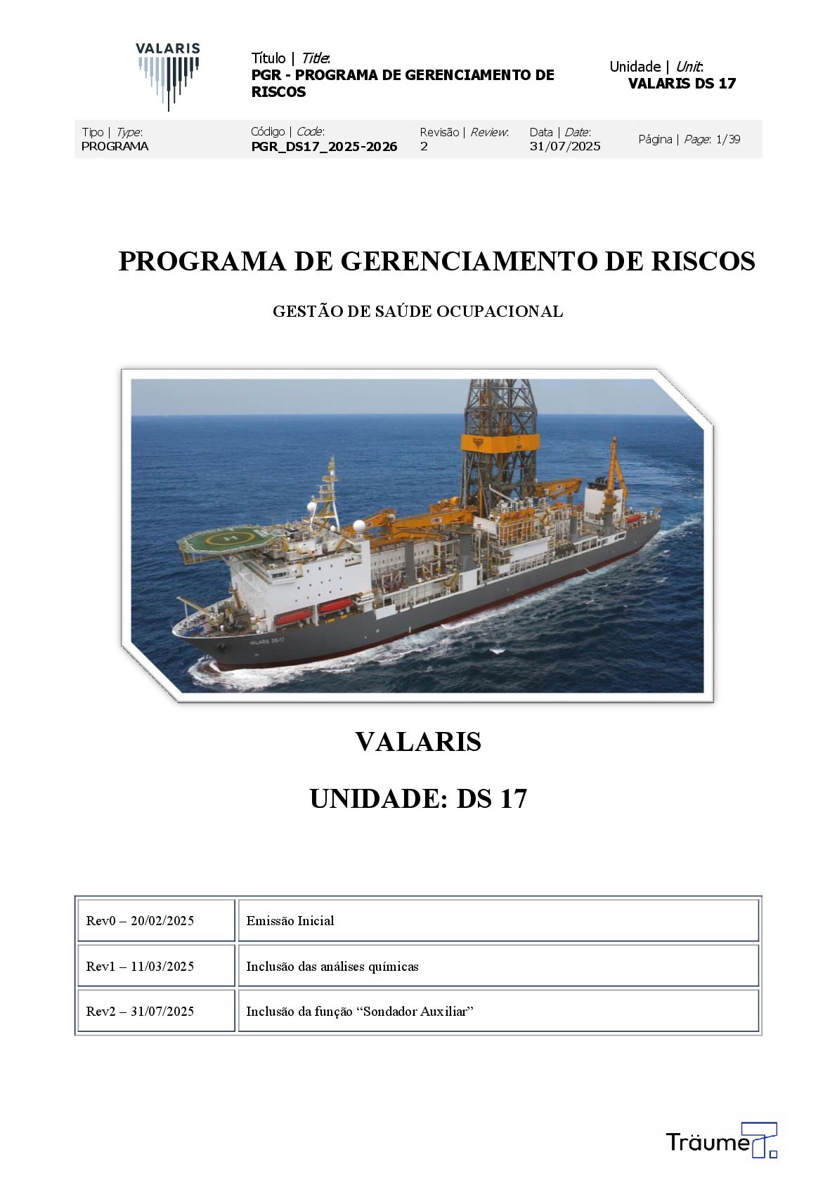 Unidade | Unit: VALARIS DS 17 Tipo | Type: PROGRAMA Código | Code: PGR_DS17_2025-2026 Revisão | Review: 2 Data | Date: 31/07/2025 Página | Page: 1/39 PROGRAMA DE GERENCIAMENTO DE RISCOS GESTÃO DE SAÚDE OCUPACIONAL VALARIS UNIDADE: DS 17 Rev0 – 20/02/2025 Emissão Inicial Rev1 – 11/03/2025 Inclusão das análises químicas Rev2 – 31/07/2025 Inclusão da função “Sondador Auxiliar”