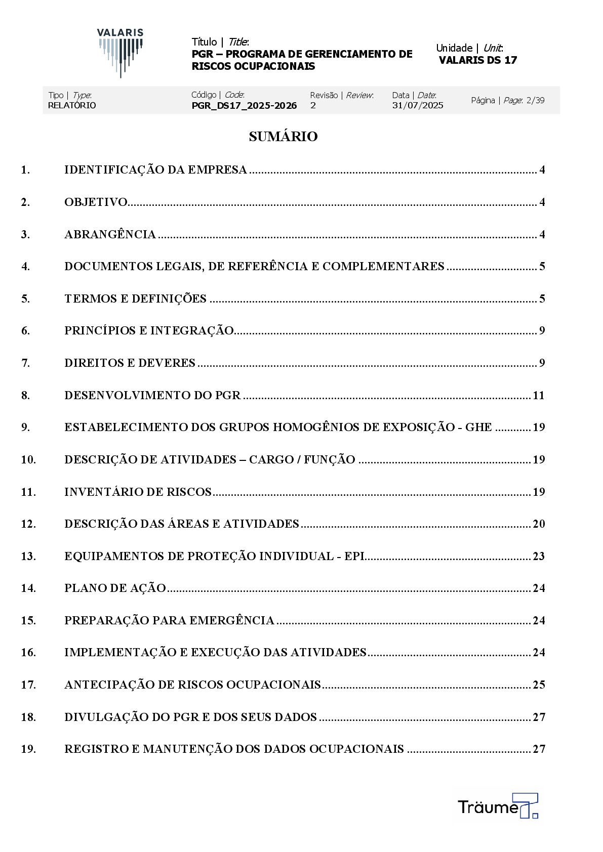 OCUPACIONAIS Unidade | Unit: VALARIS DS 17 Tipo | Type: RELATÓRIO Código | Code: PGR_DS17_2025-2026 Revisão | Review: 2 Data | Date: 31/07/2025 Página | Page: 2/39 SUMÁRIO 1. IDENTIFICAÇÃO DA EMPRESA ............................................................................................... 4 2. OBJETIVO ....................................................................................................................................... 4 3. ABRANGÊNCIA ............................................................................................................................. 4 4. DOCUMENTOS LEGAIS, DE REFERÊNCIA E COMPLEMENTARES .............................. 5 5. TERMOS E DEFINIÇÕES ............................................................................................................ 5 6. PRINCÍPIOS E INTEGRAÇÃO.................................................................................................... 9 7. DIREITOS E DEVERES ................................................................................................................ 9 8. DESENVOLVIMENTO DO PGR ............................................................................................... 11 9. ESTABELECIMENTO DOS GRUPOS HOMOGÊNIOS DE EXPOSIÇÃO - GHE ............ 19 10. DESCRIÇÃO DE ATIVIDADES – CARGO / FUNÇÃO ......................................................... 19 11. INVENTÁRIO DE RISCOS ......................................................................................................... 19 12. DESCRIÇÃO DAS ÁREAS E ATIVIDADES ............................................................................ 20 13. EQUIPAMENTOS DE PROTEÇÃO INDIVIDUAL - EPI....................................................... 23 14. PLANO DE AÇÃO ........................................................................................................................ 24 15. PREPARAÇÃO PARA EMERGÊNCIA .................................................................................... 24 16. IMPLEMENTAÇÃO E EXECUÇÃO DAS ATIVIDADES ...................................................... 24 17. ANTECIPAÇÃO DE RISCOS OCUPACIONAIS ..................................................................... 25 18. DIVULGAÇÃO DO PGR E DOS SEUS DADOS ...................................................................... 27 19. REGISTRO E MANUTENÇÃO DOS DADOS OCUPACIONAIS ......................................... 27