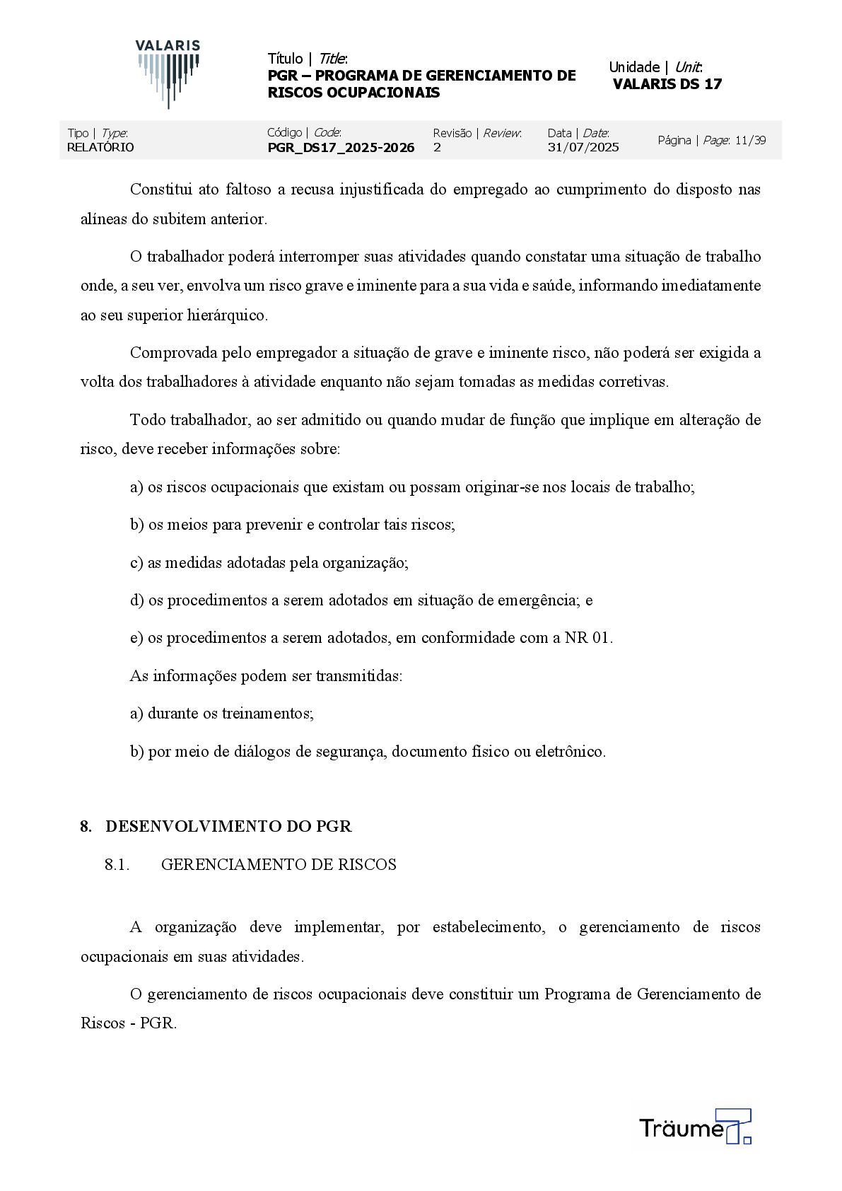 OCUPACIONAIS Unidade | Unit: VALARIS DS 17 Tipo | Type: RELATÓRIO Código | Code: PGR_DS17_2025-2026 Revisão | Review: 2 Data | Date: 31/07/2025 Página | Page: 11/39 Constitui ato faltoso a recusa injustificada do empregado ao cumprimento do disposto nas alíneas do subitem anterior. O trabalhador poderá interromper suas atividades quando constatar uma situação de trabalho onde, a seu ver, envolva um risco grave e iminente para a sua vida e saúde, informando imediatamente ao seu superior hierárquico. Comprovada pelo empregador a situação de grave e iminente risco, não poderá ser exigida a volta dos trabalhadores à atividade enquanto não sejam tomadas as medidas corretivas. Todo trabalhador, ao ser admitido ou quando mudar de função que implique em alteração de risco, deve receber informações sobre: a) os riscos ocupacionais que existam ou possam originar-se nos locais de trabalho; b) os meios para prevenir e controlar tais riscos; c) as medidas adotadas pela organização; d) os procedimentos a serem adotados em situação de emergência; e e) os procedimentos a serem adotados, em conformidade com a NR 01. As informações podem ser transmitidas: a) durante os treinamentos; b) por meio de diálogos de segurança, documento físico ou eletrônico. 8. DESENVOLVIMENTO DO PGR 8.1. GERENCIAMENTO DE RISCOS A organização deve implementar, por estabelecimento, o gerenciamento de riscos ocupacionais em suas atividades. O gerenciamento de riscos ocupacionais deve constituir um Programa de Gerenciamento de Riscos - PGR.