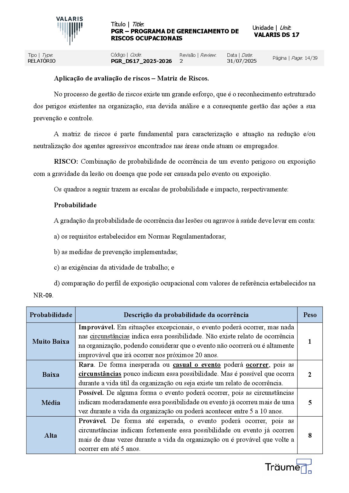 OCUPACIONAIS Unidade | Unit: VALARIS DS 17 Tipo | Type: RELATÓRIO Código | Code: PGR_DS17_2025-2026 Revisão | Review: 2 Data | Date: 31/07/2025 Página | Page: 14/39 Aplicação de avaliação de riscos – Matriz de Riscos. No processo de gestão de riscos existe um grande esforço, que é o reconhecimento estruturado dos perigos existentes na organização, sua devida análise e a consequente gestão das ações a sua prevenção e controle. A matriz de riscos é parte fundamental para caracterização e atuação na redução e/ou neutralização dos agentes agressivos encontrados nas áreas onde atuam os empregados. RISCO: Combinação de probabilidade de ocorrência de um evento perigoso ou exposição com a gravidade da lesão ou doença que pode ser causada pelo evento ou exposição. Os quadros a seguir trazem as escalas de probabilidade e impacto, respectivamente: Probabilidade A gradação da probabilidade de ocorrência das lesões ou agravos à saúde deve levar em conta: a) os requisitos estabelecidos em Normas Regulamentadoras; b) as medidas de prevenção implementadas; c) as exigências da atividade de trabalho; e d) comparação do perfil de exposição ocupacional com valores de referência estabelecidos na NR-09. Probabilidade Descrição da probabilidade da ocorrência Peso Muito Baixa Improvável. Em situações excepcionais, o evento poderá ocorrer, mas nada nas circunstâncias indica essa possibilidade. Não existe relato de ocorrência na organização, podendo considerar que o evento não ocorrerá ou é altamente improvável que irá ocorrer nos próximos 20 anos. 1 Baixa Rara. De forma inesperada ou casual o evento poderá ocorrer, pois as circunstâncias pouco indicam essa possibilidade. Mas é possível que ocorra durante a vida útil da organização ou seja existe um relato de ocorrência. 2 Média Possível. De alguma forma o evento poderá ocorrer, pois as circunstâncias indicam moderadamente essa possibilidade ou evento já ocorreu mais de uma vez durante a vida da organização ou poderá acontecer entre 5 a 10 anos. 5 Alta Provável. De forma até esperada, o evento poderá ocorrer, pois as circunstâncias indicam fortemente essa possibilidade ou evento já ocorreu mais de duas vezes durante a vida da organização ou é provável que volte a ocorrer em até 5 anos. 8