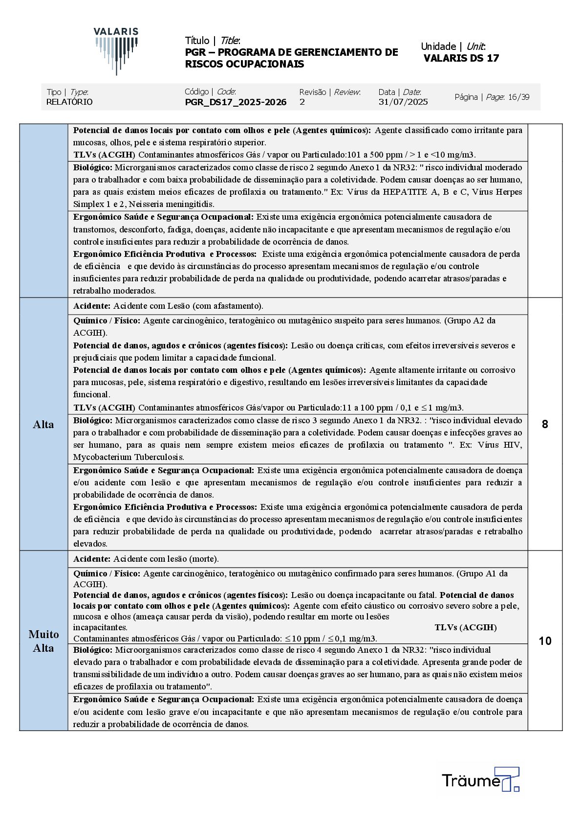 OCUPACIONAIS Unidade | Unit: VALARIS DS 17 Tipo | Type: RELATÓRIO Código | Code: PGR_DS17_2025-2026 Revisão | Review: 2 Data | Date: 31/07/2025 Página | Page: 16/39 Potencial de danos locais por contato com olhos e pele (Agentes químicos): Agente classificado como irritante para mucosas, olhos, pele e sistema respiratório superior. TLVs (ACGIH) Contaminantes atmosféricos Gás / vapor ou Particulado:101 a 500 ppm / > 1 e <10 mg/m3. Biológico: Microrganismos caracterizados como classe de risco 2 segundo Anexo 1 da NR32: " risco individual moderado para o trabalhador e com baixa probabilidade de disseminação para a coletividade. Podem causar doenças ao ser humano, para as quais existem meios eficazes de profilaxia ou tratamento." Ex: Vírus da HEPATITE A, B e C, Vírus Herpes Simplex 1 e 2, Neisseria meningitidis. Ergonômico Saúde e Segurança Ocupacional: Existe uma exigência ergonômica potencialmente causadora de transtornos, desconforto, fadiga, doenças, acidente não incapacitante e que apresentam mecanismos de regulação e/ou controle insuficientes para reduzir a probabilidade de ocorrência de danos. Ergonômico Eficiência Produtiva e Processos: Existe uma exigência ergonômica potencialmente causadora de perda de eficiência e que devido às circunstâncias do processo apresentam mecanismos de regulação e/ou controle insuficientes para reduzir probabilidade de perda na qualidade ou produtividade, podendo acarretar atrasos/paradas e retrabalho moderados. Alta Acidente: Acidente com Lesão (com afastamento). 8 Químico / Físico: Agente carcinogênico, teratogênico ou mutagênico suspeito para seres humanos. (Grupo A2 da ACGIH). Potencial de danos, agudos e crônicos (agentes físicos): Lesão ou doença críticas, com efeitos irreversíveis severos e prejudiciais que podem limitar a capacidade funcional. Potencial de danos locais por contato com olhos e pele (Agentes químicos): Agente altamente irritante ou corrosivo para mucosas, pele, sistema respiratório e digestivo, resultando em lesões irreversíveis limitantes da capacidade funcional. TLVs (ACGIH) Contaminantes atmosféricos Gás/vapor ou Particulado:11 a 100 ppm / 0,1 e  1 mg/m3. Biológico: Microrganismos caracterizados como classe de risco 3 segundo Anexo 1 da NR32. : "risco individual elevado para o trabalhador e com probabilidade de disseminação para a coletividade. Podem causar doenças e infecções graves ao ser humano, para as quais nem sempre existem meios eficazes de profilaxia ou tratamento ". Ex: Vírus HIV, Mycobacterium Tuberculosis. Ergonômico Saúde e Segurança Ocupacional: Existe uma exigência ergonômica potencialmente causadora de doença e/ou acidente com lesão e que apresentam mecanismos de regulação e/ou controle insuficientes para reduzir a probabilidade de ocorrência de danos. Ergonômico Eficiência Produtiva e Processos: Existe uma exigência ergonômica potencialmente causadora de perda de eficiência e que devido às circunstâncias do processo apresentam mecanismos de regulação e/ou controle insuficientes para reduzir probabilidade de perda na qualidade ou produtividade, podendo acarretar atrasos/paradas e retrabalho elevados. Muito Alta Acidente: Acidente com lesão (morte). 10 Químico / Físico: Agente carcinogênico, teratogênico ou mutagênico confirmado para seres humanos. (Grupo A1 da ACGIH). Potencial de danos, agudos e crônicos (agentes físicos): Lesão ou doença incapacitante ou fatal. Potencial de danos locais por contato com olhos e pele (Agentes químicos): Agente com efeito cáustico ou corrosivo severo sobre a pele, mucosa e olhos (ameaça causar perda da visão), podendo resultar em morte ou lesões incapacitantes. TLVs (ACGIH) Contaminantes atmosféricos Gás / vapor ou Particulado:  10 ppm /  0,1 mg/m3. Biológico: Microorganismos caracterizados como classe de risco 4 segundo Anexo 1 da NR32: "risco individual elevado para o trabalhador e com probabilidade elevada de disseminação para a coletividade. Apresenta grande poder de transmissibilidade de um indivíduo a outro. Podem causar doenças graves ao ser humano, para as quais não existem meios eficazes de profilaxia ou tratamento". Ergonômico Saúde e Segurança Ocupacional: Existe uma exigência ergonômica potencialmente causadora de doença e/ou acidente com lesão grave e/ou incapacitante e que não apresentam mecanismos de regulação e/ou controle para reduzir a probabilidade de ocorrência de danos.