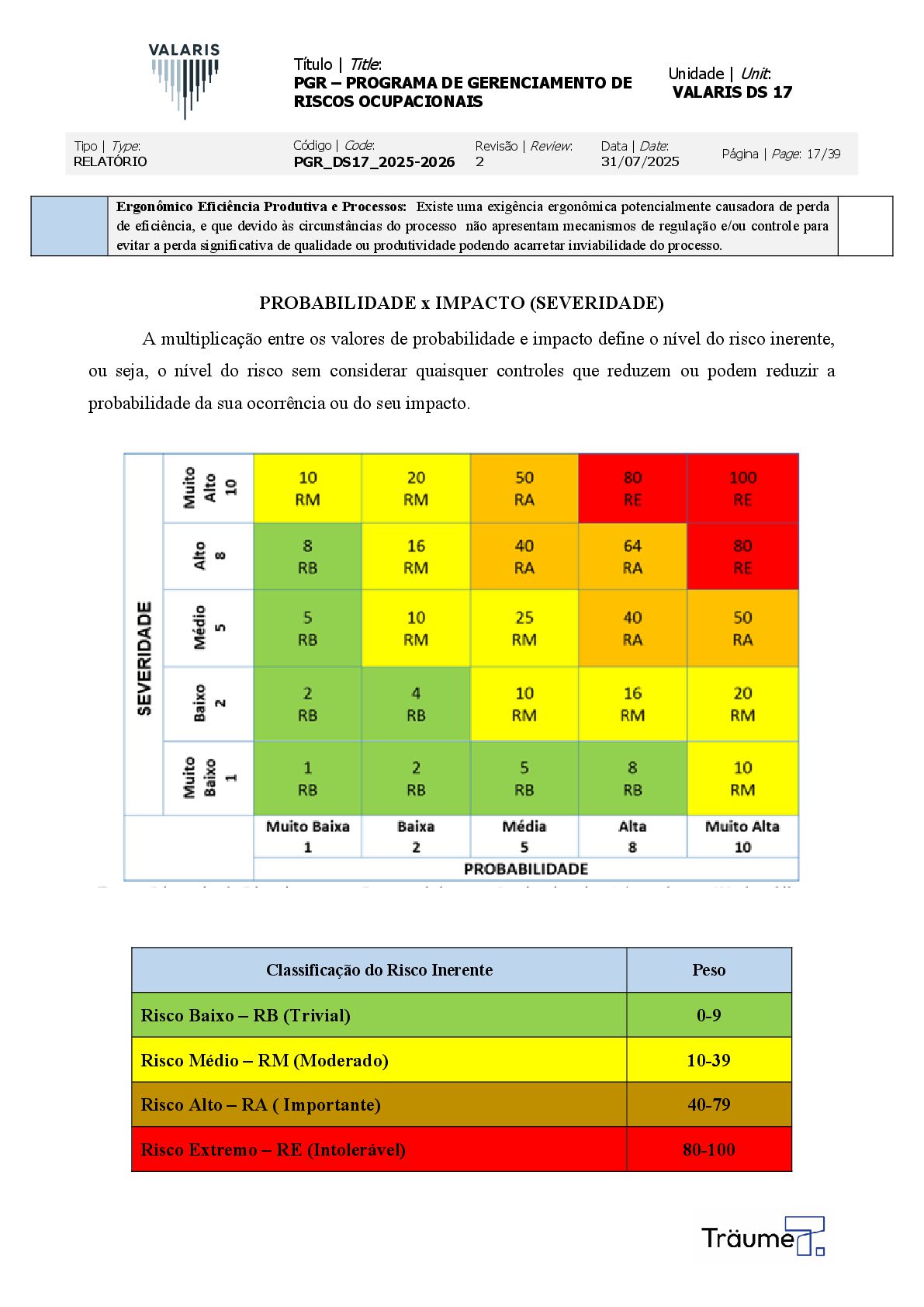 OCUPACIONAIS Unidade | Unit: VALARIS DS 17 Tipo | Type: RELATÓRIO Código | Code: PGR_DS17_2025-2026 Revisão | Review: 2 Data | Date: 31/07/2025 Página | Page: 17/39 Ergonômico Eficiência Produtiva e Processos: Existe uma exigência ergonômica potencialmente causadora de perda de eficiência, e que devido às circunstâncias do processo não apresentam mecanismos de regulação e/ou controle para evitar a perda significativa de qualidade ou produtividade podendo acarretar inviabilidade do processo. PROBABILIDADE x IMPACTO (SEVERIDADE) A multiplicação entre os valores de probabilidade e impacto define o nível do risco inerente, ou seja, o nível do risco sem considerar quaisquer controles que reduzem ou podem reduzir a probabilidade da sua ocorrência ou do seu impacto. Classificação do Risco Inerente Peso Risco Baixo – RB (Trivial) 0-9 Risco Médio – RM (Moderado) 10-39 Risco Alto – RA ( Importante) 40-79 Risco Extremo – RE (Intolerável) 80-100