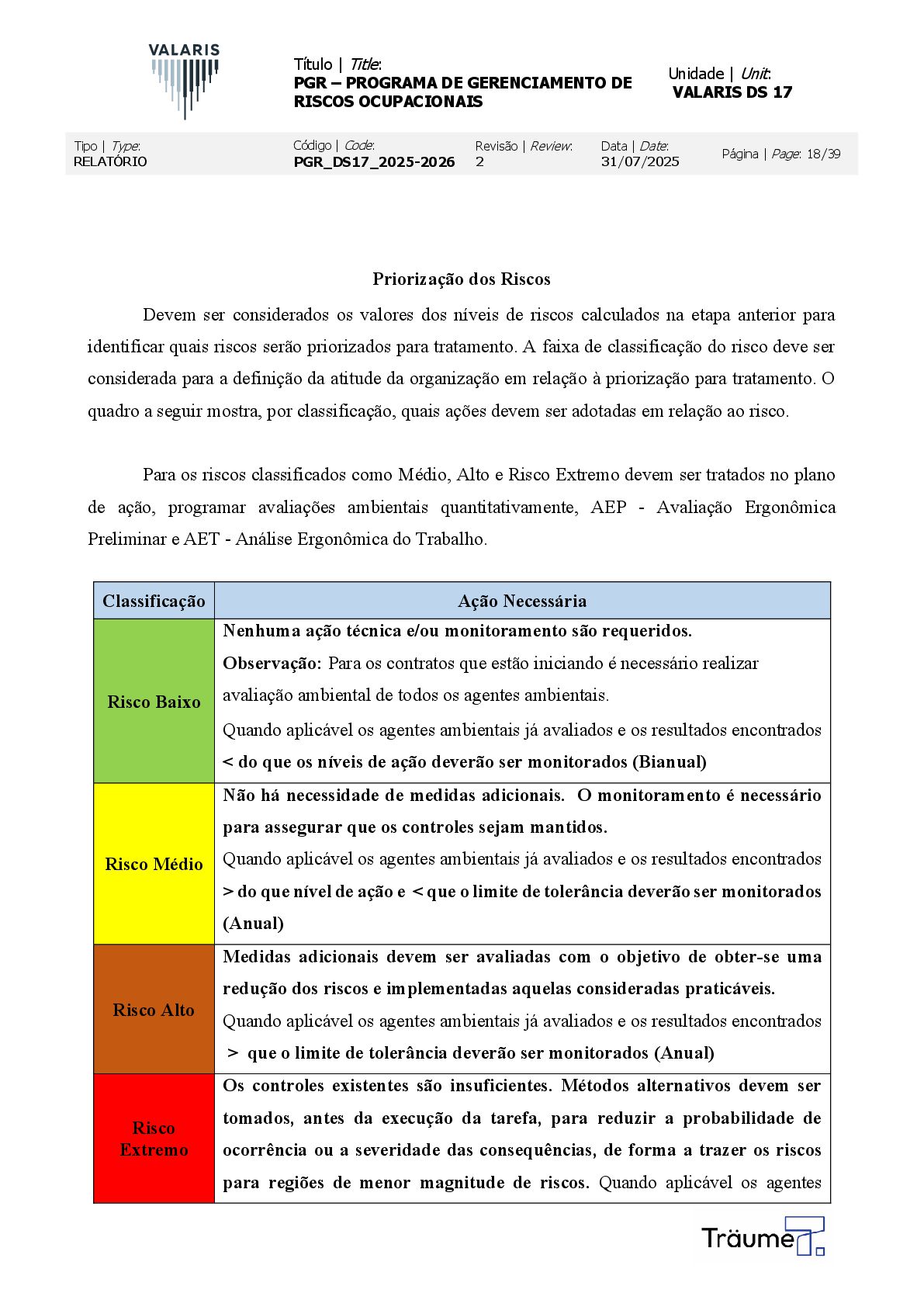 OCUPACIONAIS Unidade | Unit: VALARIS DS 17 Tipo | Type: RELATÓRIO Código | Code: PGR_DS17_2025-2026 Revisão | Review: 2 Data | Date: 31/07/2025 Página | Page: 18/39 Priorização dos Riscos Devem ser considerados os valores dos níveis de riscos calculados na etapa anterior para identificar quais riscos serão priorizados para tratamento. A faixa de classificação do risco deve ser considerada para a definição da atitude da organização em relação à priorização para tratamento. O quadro a seguir mostra, por classificação, quais ações devem ser adotadas em relação ao risco. Para os riscos classificados como Médio, Alto e Risco Extremo devem ser tratados no plano de ação, programar avaliações ambientais quantitativamente, AEP - Avaliação Ergonômica Preliminar e AET - Análise Ergonômica do Trabalho. Classificação Ação Necessária Risco Baixo Nenhuma ação técnica e/ou monitoramento são requeridos. Observação: Para os contratos que estão iniciando é necessário realizar avaliação ambiental de todos os agentes ambientais. Quando aplicável os agentes ambientais já avaliados e os resultados encontrados < do que os níveis de ação deverão ser monitorados (Bianual) Risco Médio Não há necessidade de medidas adicionais. O monitoramento é necessário para assegurar que os controles sejam mantidos. Quando aplicável os agentes ambientais já avaliados e os resultados encontrados > do que nível de ação e < que o limite de tolerância deverão ser monitorados (Anual) Risco Alto Medidas adicionais devem ser avaliadas com o objetivo de obter-se uma redução dos riscos e implementadas aquelas consideradas praticáveis. Quando aplicável os agentes ambientais já avaliados e os resultados encontrados > que o limite de tolerância deverão ser monitorados (Anual) Risco Extremo Os controles existentes são insuficientes. Métodos alternativos devem ser tomados, antes da execução da tarefa, para reduzir a probabilidade de ocorrência ou a severidade das consequências, de forma a trazer os riscos para regiões de menor magnitude de riscos. Quando aplicável os agentes