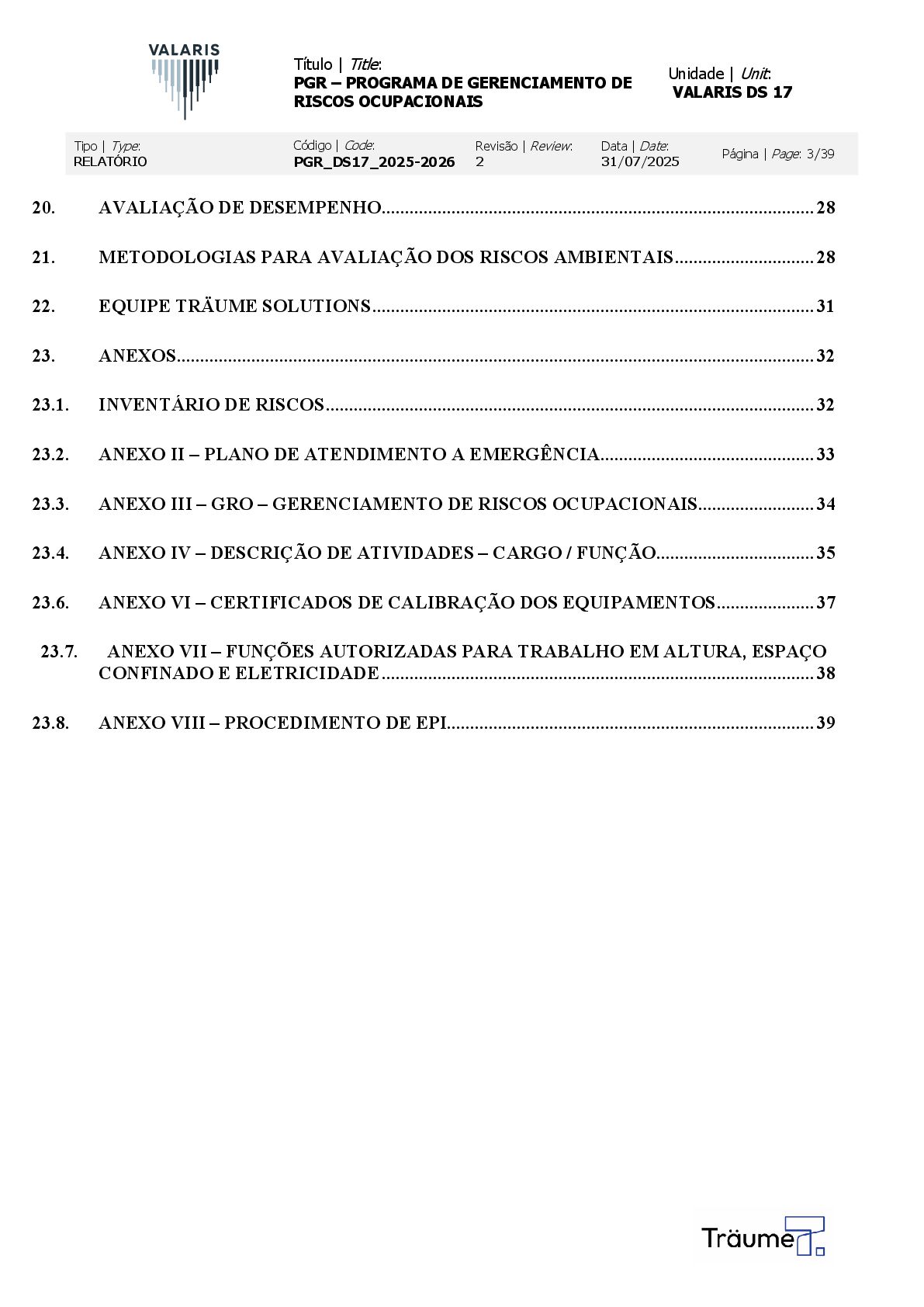 OCUPACIONAIS Unidade | Unit: VALARIS DS 17 Tipo | Type: RELATÓRIO Código | Code: PGR_DS17_2025-2026 Revisão | Review: 2 Data | Date: 31/07/2025 Página | Page: 3/39 20. AVALIAÇÃO DE DESEMPENHO ............................................................................................. 28 21. METODOLOGIAS PARA AVALIAÇÃO DOS RISCOS AMBIENTAIS .............................. 28 22. EQUIPE TRÄUME SOLUTIONS ............................................................................................... 31 23. ANEXOS ......................................................................................................................................... 32 23.1. INVENTÁRIO DE RISCOS ......................................................................................................... 32 23.2. ANEXO II – PLANO DE ATENDIMENTO A EMERGÊNCIA .............................................. 33 23.3. ANEXO III – GRO – GERENCIAMENTO DE RISCOS OCUPACIONAIS ......................... 34 23.4. ANEXO IV – DESCRIÇÃO DE ATIVIDADES – CARGO / FUNÇÃO .................................. 35 23.6. ANEXO VI – CERTIFICADOS DE CALIBRAÇÃO DOS EQUIPAMENTOS ..................... 37 23.7. ANEXO VII – FUNÇÕES AUTORIZADAS PARA TRABALHO EM ALTURA, ESPAÇO CONFINADO E ELETRICIDADE ............................................................................................. 38 23.8. ANEXO VIII – PROCEDIMENTO DE EPI............................................................................... 39