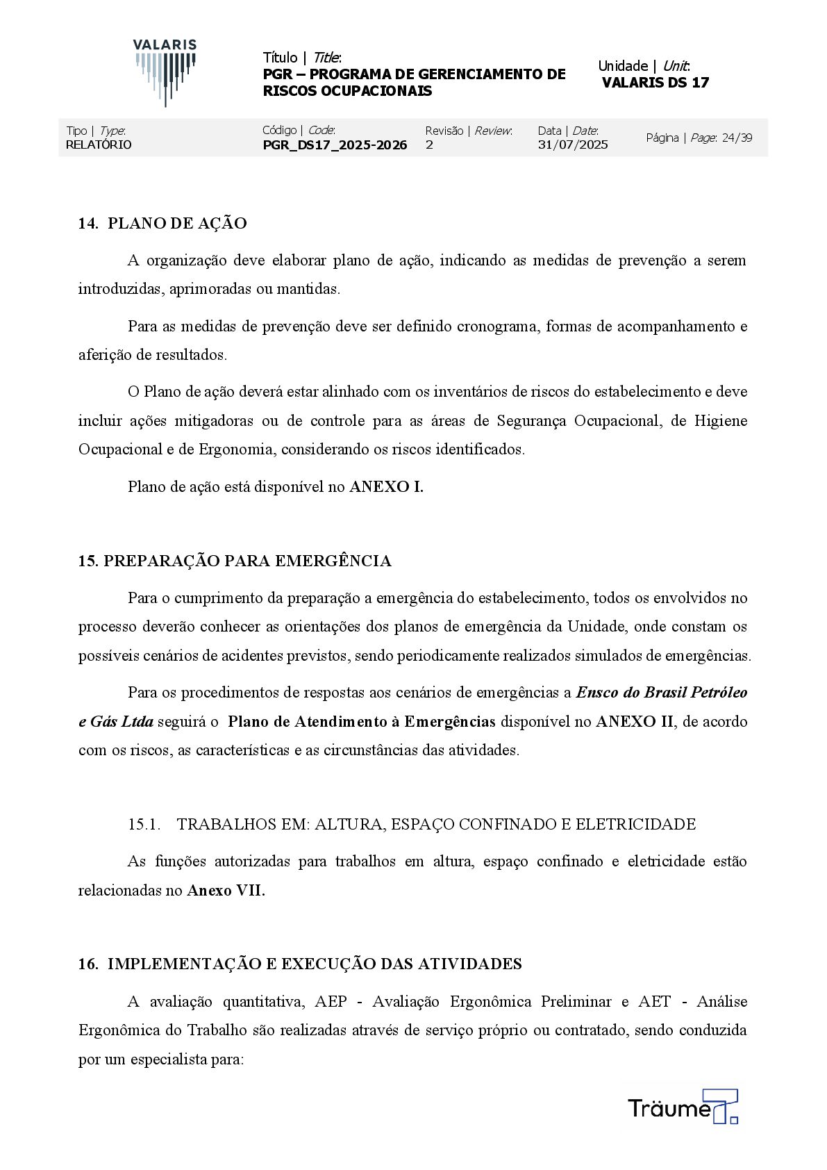 OCUPACIONAIS Unidade | Unit: VALARIS DS 17 Tipo | Type: RELATÓRIO Código | Code: PGR_DS17_2025-2026 Revisão | Review: 2 Data | Date: 31/07/2025 Página | Page: 24/39 14. PLANO DE AÇÃO A organização deve elaborar plano de ação, indicando as medidas de prevenção a serem introduzidas, aprimoradas ou mantidas. Para as medidas de prevenção deve ser definido cronograma, formas de acompanhamento e aferição de resultados. O Plano de ação deverá estar alinhado com os inventários de riscos do estabelecimento e deve incluir ações mitigadoras ou de controle para as áreas de Segurança Ocupacional, de Higiene Ocupacional e de Ergonomia, considerando os riscos identificados. Plano de ação está disponível no ANEXO I. 15. PREPARAÇÃO PARA EMERGÊNCIA Para o cumprimento da preparação a emergência do estabelecimento, todos os envolvidos no processo deverão conhecer as orientações dos planos de emergência da Unidade, onde constam os possíveis cenários de acidentes previstos, sendo periodicamente realizados simulados de emergências. Para os procedimentos de respostas aos cenários de emergências a Ensco do Brasil Petróleo e Gás Ltda seguirá o Plano de Atendimento à Emergências disponível no ANEXO II, de acordo com os riscos, as características e as circunstâncias das atividades. 15.1. TRABALHOS EM: ALTURA, ESPAÇO CONFINADO E ELETRICIDADE As funções autorizadas para trabalhos em altura, espaço confinado e eletricidade estão relacionadas no Anexo VII. 16. IMPLEMENTAÇÃO E EXECUÇÃO DAS ATIVIDADES A avaliação quantitativa, AEP - Avaliação Ergonômica Preliminar e AET - Análise Ergonômica do Trabalho são realizadas através de serviço próprio ou contratado, sendo conduzida por um especialista para: