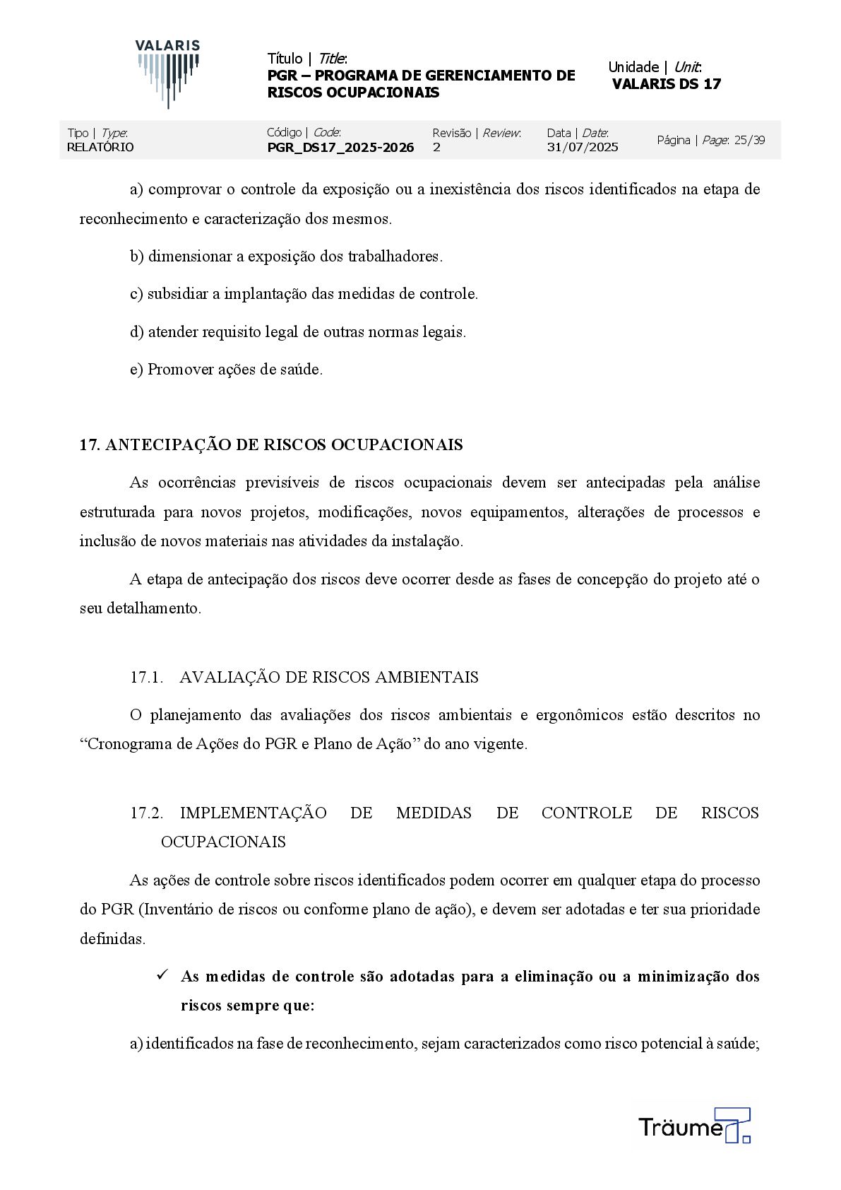 OCUPACIONAIS Unidade | Unit: VALARIS DS 17 Tipo | Type: RELATÓRIO Código | Code: PGR_DS17_2025-2026 Revisão | Review: 2 Data | Date: 31/07/2025 Página | Page: 25/39 a) comprovar o controle da exposição ou a inexistência dos riscos identificados na etapa de reconhecimento e caracterização dos mesmos. b) dimensionar a exposição dos trabalhadores. c) subsidiar a implantação das medidas de controle. d) atender requisito legal de outras normas legais. e) Promover ações de saúde. 17. ANTECIPAÇÃO DE RISCOS OCUPACIONAIS As ocorrências previsíveis de riscos ocupacionais devem ser antecipadas pela análise estruturada para novos projetos, modificações, novos equipamentos, alterações de processos e inclusão de novos materiais nas atividades da instalação. A etapa de antecipação dos riscos deve ocorrer desde as fases de concepção do projeto até o seu detalhamento. 17.1. AVALIAÇÃO DE RISCOS AMBIENTAIS O planejamento das avaliações dos riscos ambientais e ergonômicos estão descritos no “Cronograma de Ações do PGR e Plano de Ação” do ano vigente. 17.2. IMPLEMENTAÇÃO DE MEDIDAS DE CONTROLE DE RISCOS OCUPACIONAIS As ações de controle sobre riscos identificados podem ocorrer em qualquer etapa do processo do PGR (Inventário de riscos ou conforme plano de ação), e devem ser adotadas e ter sua prioridade definidas. ✓ As medidas de controle são adotadas para a eliminação ou a minimização dos riscos sempre que: a) identificados na fase de reconhecimento, sejam caracterizados como risco potencial à saúde;