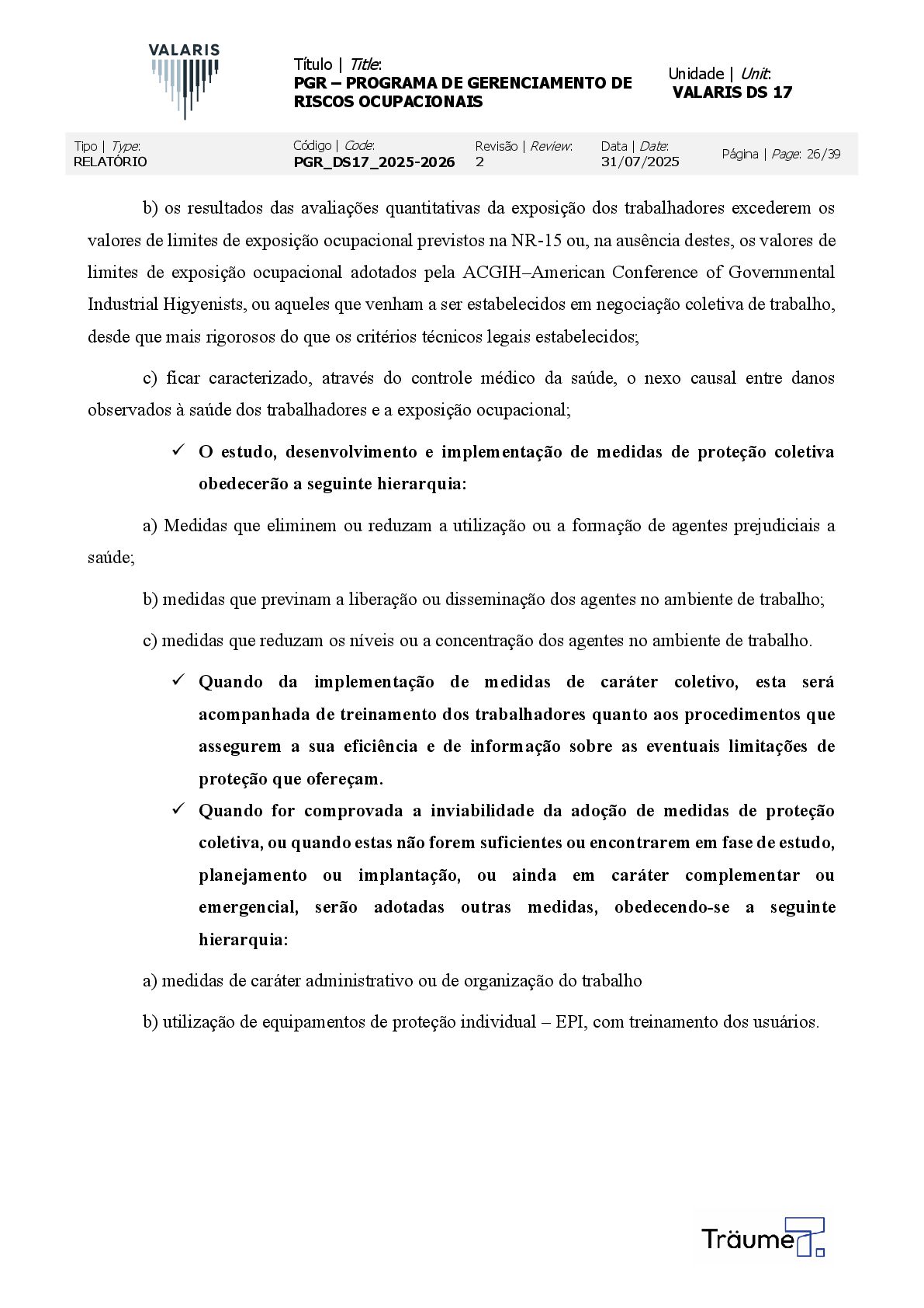 OCUPACIONAIS Unidade | Unit: VALARIS DS 17 Tipo | Type: RELATÓRIO Código | Code: PGR_DS17_2025-2026 Revisão | Review: 2 Data | Date: 31/07/2025 Página | Page: 26/39 b) os resultados das avaliações quantitativas da exposição dos trabalhadores excederem os valores de limites de exposição ocupacional previstos na NR-15 ou, na ausência destes, os valores de limites de exposição ocupacional adotados pela ACGIH–American Conference of Governmental Industrial Higyenists, ou aqueles que venham a ser estabelecidos em negociação coletiva de trabalho, desde que mais rigorosos do que os critérios técnicos legais estabelecidos; c) ficar caracterizado, através do controle médico da saúde, o nexo causal entre danos observados à saúde dos trabalhadores e a exposição ocupacional; ✓ O estudo, desenvolvimento e implementação de medidas de proteção coletiva obedecerão a seguinte hierarquia: a) Medidas que eliminem ou reduzam a utilização ou a formação de agentes prejudiciais a saúde; b) medidas que previnam a liberação ou disseminação dos agentes no ambiente de trabalho; c) medidas que reduzam os níveis ou a concentração dos agentes no ambiente de trabalho. ✓ Quando da implementação de medidas de caráter coletivo, esta será acompanhada de treinamento dos trabalhadores quanto aos procedimentos que assegurem a sua eficiência e de informação sobre as eventuais limitações de proteção que ofereçam. ✓ Quando for comprovada a inviabilidade da adoção de medidas de proteção coletiva, ou quando estas não forem suficientes ou encontrarem em fase de estudo, planejamento ou implantação, ou ainda em caráter complementar ou emergencial, serão adotadas outras medidas, obedecendo-se a seguinte hierarquia: a) medidas de caráter administrativo ou de organização do trabalho b) utilização de equipamentos de proteção individual – EPI, com treinamento dos usuários.