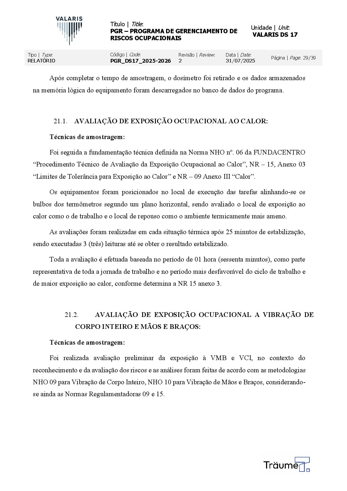 OCUPACIONAIS Unidade | Unit: VALARIS DS 17 Tipo | Type: RELATÓRIO Código | Code: PGR_DS17_2025-2026 Revisão | Review: 2 Data | Date: 31/07/2025 Página | Page: 29/39 Após completar o tempo de amostragem, o dosímetro foi retirado e os dados armazenados na memória lógica do equipamento foram descarregados no banco de dados do programa. 21.1. AVALIAÇÃO DE EXPOSIÇÃO OCUPACIONAL AO CALOR: Técnicas de amostragem: Foi seguida a fundamentação técnica definida na Norma NHO nº. 06 da FUNDACENTRO “Procedimento Técnico de Avaliação da Exposição Ocupacional ao Calor”, NR – 15, Anexo 03 “Limites de Tolerância para Exposição ao Calor” e NR – 09 Anexo III “Calor”. Os equipamentos foram posicionados no local de execução das tarefas alinhando-se os bulbos dos termômetros segundo um plano horizontal, sendo avaliado o local de exposição ao calor como o de trabalho e o local de repouso como o ambiente termicamente mais ameno. As avaliações foram realizadas em cada situação térmica após 25 minutos de estabilização, sendo executadas 3 (três) leituras até se obter o resultado estabilizado. Toda a avaliação é efetuada baseada no período de 01 hora (sessenta minutos), como parte representativa de toda a jornada de trabalho e no período mais desfavorável do ciclo de trabalho e de maior exposição ao calor, conforme determina a NR 15 anexo 3. 21.2. AVALIAÇÃO DE EXPOSIÇÃO OCUPACIONAL A VIBRAÇÃO DE CORPO INTEIRO E MÃOS E BRAÇOS: Técnicas de amostragem: Foi realizada avaliação preliminar da exposição à VMB e VCI, no contexto do reconhecimento e da avaliação dos riscos e as análises foram feitas de acordo com as metodologias NHO 09 para Vibração de Corpo Inteiro, NHO 10 para Vibração de Mãos e Braços, considerando- se ainda as Normas Regulamentadoras 09 e 15.