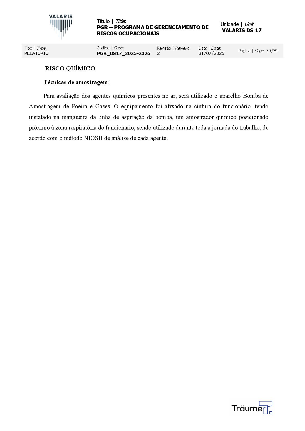 OCUPACIONAIS Unidade | Unit: VALARIS DS 17 Tipo | Type: RELATÓRIO Código | Code: PGR_DS17_2025-2026 Revisão | Review: 2 Data | Date: 31/07/2025 Página | Page: 30/39 RISCO QUÍMICO Técnicas de amostragem: Para avaliação dos agentes químicos presentes no ar, será utilizado o aparelho Bomba de Amostragem de Poeira e Gases. O equipamento foi afixado na cintura do funcionário, tendo instalado na mangueira da linha de aspiração da bomba, um amostrador químico posicionado próximo à zona respiratória do funcionário, sendo utilizado durante toda a jornada do trabalho, de acordo com o método NIOSH de análise de cada agente.