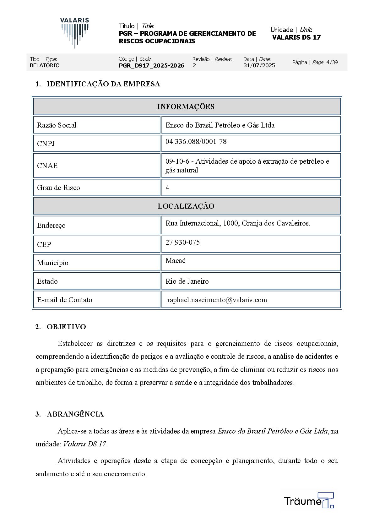 OCUPACIONAIS Unidade | Unit: VALARIS DS 17 Tipo | Type: RELATÓRIO Código | Code: PGR_DS17_2025-2026 Revisão | Review: 2 Data | Date: 31/07/2025 Página | Page: 4/39 1. IDENTIFICAÇÃO DA EMPRESA INFORMAÇÕES Razão Social Ensco do Brasil Petróleo e Gás Ltda CNPJ 04.336.088/0001-78 CNAE 09-10-6 - Atividades de apoio à extração de petróleo e gás natural Grau de Risco 4 LOCALIZAÇÃO Endereço Rua Internacional, 1000, Granja dos Cavaleiros. CEP 27.930-075 Município Macaé Estado Rio de Janeiro E-mail de Contato [email protected] 2. OBJETIVO Estabelecer as diretrizes e os requisitos para o gerenciamento de riscos ocupacionais, compreendendo a identificação de perigos e a avaliação e controle de riscos, a análise de acidentes e a preparação para emergências e as medidas de prevenção, a fim de eliminar ou reduzir os riscos nos ambientes de trabalho, de forma a preservar a saúde e a integridade dos trabalhadores. 3. ABRANGÊNCIA Aplica-se a todas as áreas e às atividades da empresa Ensco do Brasil Petróleo e Gás Ltda, na unidade: Valaris DS 17. Atividades e operações desde a etapa de concepção e planejamento, durante todo o seu andamento e até o seu encerramento.
