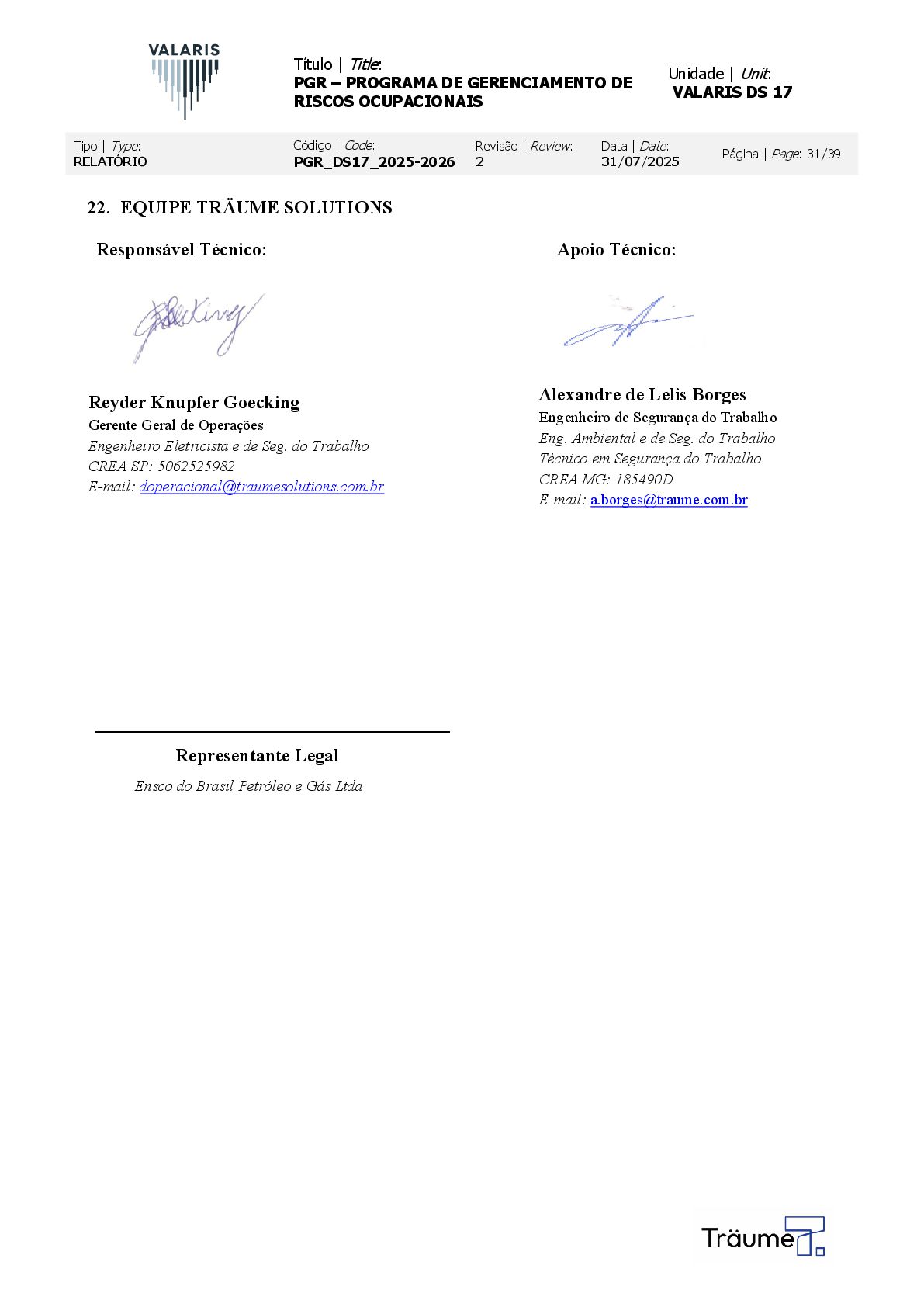 OCUPACIONAIS Unidade | Unit: VALARIS DS 17 Tipo | Type: RELATÓRIO Código | Code: PGR_DS17_2025-2026 Revisão | Review: 2 Data | Date: 31/07/2025 Página | Page: 31/39 22. EQUIPE TRÄUME SOLUTIONS Responsável Técnico: Reyder Knupfer Goecking Gerente Geral de Operações Engenheiro Eletricista e de Seg. do Trabalho CREA SP: 5062525982 E-mail: [email protected] ______________________________________ Representante Legal Ensco do Brasil Petróleo e Gás Ltda Apoio Técnico: Alexandre de Lelis Borges Engenheiro de Segurança do Trabalho Eng. Ambiental e de Seg. do Trabalho Técnico em Segurança do Trabalho CREA MG: 185490D E-mail: [email protected]