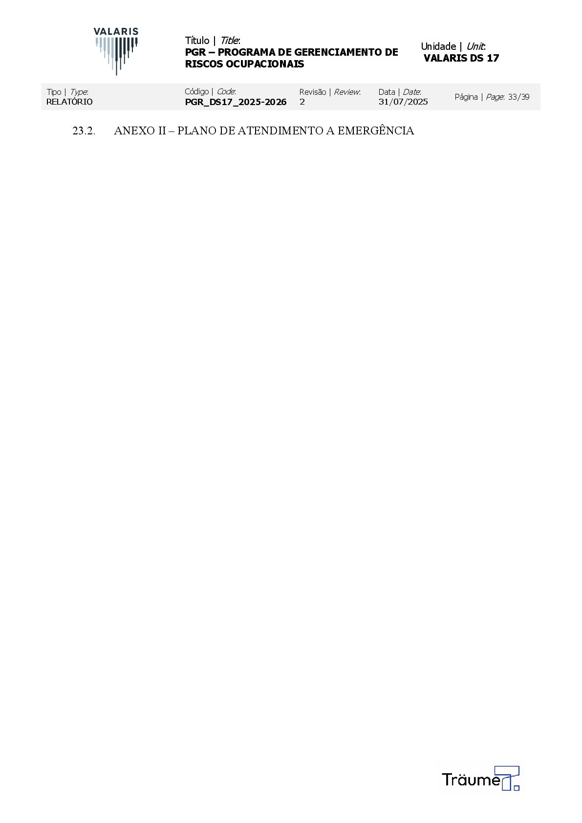 OCUPACIONAIS Unidade | Unit: VALARIS DS 17 Tipo | Type: RELATÓRIO Código | Code: PGR_DS17_2025-2026 Revisão | Review: 2 Data | Date: 31/07/2025 Página | Page: 33/39 23.2. ANEXO II – PLANO DE ATENDIMENTO A EMERGÊNCIA