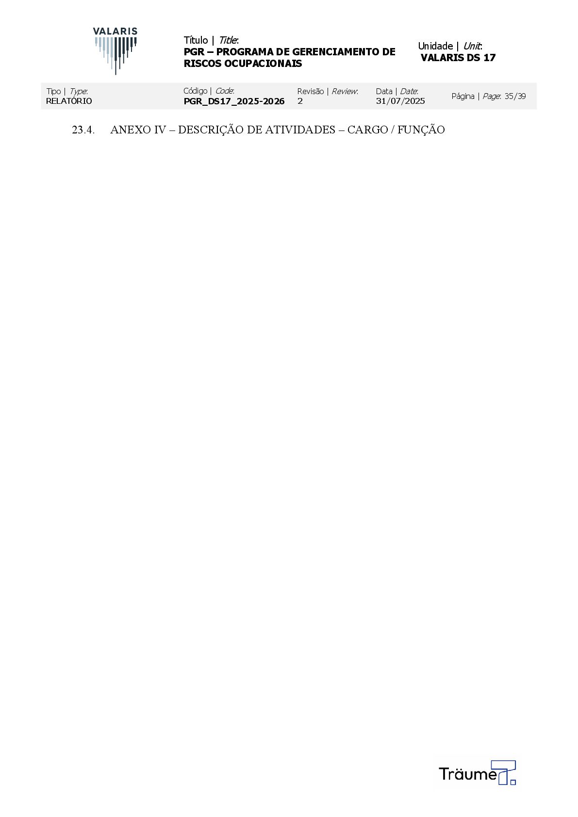 OCUPACIONAIS Unidade | Unit: VALARIS DS 17 Tipo | Type: RELATÓRIO Código | Code: PGR_DS17_2025-2026 Revisão | Review: 2 Data | Date: 31/07/2025 Página | Page: 35/39 23.4. ANEXO IV – DESCRIÇÃO DE ATIVIDADES – CARGO / FUNÇÃO