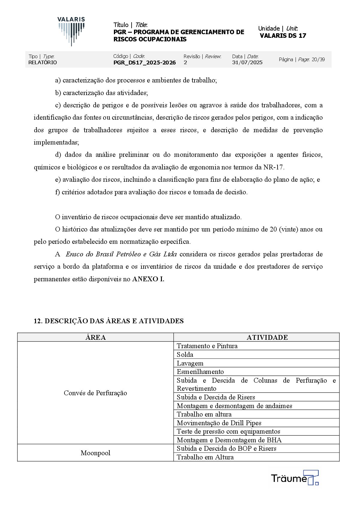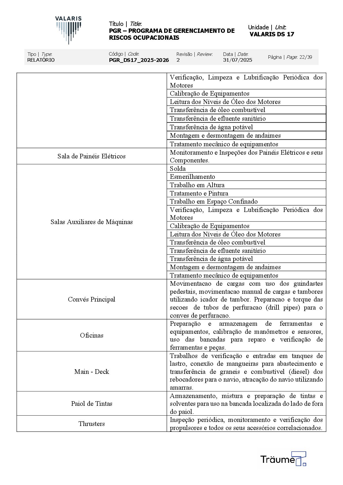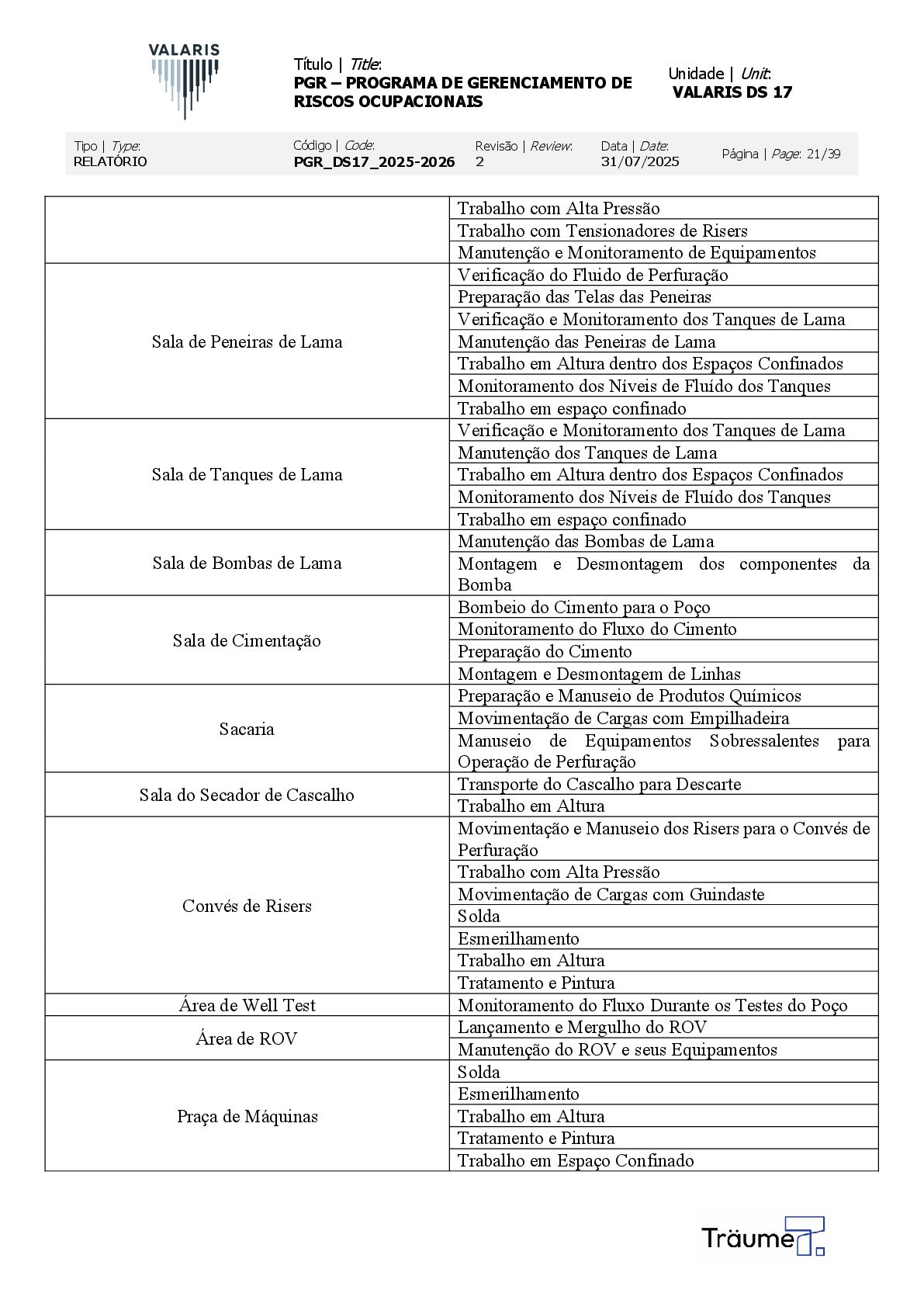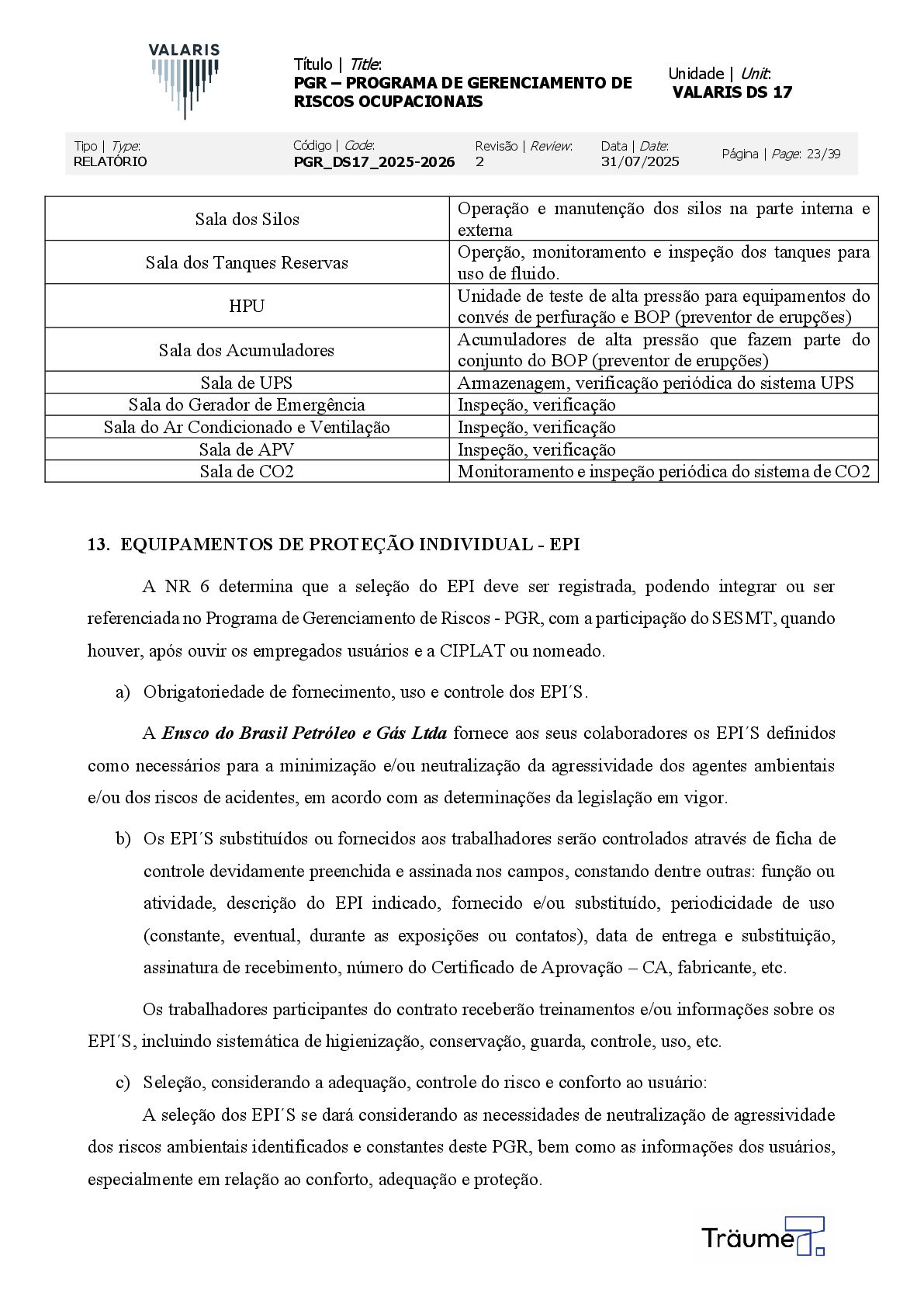 OCUPACIONAIS Unidade | Unit: VALARIS DS 17 Tipo | Type: RELATÓRIO Código | Code: PGR_DS17_2025-2026 Revisão | Review: 2 Data | Date: 31/07/2025 Página | Page: 23/39 Sala dos Silos Operação e manutenção dos silos na parte interna e externa Sala dos Tanques Reservas Operção, monitoramento e inspeção dos tanques para uso de fluido. HPU Unidade de teste de alta pressão para equipamentos do convés de perfuração e BOP (preventor de erupções) Sala dos Acumuladores Acumuladores de alta pressão que fazem parte do conjunto do BOP (preventor de erupções) Sala de UPS Armazenagem, verificação periódica do sistema UPS Sala do Gerador de Emergência Inspeção, verificação Sala do Ar Condicionado e Ventilação Inspeção, verificação Sala de APV Inspeção, verificação Sala de CO2 Monitoramento e inspeção periódica do sistema de CO2 13. EQUIPAMENTOS DE PROTEÇÃO INDIVIDUAL - EPI A NR 6 determina que a seleção do EPI deve ser registrada, podendo integrar ou ser referenciada no Programa de Gerenciamento de Riscos - PGR, com a participação do SESMT, quando houver, após ouvir os empregados usuários e a CIPLAT ou nomeado. a) Obrigatoriedade de fornecimento, uso e controle dos EPI´S. A Ensco do Brasil Petróleo e Gás Ltda fornece aos seus colaboradores os EPI´S definidos como necessários para a minimização e/ou neutralização da agressividade dos agentes ambientais e/ou dos riscos de acidentes, em acordo com as determinações da legislação em vigor. b) Os EPI´S substituídos ou fornecidos aos trabalhadores serão controlados através de ficha de controle devidamente preenchida e assinada nos campos, constando dentre outras: função ou atividade, descrição do EPI indicado, fornecido e/ou substituído, periodicidade de uso (constante, eventual, durante as exposições ou contatos), data de entrega e substituição, assinatura de recebimento, número do Certificado de Aprovação – CA, fabricante, etc. Os trabalhadores participantes do contrato receberão treinamentos e/ou informações sobre os EPI´S, incluindo sistemática de higienização, conservação, guarda, controle, uso, etc. c) Seleção, considerando a adequação, controle do risco e conforto ao usuário: A seleção dos EPI´S se dará considerando as necessidades de neutralização de agressividade dos riscos ambientais identificados e constantes deste PGR, bem como as informações dos usuários, especialmente em relação ao conforto, adequação e proteção.
