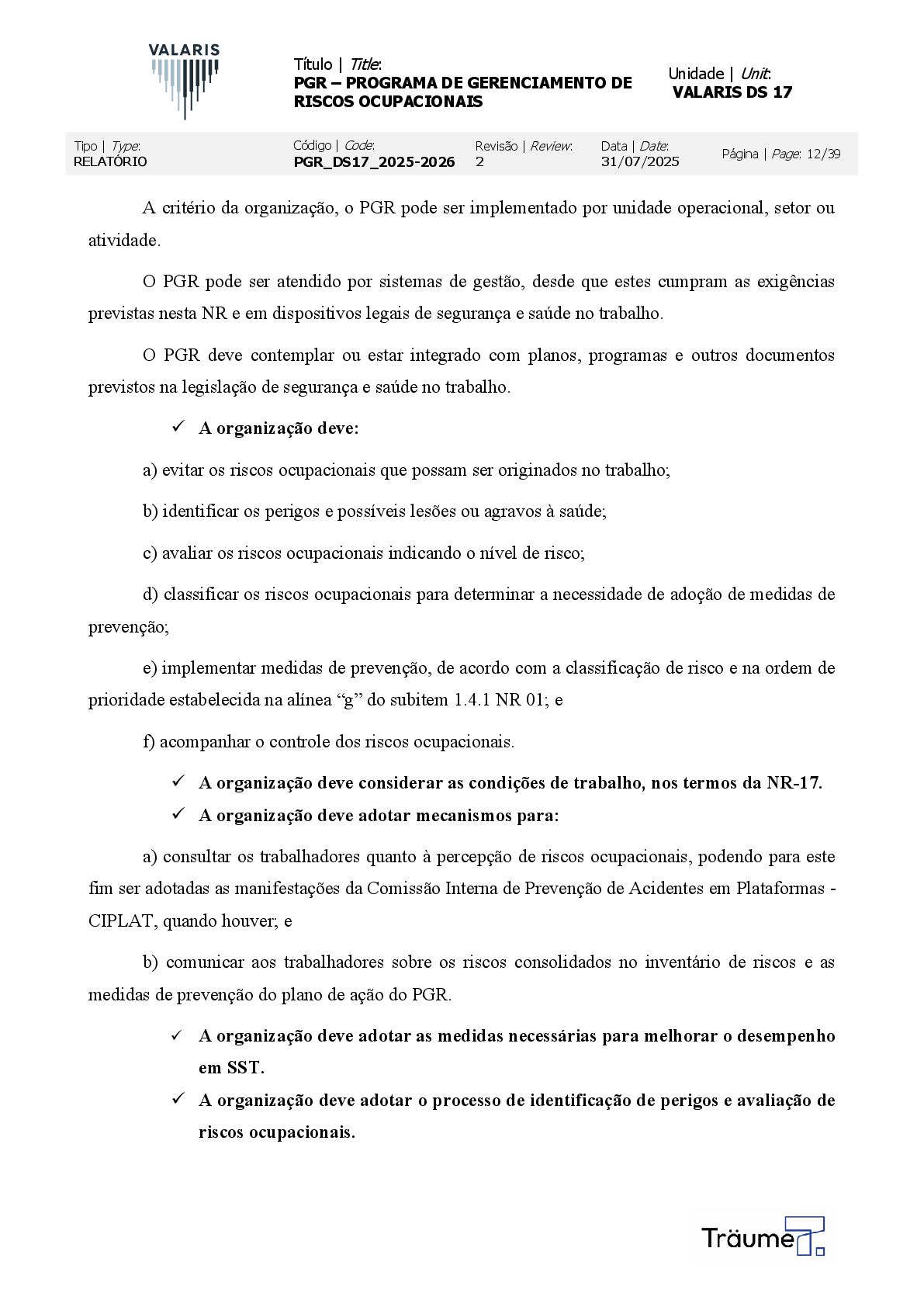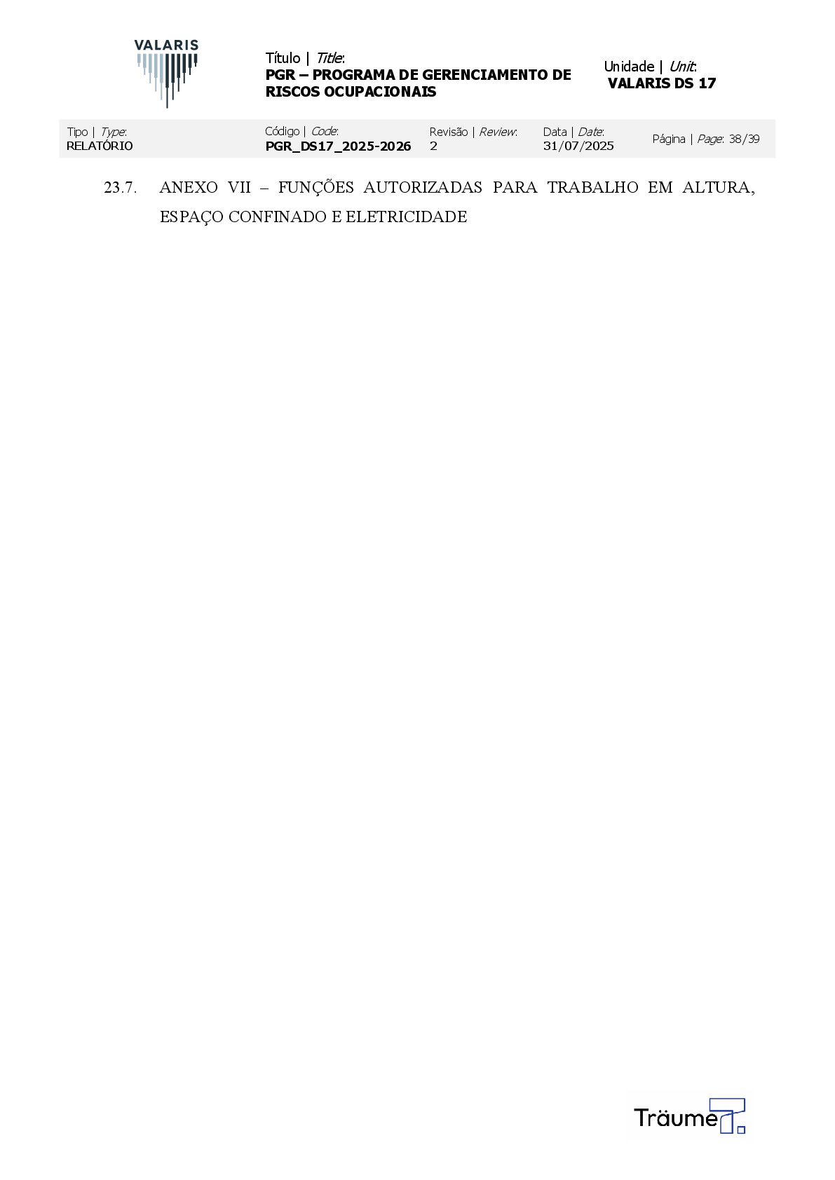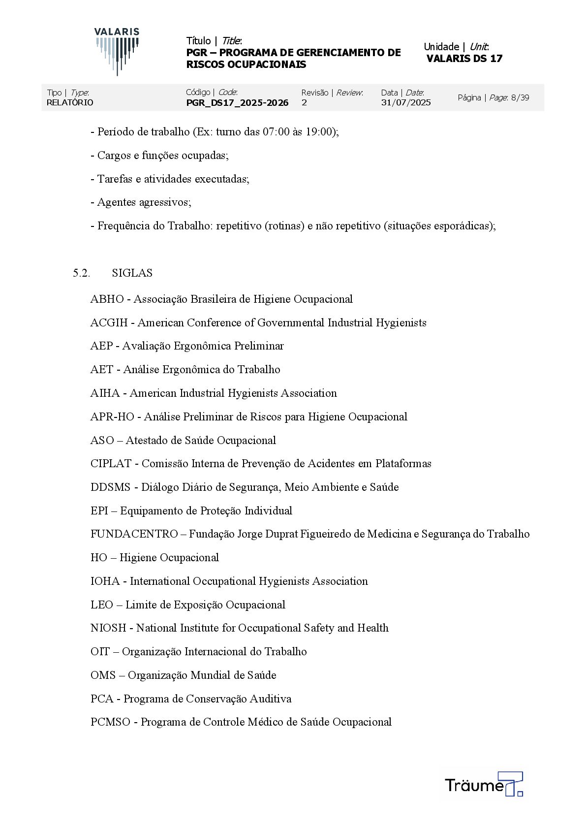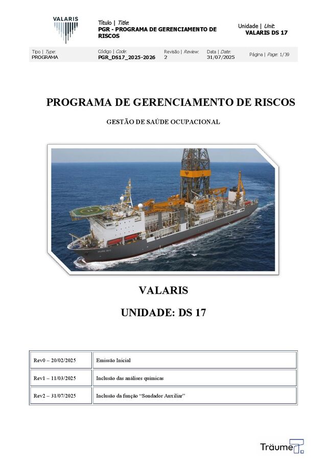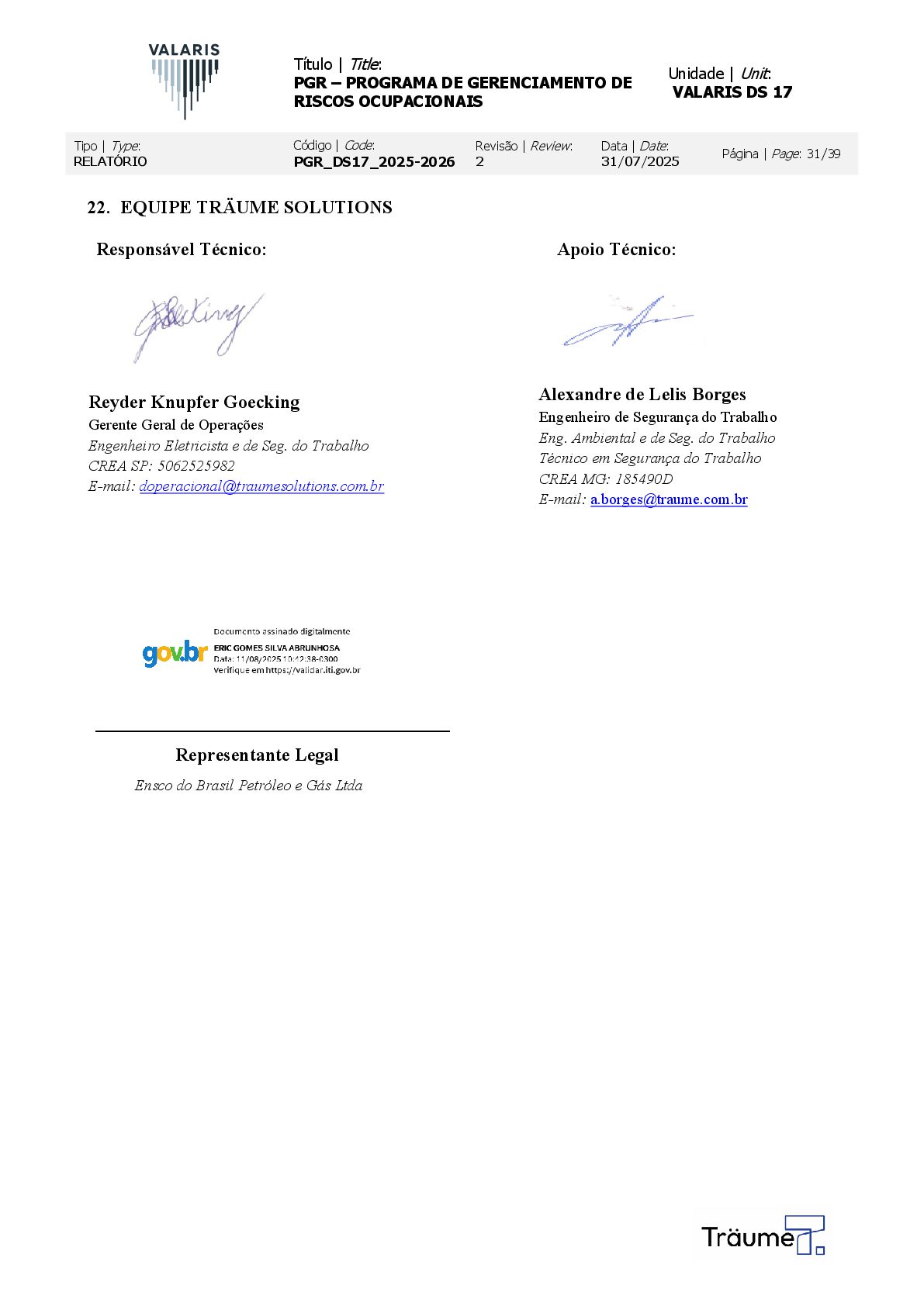 OCUPACIONAIS Unidade | Unit: VALARIS DS 17 Tipo | Type: RELATÓRIO Código | Code: PGR_DS17_2025-2026 Revisão | Review: 2 Data | Date: 31/07/2025 Página | Page: 23/39 Sala dos Silos Operação e manutenção dos silos na parte interna e externa Sala dos Tanques Reservas Operção, monitoramento e inspeção dos tanques para uso de fluido. HPU Unidade de teste de alta pressão para equipamentos do convés de perfuração e BOP (preventor de erupções) Sala dos Acumuladores Acumuladores de alta pressão que fazem parte do conjunto do BOP (preventor de erupções) Sala de UPS Armazenagem, verificação periódica do sistema UPS Sala do Gerador de Emergência Inspeção, verificação Sala do Ar Condicionado e Ventilação Inspeção, verificação Sala de APV Inspeção, verificação Sala de CO2 Monitoramento e inspeção periódica do sistema de CO2 13. EQUIPAMENTOS DE PROTEÇÃO INDIVIDUAL - EPI A NR 6 determina que a seleção do EPI deve ser registrada, podendo integrar ou ser referenciada no Programa de Gerenciamento de Riscos - PGR, com a participação do SESMT, quando houver, após ouvir os empregados usuários e a CIPLAT ou nomeado. a) Obrigatoriedade de fornecimento, uso e controle dos EPI´S. A Ensco do Brasil Petróleo e Gás Ltda fornece aos seus colaboradores os EPI´S definidos como necessários para a minimização e/ou neutralização da agressividade dos agentes ambientais e/ou dos riscos de acidentes, em acordo com as determinações da legislação em vigor. b) Os EPI´S substituídos ou fornecidos aos trabalhadores serão controlados através de ficha de controle devidamente preenchida e assinada nos campos, constando dentre outras: função ou atividade, descrição do EPI indicado, fornecido e/ou substituído, periodicidade de uso (constante, eventual, durante as exposições ou contatos), data de entrega e substituição, assinatura de recebimento, número do Certificado de Aprovação – CA, fabricante, etc. Os trabalhadores participantes do contrato receberão treinamentos e/ou informações sobre os EPI´S, incluindo sistemática de higienização, conservação, guarda, controle, uso, etc. c) Seleção, considerando a adequação, controle do risco e conforto ao usuário: A seleção dos EPI´S se dará considerando as necessidades de neutralização de agressividade dos riscos ambientais identificados e constantes deste PGR, bem como as informações dos usuários, especialmente em relação ao conforto, adequação e proteção.