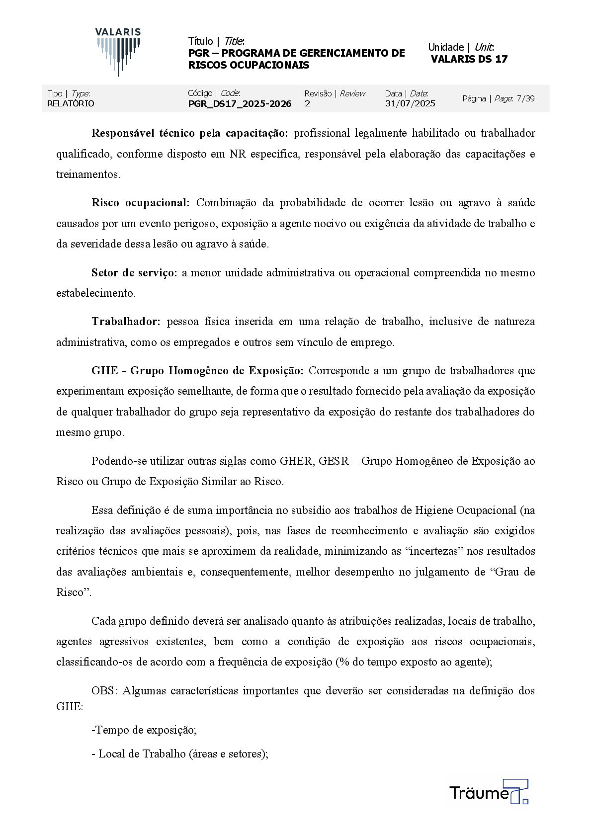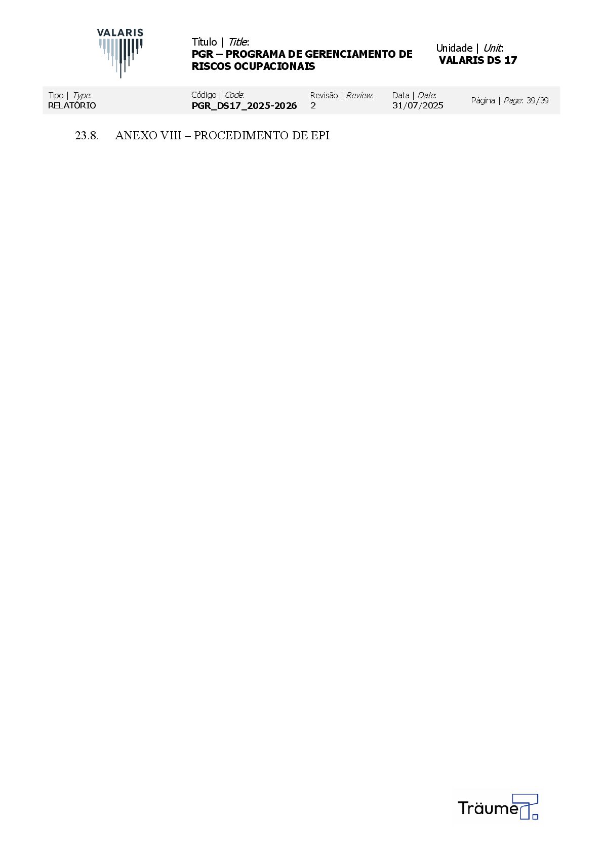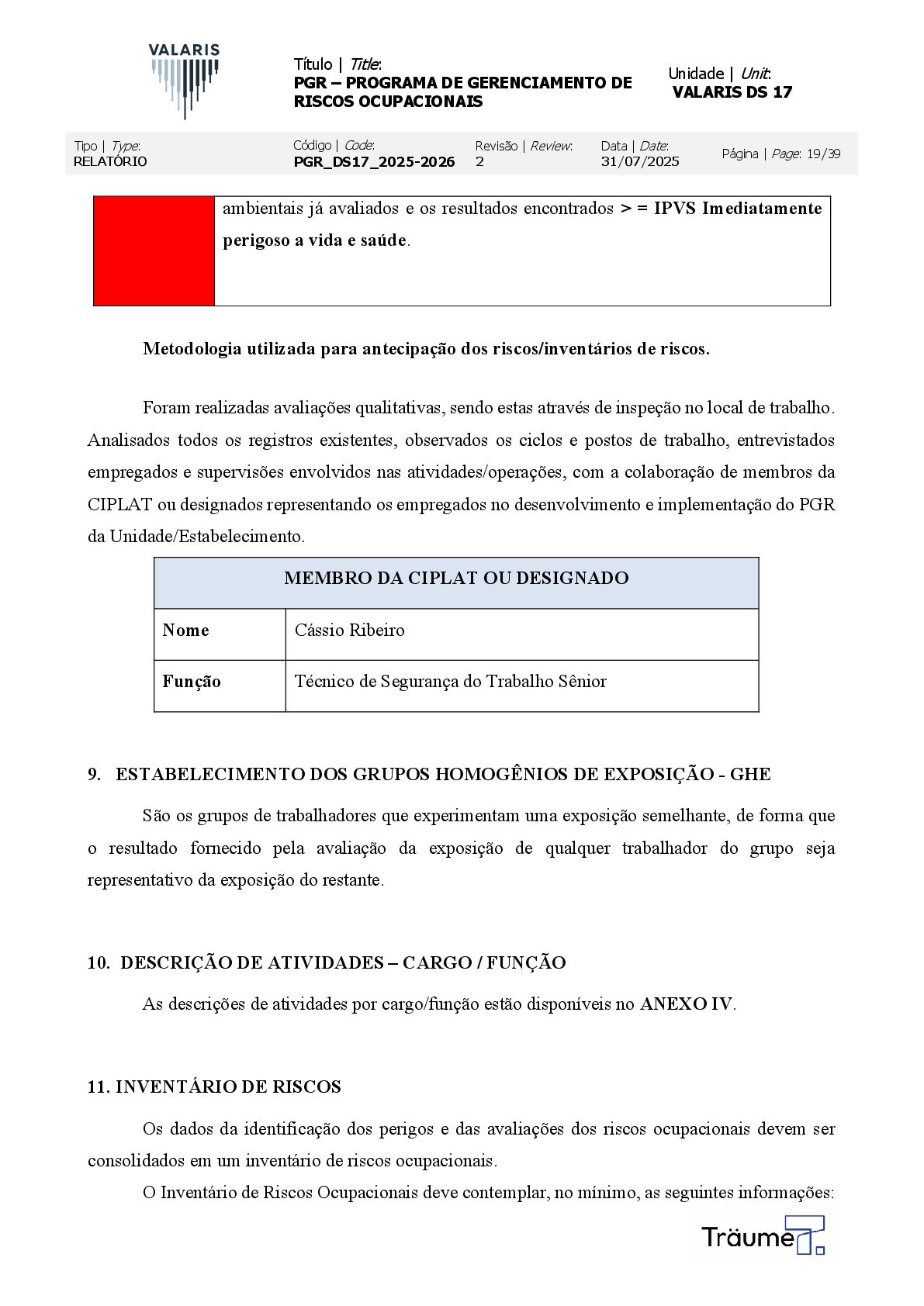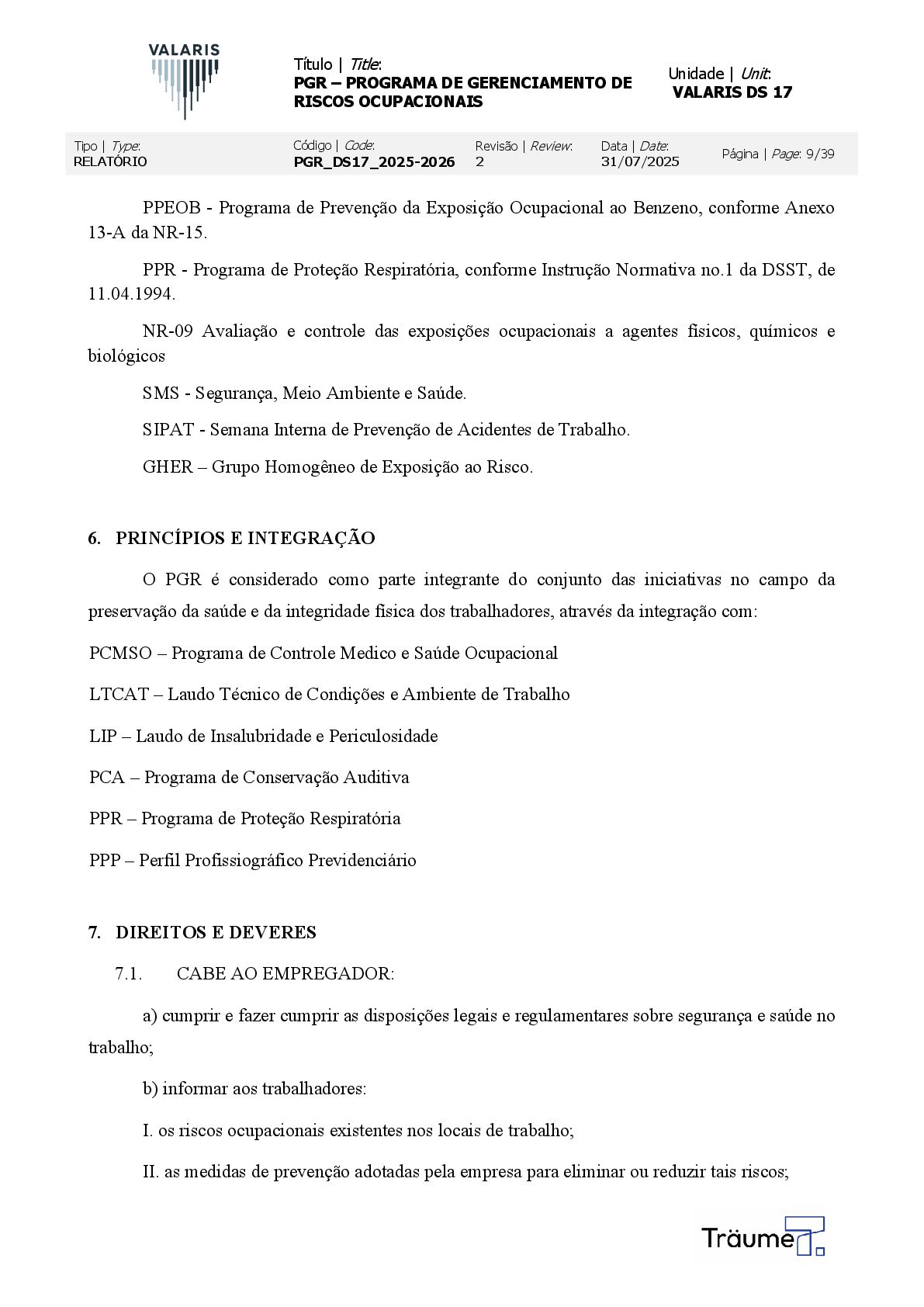 OCUPACIONAIS Unidade | Unit: VALARIS DS 17 Tipo | Type: RELATÓRIO Código | Code: PGR_DS17_2025-2026 Revisão | Review: 2 Data | Date: 31/07/2025 Página | Page: 23/39 Sala dos Silos Operação e manutenção dos silos na parte interna e externa Sala dos Tanques Reservas Operção, monitoramento e inspeção dos tanques para uso de fluido. HPU Unidade de teste de alta pressão para equipamentos do convés de perfuração e BOP (preventor de erupções) Sala dos Acumuladores Acumuladores de alta pressão que fazem parte do conjunto do BOP (preventor de erupções) Sala de UPS Armazenagem, verificação periódica do sistema UPS Sala do Gerador de Emergência Inspeção, verificação Sala do Ar Condicionado e Ventilação Inspeção, verificação Sala de APV Inspeção, verificação Sala de CO2 Monitoramento e inspeção periódica do sistema de CO2 13. EQUIPAMENTOS DE PROTEÇÃO INDIVIDUAL - EPI A NR 6 determina que a seleção do EPI deve ser registrada, podendo integrar ou ser referenciada no Programa de Gerenciamento de Riscos - PGR, com a participação do SESMT, quando houver, após ouvir os empregados usuários e a CIPLAT ou nomeado. a) Obrigatoriedade de fornecimento, uso e controle dos EPI´S. A Ensco do Brasil Petróleo e Gás Ltda fornece aos seus colaboradores os EPI´S definidos como necessários para a minimização e/ou neutralização da agressividade dos agentes ambientais e/ou dos riscos de acidentes, em acordo com as determinações da legislação em vigor. b) Os EPI´S substituídos ou fornecidos aos trabalhadores serão controlados através de ficha de controle devidamente preenchida e assinada nos campos, constando dentre outras: função ou atividade, descrição do EPI indicado, fornecido e/ou substituído, periodicidade de uso (constante, eventual, durante as exposições ou contatos), data de entrega e substituição, assinatura de recebimento, número do Certificado de Aprovação – CA, fabricante, etc. Os trabalhadores participantes do contrato receberão treinamentos e/ou informações sobre os EPI´S, incluindo sistemática de higienização, conservação, guarda, controle, uso, etc. c) Seleção, considerando a adequação, controle do risco e conforto ao usuário: A seleção dos EPI´S se dará considerando as necessidades de neutralização de agressividade dos riscos ambientais identificados e constantes deste PGR, bem como as informações dos usuários, especialmente em relação ao conforto, adequação e proteção.
