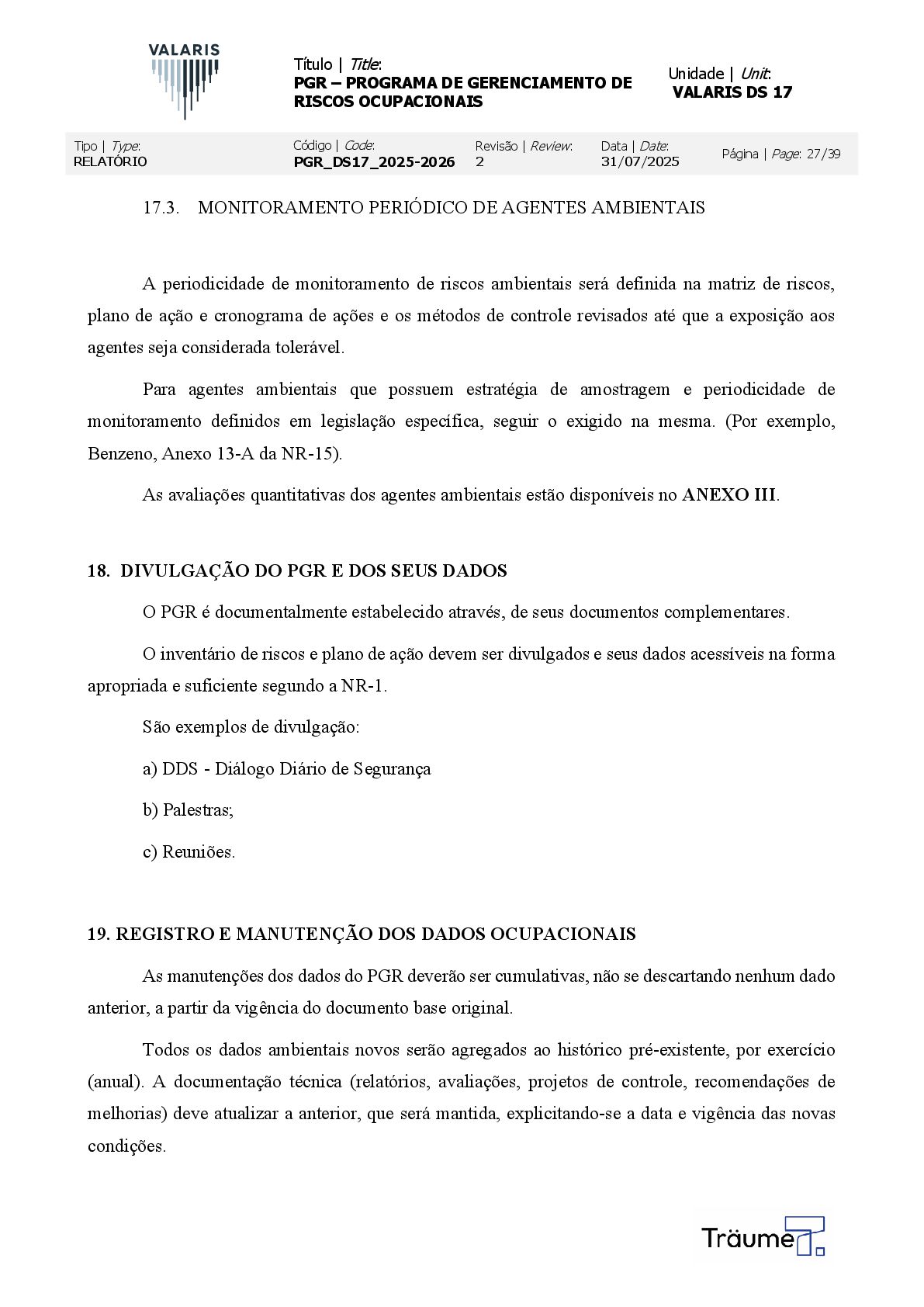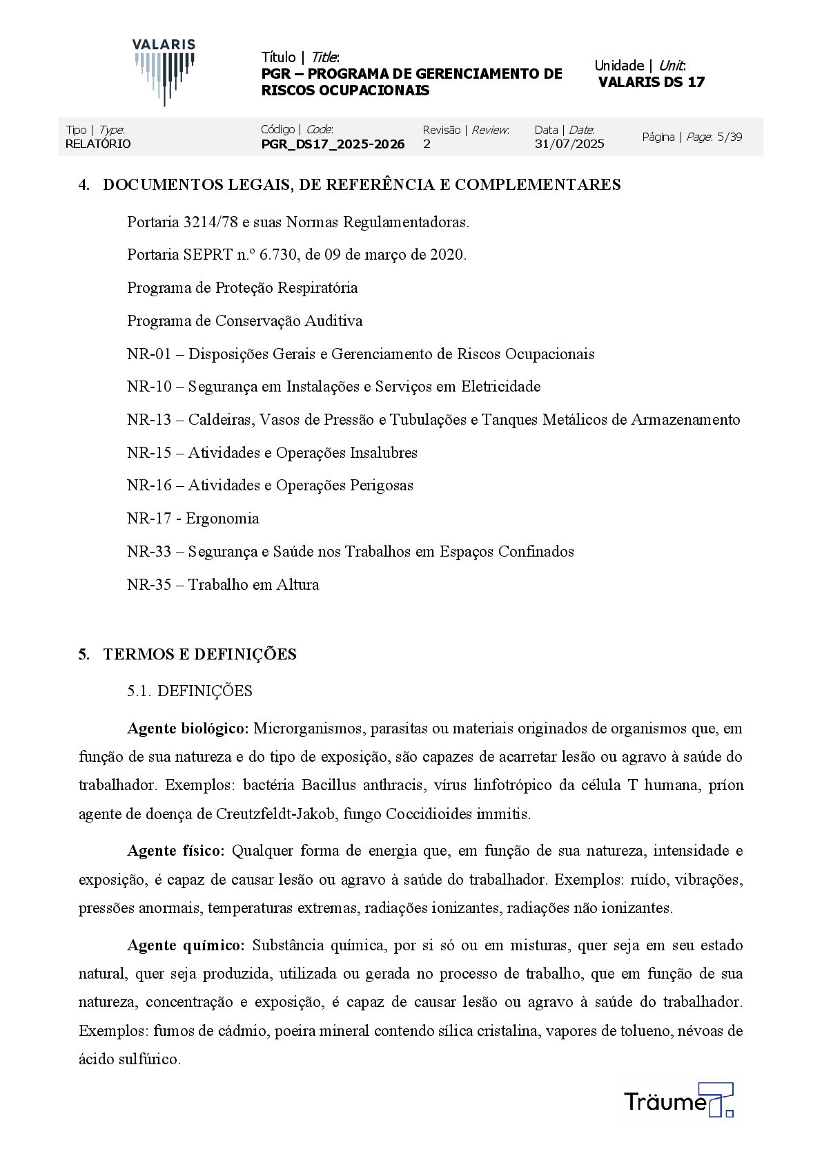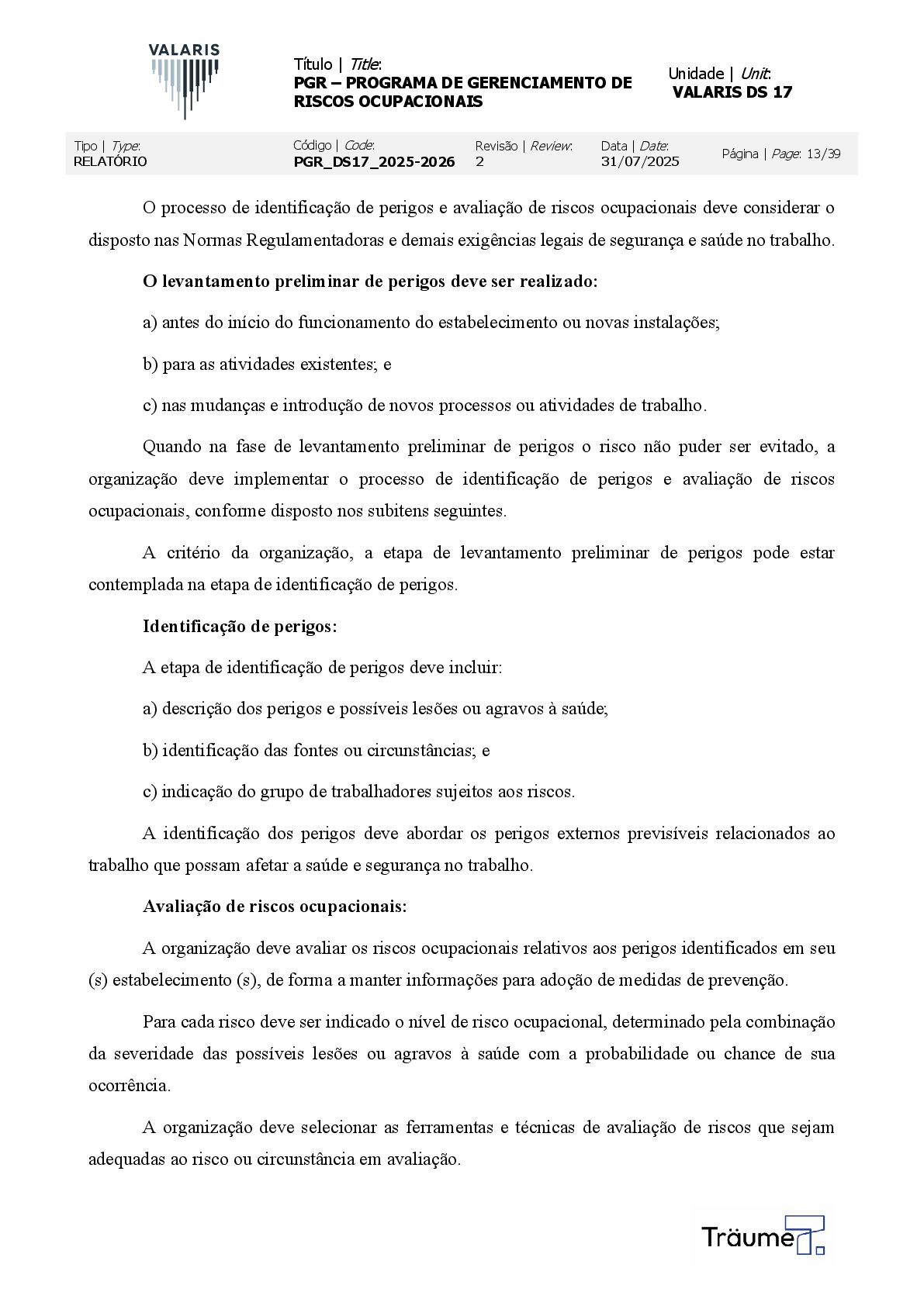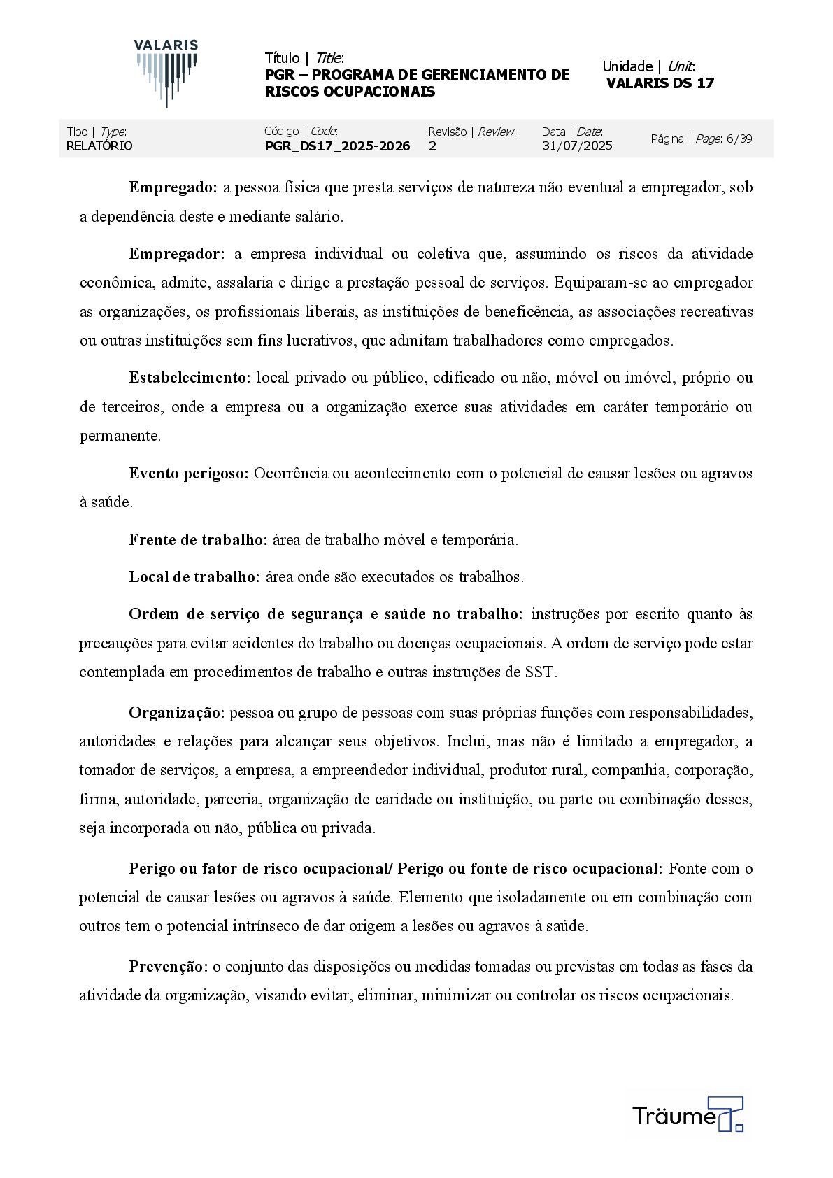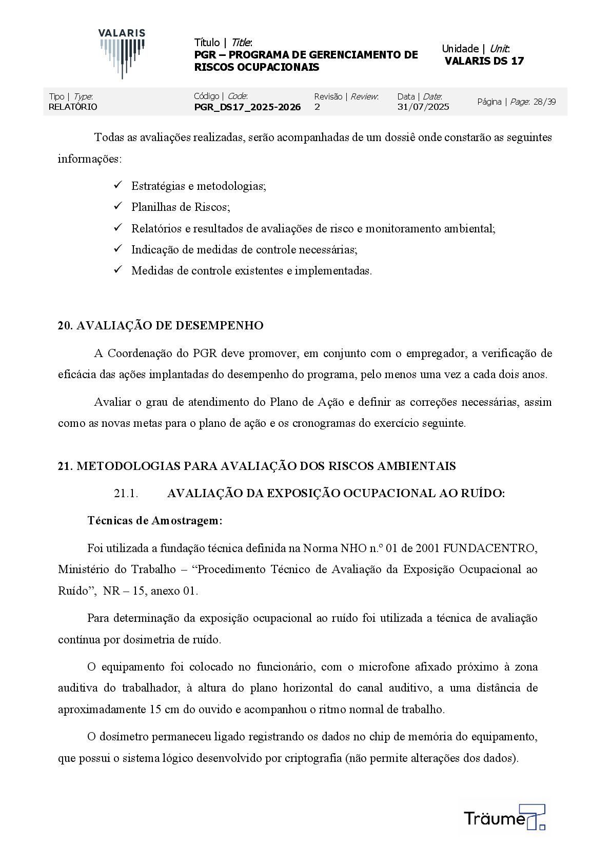 OCUPACIONAIS Unidade | Unit: VALARIS DS 17 Tipo | Type: RELATÓRIO Código | Code: PGR_DS17_2025-2026 Revisão | Review: 2 Data | Date: 31/07/2025 Página | Page: 23/39 Sala dos Silos Operação e manutenção dos silos na parte interna e externa Sala dos Tanques Reservas Operção, monitoramento e inspeção dos tanques para uso de fluido. HPU Unidade de teste de alta pressão para equipamentos do convés de perfuração e BOP (preventor de erupções) Sala dos Acumuladores Acumuladores de alta pressão que fazem parte do conjunto do BOP (preventor de erupções) Sala de UPS Armazenagem, verificação periódica do sistema UPS Sala do Gerador de Emergência Inspeção, verificação Sala do Ar Condicionado e Ventilação Inspeção, verificação Sala de APV Inspeção, verificação Sala de CO2 Monitoramento e inspeção periódica do sistema de CO2 13. EQUIPAMENTOS DE PROTEÇÃO INDIVIDUAL - EPI A NR 6 determina que a seleção do EPI deve ser registrada, podendo integrar ou ser referenciada no Programa de Gerenciamento de Riscos - PGR, com a participação do SESMT, quando houver, após ouvir os empregados usuários e a CIPLAT ou nomeado. a) Obrigatoriedade de fornecimento, uso e controle dos EPI´S. A Ensco do Brasil Petróleo e Gás Ltda fornece aos seus colaboradores os EPI´S definidos como necessários para a minimização e/ou neutralização da agressividade dos agentes ambientais e/ou dos riscos de acidentes, em acordo com as determinações da legislação em vigor. b) Os EPI´S substituídos ou fornecidos aos trabalhadores serão controlados através de ficha de controle devidamente preenchida e assinada nos campos, constando dentre outras: função ou atividade, descrição do EPI indicado, fornecido e/ou substituído, periodicidade de uso (constante, eventual, durante as exposições ou contatos), data de entrega e substituição, assinatura de recebimento, número do Certificado de Aprovação – CA, fabricante, etc. Os trabalhadores participantes do contrato receberão treinamentos e/ou informações sobre os EPI´S, incluindo sistemática de higienização, conservação, guarda, controle, uso, etc. c) Seleção, considerando a adequação, controle do risco e conforto ao usuário: A seleção dos EPI´S se dará considerando as necessidades de neutralização de agressividade dos riscos ambientais identificados e constantes deste PGR, bem como as informações dos usuários, especialmente em relação ao conforto, adequação e proteção.