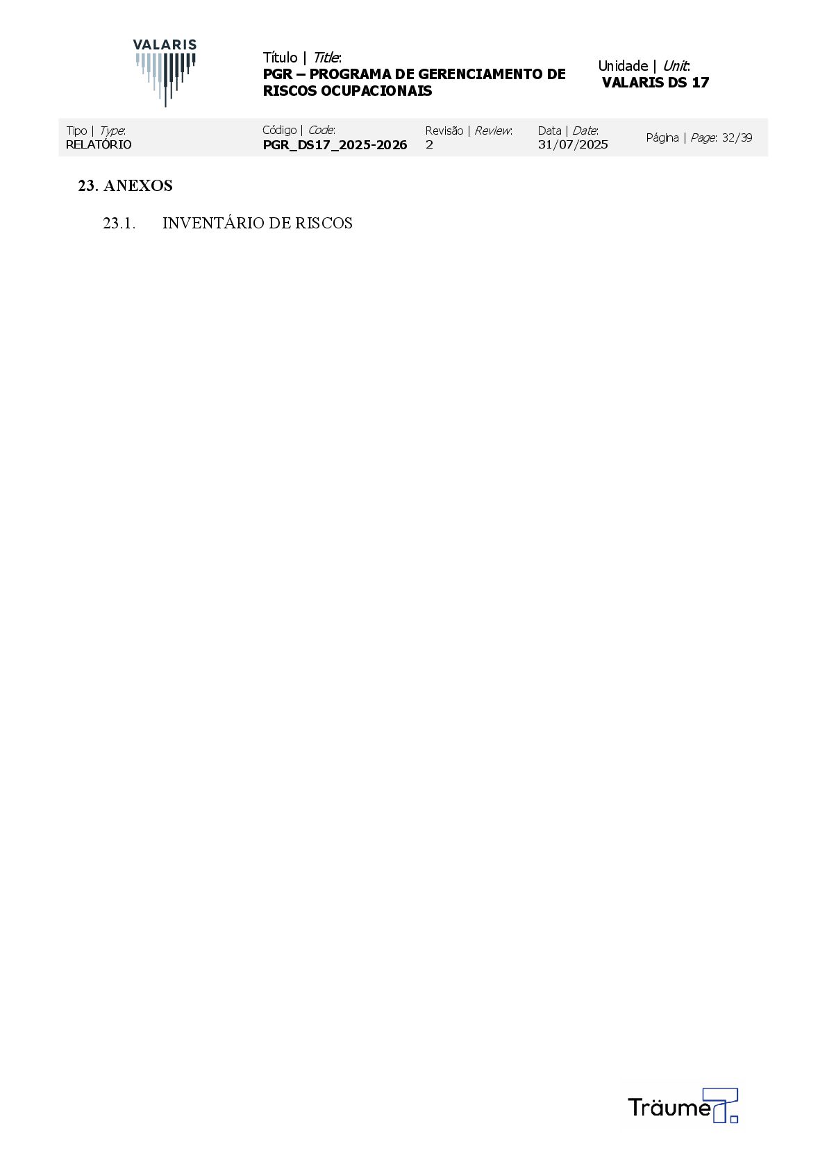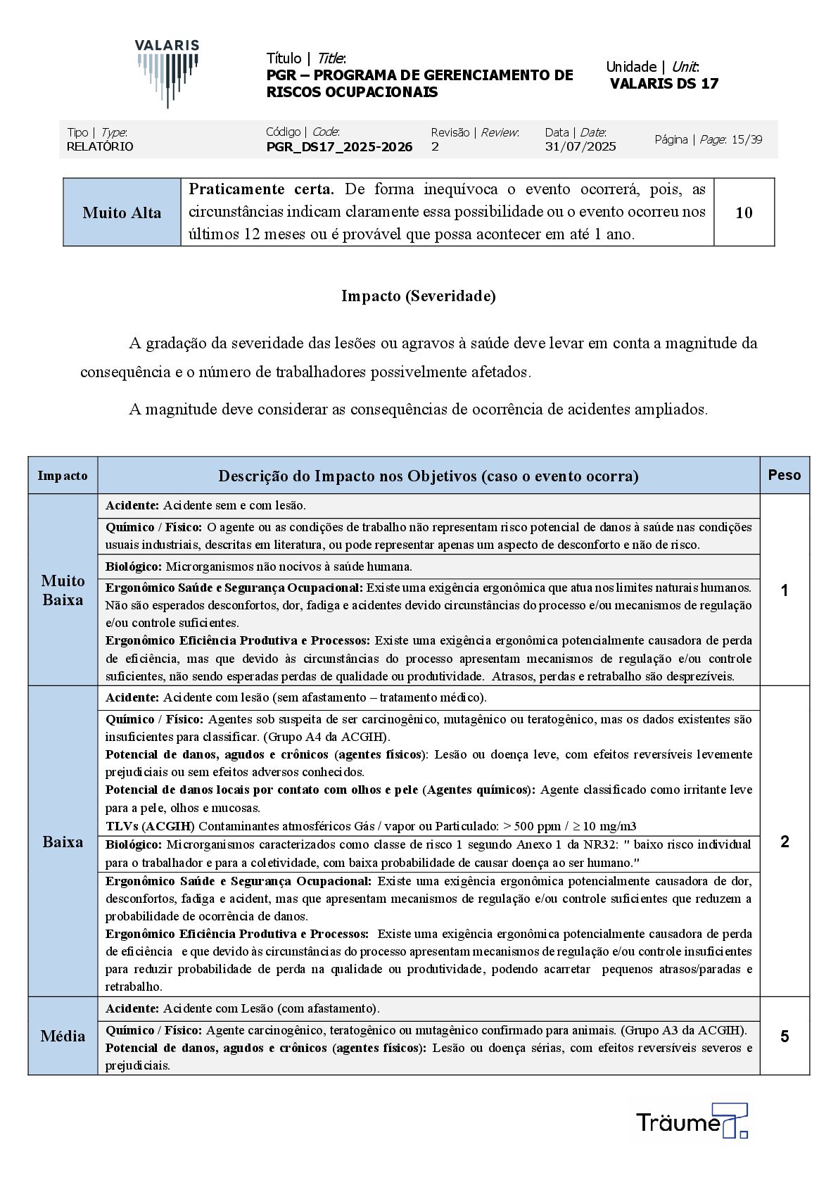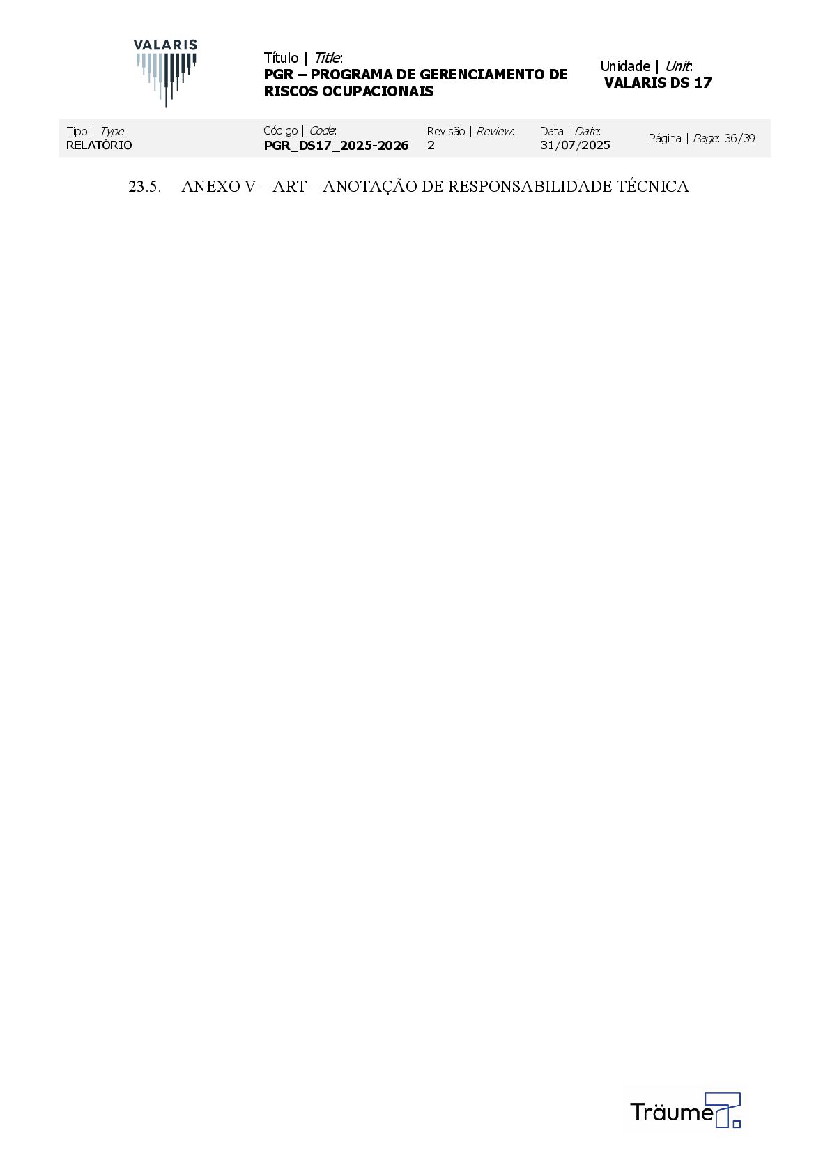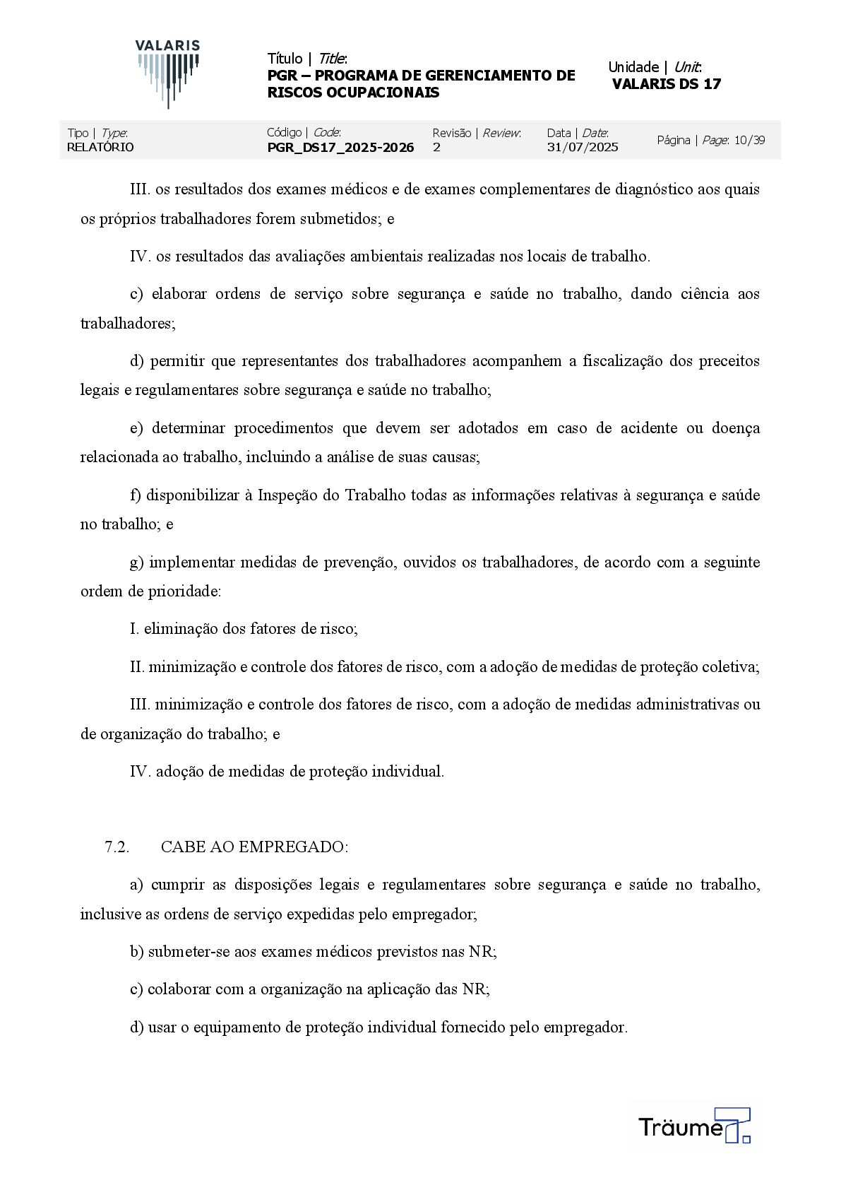 OCUPACIONAIS Unidade | Unit: VALARIS DS 17 Tipo | Type: RELATÓRIO Código | Code: PGR_DS17_2025-2026 Revisão | Review: 2 Data | Date: 31/07/2025 Página | Page: 23/39 Sala dos Silos Operação e manutenção dos silos na parte interna e externa Sala dos Tanques Reservas Operção, monitoramento e inspeção dos tanques para uso de fluido. HPU Unidade de teste de alta pressão para equipamentos do convés de perfuração e BOP (preventor de erupções) Sala dos Acumuladores Acumuladores de alta pressão que fazem parte do conjunto do BOP (preventor de erupções) Sala de UPS Armazenagem, verificação periódica do sistema UPS Sala do Gerador de Emergência Inspeção, verificação Sala do Ar Condicionado e Ventilação Inspeção, verificação Sala de APV Inspeção, verificação Sala de CO2 Monitoramento e inspeção periódica do sistema de CO2 13. EQUIPAMENTOS DE PROTEÇÃO INDIVIDUAL - EPI A NR 6 determina que a seleção do EPI deve ser registrada, podendo integrar ou ser referenciada no Programa de Gerenciamento de Riscos - PGR, com a participação do SESMT, quando houver, após ouvir os empregados usuários e a CIPLAT ou nomeado. a) Obrigatoriedade de fornecimento, uso e controle dos EPI´S. A Ensco do Brasil Petróleo e Gás Ltda fornece aos seus colaboradores os EPI´S definidos como necessários para a minimização e/ou neutralização da agressividade dos agentes ambientais e/ou dos riscos de acidentes, em acordo com as determinações da legislação em vigor. b) Os EPI´S substituídos ou fornecidos aos trabalhadores serão controlados através de ficha de controle devidamente preenchida e assinada nos campos, constando dentre outras: função ou atividade, descrição do EPI indicado, fornecido e/ou substituído, periodicidade de uso (constante, eventual, durante as exposições ou contatos), data de entrega e substituição, assinatura de recebimento, número do Certificado de Aprovação – CA, fabricante, etc. Os trabalhadores participantes do contrato receberão treinamentos e/ou informações sobre os EPI´S, incluindo sistemática de higienização, conservação, guarda, controle, uso, etc. c) Seleção, considerando a adequação, controle do risco e conforto ao usuário: A seleção dos EPI´S se dará considerando as necessidades de neutralização de agressividade dos riscos ambientais identificados e constantes deste PGR, bem como as informações dos usuários, especialmente em relação ao conforto, adequação e proteção.