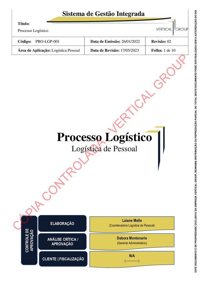 de Emissão: 26/01/2022 Revisão: 02 Área de Aplicação: Logística Pessoal Data de Revisão: 17/05/2023 Folha: 6 de 10 ESTE DOCUMENTO É DE PROPRIEDADE EXCLUSIVA DA EMPRESA VERTICAL GROUP, NENHUMA DISTRIBUIÇÃO OU REPRODUÇÃO PARCIAL OU TOTAL DESTE DOCUMENTO PODE SER REALIZADA SEM A AUTORIZAÇÃO DO SGI 6 - DETALHAMENTO 6.1 - PROCEDIMENTOS OPERACIONAIS PARA EMBARQUE Através do Sistema DRAKE e/ou via e-mail, com antecedência mínima de 05 (cinco) dias do embarque e/ou check-in no Hotel. Os embarques são programados, conforme requisição da área de Projetos. Os setores responsáveis enviam para a Logística a equipe já definida, com os respectivos nomes dos profissionais que foram escalados para atender ao cliente em questão. Casos em que o cliente solicita urgência, é analisado para atendimento em menor tempo. Quando solicitado via e-mail, deve ser realizada uma conferência prévia pela logística da documentação de cada colaborador de acordo com a MTZ-RH-001-Matriz de Treinamento, que também abrange os treinamentos mandatórios de nossos clientes, gerenciada pelo setor de Recursos Humanos. A conferência da documentação dos colaboradores por parte do setor de Logística deve ser realizada em um período máximo de 48 (quarenta e oito) horas úteis ou em caráter de exceção, em atendimentos emergenciais, em menor tempo. As documentações dos colaboradores - ver item 4.8 Anexo I, devem estar disponíveis no DRIVE, DRAKE e I-DRAKE Supplier. Essas documentações são disponibilizadas pelos setores de QSMS, RH, DP e CQ. A Logística precisa ter acesso a essas informações corretamente e enviar para serem validadas pelo cliente. Caso haja divergência na documentação (recusa do cliente), deve ser solicitado as adequações via e-mail aos setores pertinentes, sendo sinalizados no looping do e-mail para ser mantido o histórico de atendimento. Nos contratos com escala fixa, deve ser avaliada e renovada a documentação dos colaboradores em um período mensal, a fim de que não haja impacto no SISPAT junto ao cliente. 6.2 - REQUISITOS CADASTRAIS POR EXIGÊNCIA DOS CLIENTES Para atender com excelência, a documentação dos profissionais designados para embarque deve atender aos requisitos determinados pelo cliente. Após a validação dos documentos exigidos, por ser de acesso direto do cliente, é realizada verificação do SISPAT, baseado no último embarque do profissional, caso aplicável. Caso tenha a necessidade de mobilização do profissional para outro embarque / empresa, deve ser solicitado pela Logística da Vertical Group o desligamento deste profissional no SISPAT para reativação conforme programação, em outro local. C Ó PIA C O N TR O LAD A - VER TIC AL G R O U P