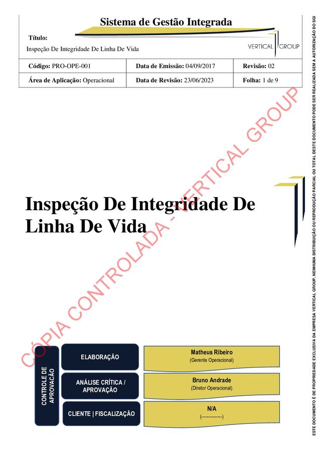 De Vida Código: PRO-OPE-001 Data de Emissão: 04/09/2017 Revisão: 02 Área de Aplicação: Operacional Data de Revisão: 23/06/2023 Folha: 3 de 9 ESTE DOCUMENTO É DE PROPRIEDADE EXCLUSIVA DA EMPRESA VERTICAL GROUP, NENHUMA DISTRIBUIÇÃO OU REPRODUÇÃO PARCIAL OU TOTAL DESTE DOCUMENTO PODE SER REALIZADA SEM A AUTORIZAÇÃO DO SGI 4.3 - Profissionais Envolvidos nas Atividades Utilização deste procediemtno e dos EPI's correlatos a sua função. 5 - TERMOS E DEFINIÇÕES Esticador: É um acessório utilizado para esticar cabos de aço e retirar as folgas, para aproveitar ao máximo seu desempenho. Linha de Ancoragem Vertical ou Horizontal: Linha flexível ou rígida, conectada em um ou mais pontos de ancoragem, que é parte de um sistema de retenção de quedas, um meio de retenção de queda ou suporte. Linha de Restrição: É aquela que limita o movimento no plano horizontal e restringe a mobilidade do trabalhador e é específica para trabalhos em apenas um local ou pequena região. Linha de Vida: Consiste na instalação de cabo de aço ou corda, horizontal ou vertical, que permite conectar o mosquetão do cinturão de segurança para proteger o trabalhador quando trabalhar em altura. Linha de Vida Horizontal Temporária: Um sistema de trava-quedas horizontal, de fácil instalação e remoção, que pode ser usado em mais de um local de trabalho, desde que não haja queda e que seja submetido a inspeção para avaliação das condições de reutilização. Manilha: É um acessório utilizado como elemento de união em cabos de aço, constituído por um corpo (curva ou reta) e o pino (rosqueado ou com pino, porca e cupilha). Olhal: Dispositivo de fixação, constituído por uma haste e um orifício no qual se passa uma corda ou cabo, podendo sustentar grandes cargas. Sapatilha para Cabo de Aço: É um acessório desenvolvido como elemento de proteção, que evita a deformação de cabos e desgastes de cordas. Sistemas de Ancoragem: Componentes definitivos ou temporários, dimensionados para suportar impactos de queda, aos quais o trabalhador possa conectar seu equipamento de proteção individual, diretamente ou através de outro dispositivo, de modo a que permaneça conectado em caso de perda de equilíbrio, desfalecimento ou queda. Os profissionais envolvidos nas atividades de Teste Hidrostático de Tubulação devem utilizar os EPI's correlatos a sua função. Os profissionais, além de estarem devidamente treinados para C Ó PIA C O N TR O LAD A - VER TIC AL G R O U P