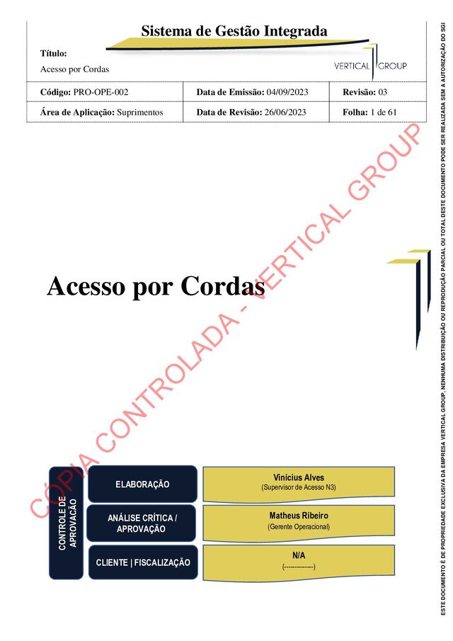 Data de Emissão: 04/09/2023 Revisão: 03 Área de Aplicação: Suprimentos Data de Revisão: 26/06/2023 Folha: 26 de 61 ESTE DOCUMENTO É DE PROPRIEDADE EXCLUSIVA DA EMPRESA VERTICAL GROUP, NENHUMA DISTRIBUIÇÃO OU REPRODUÇÃO PARCIAL OU TOTAL DESTE DOCUMENTO PODE SER REALIZADA SEM A AUTORIZAÇÃO DO SGI 6.11.9 Jumar Inspeção Visual dos Elementos de Segurança: 6.11.9.1 Estado do corpo (desgaste, corrosão, sulcos, deformações, fissuras); 6.11.9.2 Estado do batente antiretorno (desgaste, corrosão, sulcos, deformações, fissuras); 6.11.9.3 Estado do mordente (dentes gastos ou ausentes, corrosão) e os seus rebites (fissuras, marcas, desgaste, corrosão); 6.11.9.4 Estado da partilha de segurança (eixo – desgaste, fissura da poliamida). Inspeção Funcional: 6.11.9.5 Corda desliza para cima, bloqueia quando puxada para baixo; 6.11.9.6 Eficiência da mola do mordente; 6.11.9.7 Eficiência da mola da partilha de segurança; 6.11.9.8 Abertura completa da partilha de segurança sobre corpo ou bloqueador. 6.11.10 Mosquetão Inspeção Visual dos Elementos de Segurança: 6.11.10.1 Estado do corpo (fissuras, sulcos, deformações, desgaste, corrosão); 6.11.10.2 Estado do gancho ou do bico de fecho (fissuras, sulcos, deformações, desgaste, corrosão); 6.11.10.3 Estado dedo, rebite e do anel de fecho (fissuras, sulcos, deformações, desgaste, corrosão). Inspeção Funcional: 6.11.10.4 Verifique o bom funcionamento do dedo de fecho (limpar e olear o eixo): - Correto alinhamento dedo-bico - Eficiência da mola de retorno e da articulação do dedo 6.11.10.5 Funcionamento do sistema de segurança. 6.11.11 Roldana Inspeção Visual dos Elementos de Segurança: 6.11.11.1 Estado do corpo e das placas móveis (fissuras, deformação, marcas, desgaste e corrosão); 6.11.11.2 Estado da conexão (fissuras, deformação, marcas, desgaste e corrosão); 6.11.11.3 Estado das gargantas das polias (fissuras, deformação, marcas desgaste e corrosão); C Ó PIA C O N TR O LAD A - VER TIC AL G R O U P