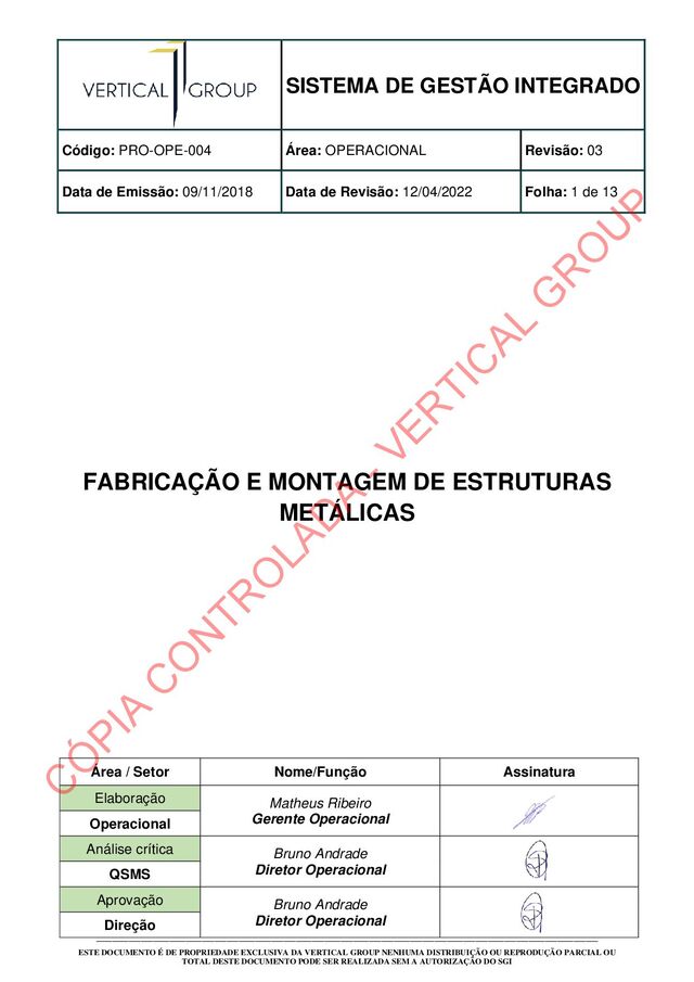 Data de Emissão: 09/11/2018 Data de Revisão: 12/04/2022 Folha: 12 de 13 ___________________________________________________________________________________________________________________________ ESTE DOCUMENTO É DE PROPRIEDADE EXCLUSIVA DA VERTICAL GROUP NENHUMA DISTRIBUIÇÃO OU REPRODUÇÃO PARCIAL OU TOTAL DESTE DOCUMENTO PODE SER REALIZADA SEM A AUTORIZAÇÃO DO SGI Nota Ao referido procedimento deverá ser atribuída Análise Preliminar de Risco (APR), para identificar cenários potencialmente críticos a esta atividade, bem como o levantamento das medidas preventivas para situações de perigo e risco. 5. DIRETRIZES DE QSMS Os colaboradores que irão executar trabalhos a quente, devem ser capacitados, competentes e familiarizados com os equipamentos a serem utilizados. Os equipamentos a serem utilizados em trabalhos a quente, devem ser previamente inspecionados por um colaborador qualificado e devidamente registrado em formulário específico de acordo com o PRO-SMS-015-Segurança na execução de trabalhos a quente. Em caso de irregularidades o QSMS deverá ser imediatamente informado. Nos trabalhos a quente executados nas áreas operacionais da Vertical Group e unidades de clientes, devem ser realizadas as Identificações e Avaliações de Perigos e Danos das atividades, objetivando prevenir e gerenciar os riscos envolvidos nas atividades a quente, bem como implantar medidas para neutralizar os riscos. Tais análises, serão realizadas utilizando a metodologia descrita no procedimento PRO-SMS-010-Análise Preliminar de Risco. Nos trabalhos a quente, serão utilizados como suporte as avaliações dos riscos e o registro no 45- FOR-SMS-Análise Preliminar de Risco, bem como no 225-FOR-SMS-Permissão de Trabalho. Além das ferramentas de análise preliminar de risco, devem ser realizados os Diálogos Diários de Segurança devidamente registrados no 12-FOR-SMS-DDSMS antes da realização das atividades a quente, bem como reunião pré-tarefa, registrando em formulário específico 224-FOR-SMS- Reunião Pré-Tarefa_Tool Box Meeting. Não será permitida a operação de equipamentos para soldagem e outros processos térmicos, sem as devidas qualificações profissionais dos colaboradores com os métodos a serem utilizados e equipamentos, incluindo as reações frente a incêndios e emergências. Estes colaboradores, devem ter suas competências avaliadas pelo Coordenador de Projetos da Vertical Group. Os profissionais envolvidos nas atividades de Fabricação e Montagem devem utilizar os EPI's correlatos a sua função. O operador utilizará o EPI referente à área (instalação) em que está atuando. Nota Nas operações que envolverão trabalhos em altura, espaço confinado e sobre o mar, os colaboradores deverão estar devidamente treinados e equipados com EPI para determinada atividade, seguindo sempre a orientação do Setor de HSE. Os profissionais, além de estarem devidamente treinados para desempenhar tal função, devem manter o foco na preservação do Meio Ambiente e no desenvolvimento sustentável, objetivos e Metas instituídas pela Organização; A organização deve manter e melhorar seu Sistema de Segurança, Saúde Ocupacional e Meio Ambiente para garantir a satisfação de seus profissionais, comunidade e preservação do meio ambiente. Este é um compromisso das empresas Vertical Group. C Ó PIA C O N TR O LAD A - VER TIC AL G R O U P