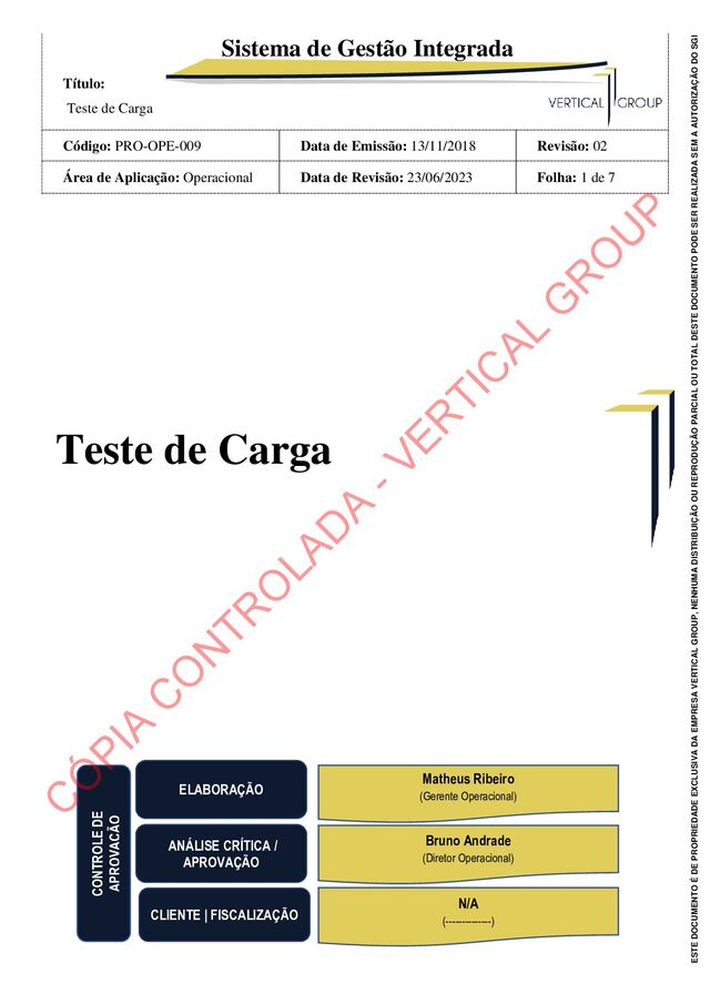 Data de Emissão: 13/11/2018 Revisão: 02 Área de Aplicação: Operacional Data de Revisão: 23/06/2023 Folha: 4 de 7 ESTE DOCUMENTO É DE PROPRIEDADE EXCLUSIVA DA EMPRESA VERTICAL GROUP, NENHUMA DISTRIBUIÇÃO OU REPRODUÇÃO PARCIAL OU TOTAL DESTE DOCUMENTO PODE SER REALIZADA SEM A AUTORIZAÇÃO DO SGI - Ensaio de LP: esse ensaio não é recomendado, porque a área de interesse é o aço, e para atingi- lo, a camada de Zinco teria que ser removida, alterando com isso, as propriedades do material final, deixando-o exposto à corrosão; - Ensaio de PM: a realização desse ensaio dependerá do grupo do material, que poderá variar em funçãqo do campo magnético. Esses materiais podem ser: Ferromagnéticos (ex.: Ferro, Cobalto e Níquel), Paramagnéticos (ex.: Platina e Alumínio) e Diamagnéticos (ex.: Zinco e Cobre). Estes últimos são os que apresentam menor condutividade elétrica, tornando-se o ensaio não confiável; Portanto, para saber se é possível a realização desse ensaio, é necessário conhecer a qualidade de elementos que foi adicionada com o Zinco na galvanização, o valor do vetor de indução magnética, a força magnetizante e a permeabilidade magnética. Depois, esses valores devem ser analisados por um profissional qualificado, para responder se o campo magnético (para o equipamento em questão) é suficiente para o ensaio ser considerado satisfatório; - Ensaio por Corrente Parasitas: a realização desse ensaio é para detectar descontinuidades superficiais em soldas de materiais ferromagnéticos com ou sem revestimento não condutivo. Material a ser ensaiado, cordões de solda e zona termicamente afetada em juntas de aço carbono, aço de baixa ou de alta liga; - Ensaio por Ultrassom: a realização desse ensaio é para detectar descontinuidades sub- superficiais em soldas sem revestimento. Material a ser ensaiado, cordões de solda e zona termicamente afetada em juntas de aço carbono, aço de baixa ou de alta liga. 6.3. RESULTADO DO TESTE Caso o equipamento não obtenha resultados satisfatórios na inspeção visual (antes e/ou após o teste), no próprio teste ou no END, será emitido um relatório de reprovação. O equipamento reprovado poderá ser reparado e retestado. Caso obtenha resultado satisfatório, será emitido um relatório de aceitação. 6.4. EXECUÇÃO DO TESTE DE CARGA Devem ser observadas as devidas condições de segurança no local de execução do teste. Sempre que possível, o teste deverá simular as condições reais de operação do equipamento, com relação às solicitações de carregamento. C Ó PIA C O N TR O LAD A - VER TIC AL G R O U P
