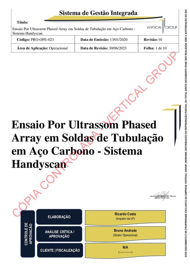 em Soldas de Tubulação em Aço Carbono - Sistema Handyscan Código: PRO-OPE-023 Data de Emissão: 13/01/2020 Revisão: 01 Área de Aplicação: Operacional Data de Revisão: 30/06/2023 Folha: 3 de 10 ESTE DOCUMENTO É DE PROPRIEDADE EXCLUSIVA DA EMPRESA VERTICAL GROUP, NENHUMA DISTRIBUIÇÃO OU REPRODUÇÃO PARCIAL OU TOTAL DESTE DOCUMENTO PODE SER REALIZADA SEM A AUTORIZAÇÃO DO SGI Caso os resultados obtidos pelo ultrassom computadorizado Phased Array sejam considerados satisfatórios (equivalentes ou melhores que o ensaio radiográfico) o procedimento será considerado apto para uso. Todos os resultados obtidos, através de um book de qualificação, deverão ser apresentados para o cliente/fiscalização. 3 - APLICAÇÃO A execução, registro e avaliação do ensaio por Eddy Current deverá ser realizado por pessoal qualificado de acordo com a norma SNT-TC- 1A da ASNT, a varredura do ensaio poderá ser executada por inspetor Nível I, a avaliação do ensaio e a elaboração dos relatórios deverá ser executada por inspetor Nível II. 4 - RESPONSABILIDADE Os caminhos de acesso às juntas a serem inspecionadas, para a equipe de Ultrassom, deverão estar desimpedidos e a junta em condições para inspeção. Fornecer todos os detalhes das juntas soldadas que estarão sujeitas a inspeção por ultrassom computadorizado, tais como, material de base, diâmetro, espessura, processo e procedimentos de soldagem. Fornecer seções dos tubos que serão utilizados no projeto para confecção de corpos de prova e blocos de calibração. Remover todos os reforços das soldas longitudinais ou espirais na área útil de varredura (mínimo de 130 mm para cada lado da solda circunferencial a ser ensaiada), faceando com o metal de base. Assegurar que a área útil de varredura esteja em conformidade com o item 12 deste procedimento. C Ó PIA C O N TR O LAD A - VER TIC AL G R O U P