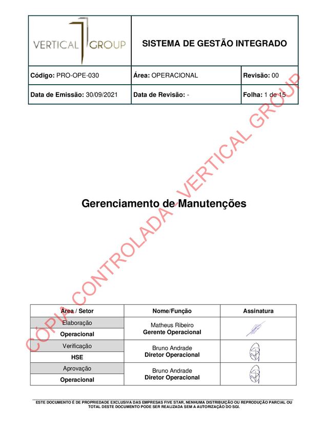 Data de Emissão: 23/08/2021 Data de Revisão: - Folha: 7 de 15 ______________________________________________________________________________________________________________________________ ESTE DOCUMENTO É DE PROPRIEDADE EXCLUSIVA DA EMPRESA VERTICAL GROUP, NENHUMA DISTRIBUIÇÃO OU REPRODUÇÃO PARCIAL OU TOTAL DESTE DOCUMENTO PODE SER REALIZADA SEM A AUTORIZAÇÃO DO SGI 5.5. Revisão no Plano de Manutenção; É de responsabilidade do Planejamento de Manutenção revisar, incluir ou retirar do calendário de paradas quando necessário. 5.6. Manutenção Preventiva; Periodicamente são realizadas manutenções preventivas nos equipamentos, seguindo calendário previamente definido pelo planejamento da manutenção, para sua execução, também será mantido um controle de informação em cada equipamento que irá constar a data da última manutenção realizada. 5.7. Identificação e sinalização; Todos os equipamentos durante qualquer tipo de manutenção devem ser devidamente sinalizados com etiquetas de travamento indicando sua situação e tipo de manutenção que está sendo realizada. 5.8. Estatísticas da Manutenção; São estatísticas que medem o desempenho do setor e divulgadas mensalmente e divulgadas quando solicitadas para os gestores, quanto às realizações das manutenções preventivas de acordo com plano de manutenção geral, manutenções programadas e manutenções corretivas, às manutenções programadas e corretivas, deveram ser submetidos a analises de falhas de componentes e/ou equipamentos sempre que tiver repetições de avarias e/ou setor de planejamento da manutenção julgar necessário. Nota: Casos de Não Conformidades são seguidos conforme PRO-SGQ-002 _ Não Conformidade e Ação Corretiva 6 - Considerações quanto Segurança, Saúde e Meio Ambiente. Os profissionais envolvidos nas atividades de Gerenciamento da Manutenção devem utilizar os EPI's correlatos a sua função. C Ó PIA C O N TR O LAD A - VER TIC AL G R O U P