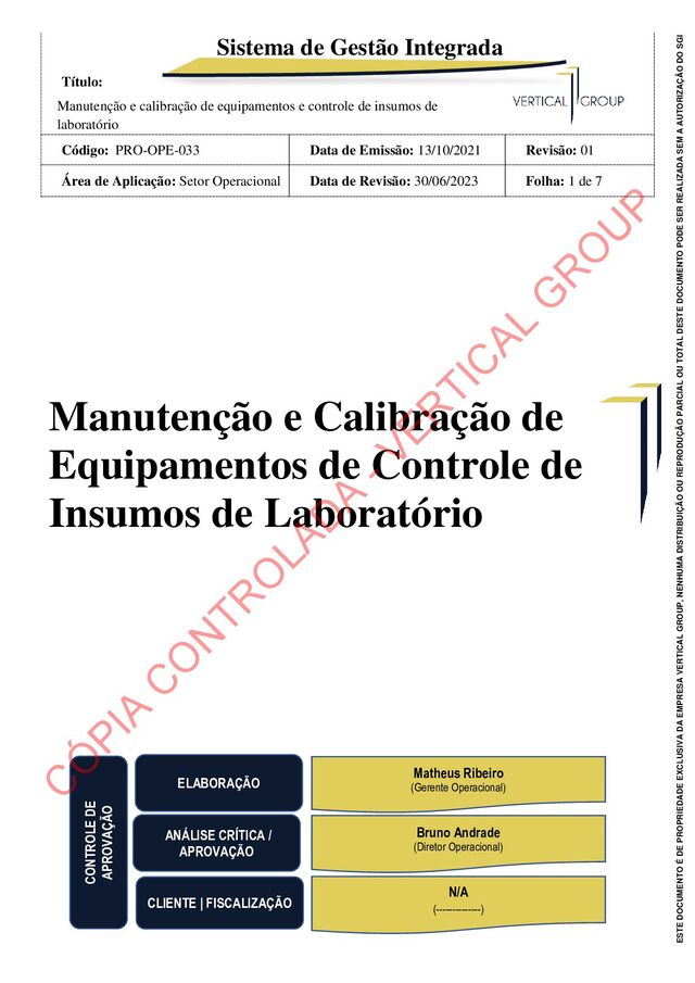 e controle de insumos de laboratório Código: PRO-OPE-033 Data de Emissão: 13/10/2021 Revisão: 01 Área de Aplicação: Setor Operacional Data de Revisão: 30/06/2023 Folha: 6 de 7 ESTE DOCUMENTO É DE PROPRIEDADE EXCLUSIVA DA EMPRESA VERTICAL GROUP, NENHUMA DISTRIBUIÇÃO OU REPRODUÇÃO PARCIAL OU TOTAL DESTE DOCUMENTO PODE SER REALIZADA SEM A AUTORIZAÇÃO DO SGI externo, ficará a cargo do prestador de serviço. 6.1.5 - QUALIFICAÇÃO DE FORNECEDORES As calibrações dos instrumentos de medição/Padrões e equipamentos devem ser realizadas por laboratório de calibração terceirizado. Os laboratórios pertencentes à RBC (Rede Brasileira de Calibração) estão automaticamente qualificados. Os laboratórios não pertencentes à RBC. Devem ser qualificados e mantidos como prestadores de serviço, de acordo com OS CRITÉRIOS DESTE PROCEDIMENTO; exceto aqueles que não possuem padrões rastreáveis à RBC (Rede Brasileira de Calibração), estes são automaticamente desqualificados. O setor de CQ deve avaliar os laboratórios que não pertencem à RBC pela qualidade intrínseca do serviço prestado, verificado o atendimento dos requisitos estabelecidos neste procedimento. Para o fornecedor que não pertence a RBC, juntamente com o certificado de calibração do instrumento de medição/Padrão e equipamento, devem ser enviadas cópias dos certificados de calibração dos padrões utilizados, os quais devem ser rastreados a padrões internacionais e nacionais reconhecidos. O setor de CQ deve verificar a rastreabilidade destes padrões a cada calibração. Caso seja utilizado um novo padrão ou validade da calibração do padrão esteja vencida o fornecedor de serviços de calibração deve enviar cópias atualizadas dos certificados de calibração dos padrões. Quando tais padrões não existirem, a metodologia de calibração utilizada deve ser documentada pelo fornecedor de serviços de calibração. 6.1.6 - MANUSEIO, PRESERVAÇÃO, ARMAZENAMENTO E EMBALAGEM Os equipamentos de medição adotados como padrão de referência ficam sob guardo do setor de Suprimentos/Ferramentaria, em local devidamente acondicionado. Os equipamentos de medição que estiverem sem condições de uso por motivo de prazo de calibração / verificação vencida, sem calibração, danificado, desgastado ou reprovado na análise do certificado de calibração, são identificados pelo CQ com fita vermelha que significa segregado / fora de uso, com objetivo de evitar a sua utilização. Quando do envio para calibração / ajuste em fornecedor, toma-se os seguintes cuidados: • Os equipamentos são transportados na sua embalagem original ou em caixas de madeira ou papelão, de modo a garantir sua total proteção; C Ó PIA C O N TR O LAD A - VER TIC AL G R O U P