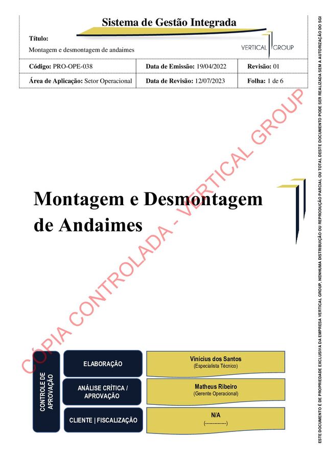 Código: PRO-OPE-038 Data de Emissão: 19/04/2022 Revisão: 01 Área de Aplicação: Setor Operacional Data de Revisão: 12/07/2023 Folha: 3 de 6 ESTE DOCUMENTO É DE PROPRIEDADE EXCLUSIVA DA EMPRESA VERTICAL GROUP, NENHUMA DISTRIBUIÇÃO OU REPRODUÇÃO PARCIAL OU TOTAL DESTE DOCUMENTO PODE SER REALIZADA SEM A AUTORIZAÇÃO DO SGI 6 - DETALHAMENTO Os andaimes devem ser montados e desmontados por profissionais qualificados com treinamento específico para o tipo de andaime em operação, e ter capacitação comprovada por certificado. A estrutura do andaime deve ser projetada de modo a suportar o peso das pessoas que trabalharão sobre o mesmo e as ferramentas, equipamentos e materiais necessários para a execução do serviço. Verificar perigo de contato do andaime com rede elétrica ou outros equipamentos energizados. Todo andaime deve possuir proteção lateral (guarda-corpo) e rodapé em todo o perímetro, conforme NR-18. O andaime deve ser apoiado em base firme, nivelada e rígida. Não apoiá-lo sobre terreno ou objetos instáveis como tijolos, blocos ou pedaços de madeira. Avaliar as condições do solo e providenciar base de apoio com pranchões e / ou chapas de aço, visando evitar o afundamento e / ou a inclinação do andaime. A fixação ou interligação das peças dos andaimes deve ser feita com dispositivos próprios (braçadeiras, luvas, pinos e contra pinos) sendo terminantemente proibido improvisações com arame, cordas ou peças que não fazem parte de sua composição. O piso de trabalho dos andaimes deve ter forração completa, antiderrapante, ser nivelado e fixado de modo seguro e resistente. A madeira para confecção de andaimes deve ser de boa qualidade, seca, sem apresentar nós e rachaduras que comprometam a sua resistência, sendo proibido o uso de pintura que encubra imperfeições. Os andaimes do tipo fachadeiro, suspensos e em balanço, antes da montagem, deverá apresentar ao profissional de segurança responsável e/ou supervisor da atividade, a ART do responsável pela montagem, o registro específico no Conselho Regional de Engenharia e Arquitetura (CREA) e o projeto de execução com o detalhamento técnico descritivo das fases de montagem, deslocamento do sistema durante a evolução do serviço e desmontagem. Os andaimes que necessitam de rodízios devem ser providos de travas e somente devem ser utilizados em locais de piso plano e pavimentado e ter altura limitada a 6 (seis) metros. É proibido deslocamento da estrutura dos andaimes com os trabalhadores sobre os mesmos. A subida e descida das plataformas dos andaimes somente devem ser efetuadas com a utilização das escadas do mesmo. C Ó PIA C O N TR O LAD A - VER TIC AL G R O U P