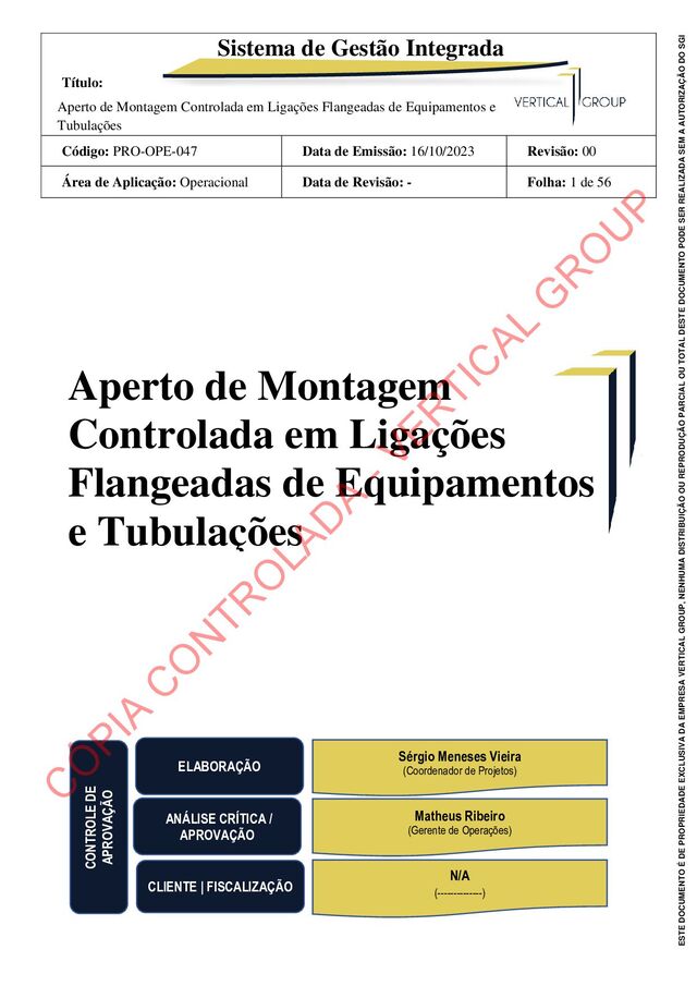 Ligações Flangeadas de Equipamentos e Tubulações Código: PRO-OPE-047 Data de Emissão: 16/10/2023 Revisão: 00 Área de Aplicação: Operacional Data de Revisão: - Folha: 54 de 56 ESTE DOCUMENTO É DE PROPRIEDADE EXCLUSIVA DA EMPRESA VERTICAL GROUP, NENHUMA DISTRIBUIÇÃO OU REPRODUÇÃO PARCIAL OU TOTAL DESTE DOCUMENTO PODE SER REALIZADA SEM A AUTORIZAÇÃO DO SGI Figura 22: Rampas de pressurização para as pressões PA e PB no tensionamento 50% (3 rampas p/ cada pressão) Nota: 1. Procedimento 1 (tensionamento 100%) - Deve ser usado um único passe na pressão PB que deve corresponder à pressão de ajuste da bomba para a (carga de aperto de montagem x 1,05). Utilizar pressurização em 3 rampas com intervalo de manutenção da pressão por, no mínimo, 3 (três) minutos entre as 3 pressurizações. Para junta anel manter por, no mínimo, 5 (cinco) minutos; 2. Procedimento 2 (tensionamento 50%) - Devem ser usados 3 passes: Primeiro passe na pressão PA para a 1ª. metade de estojos do flange, segundo passe na pressão PB para a 2ª. metade de estojos do flange e, finalmente, terceiro passe na pressão PB para a 1ª. metade de estojos do flange. Em cada passe utilizar pressurização em 3 rampas com intervalo de manutenção da pressão por, no mínimo, 3 (três) minutos entre as 3 pressurizações. Para junta anel manter por, no mínimo, 5 (cinco) minutos; 3. Procedimento 3 (tensionamento 33%) - Devem ser usados 5 passes: Primeiro passe na pressão PA para a 1ª. terça parte de estojos do flange, segundo passe na pressão (PA+PB/2) para a 2ª. terça parte de estojos do flange, terceiro passe na pressão PB para a 3ª. terça parte de estojos do flange, quarto passe na pressão PB para a 1ª. terça parte de estojos do flange e, finalmente, quinto passe na pressão PB para a 2ª. terça parte de estojos do flange. Em cada passe utilizar pressurização em 3 rampas com intervalo de manutenção da pressão por, no mínimo, 3 (três) minutos entre as 3 pressurizações. Para junta anel manter por, no mínimo, 5 (cinco) minutos; C Ó PIA C O N TR O LAD A - VER TIC AL G R O U P
