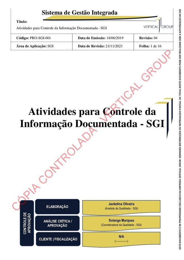 Documentada - SGI Código: PRO-SGI-001 Data de Emissão: 18/06/2019 Revisão: 04 Área de Aplicação: SGI Data de Revisão: 21/11/2023 Folha: 8 de 16 ESTE DOCUMENTO É DE PROPRIEDADE EXCLUSIVA DA EMPRESA VERTICAL GROUP, NENHUMA DISTRIBUIÇÃO OU REPRODUÇÃO PARCIAL OU TOTAL DESTE DOCUMENTO PODE SER REALIZADA SEM A AUTORIZAÇÃO DO SGI 6.5 - ANÁLISE CRÍTICA E APROVAÇÃO DE INFORMAÇÕES DOCUMENTADAS Com o objetivo de garantir que as informações documentadas do SGI estão condizentes com a realidade e melhores práticas, é realizada análise crítica periodicamente conforme detalhado a seguir, não se resumindo a estas: Durante as auditorias internas, os documentos são analisados e comparados com a sistemática praticada. Caso haja divergência, as informações documentadas devem passar pelo processo de elaboração / revisão e aprovação, para adequar ao processo. Independente de auditoria, as informações documentadas devem ser analisadas com frequência pelos envolvidos no processo (avaliar se o que diz no documento condiz com o que se faz atualmente e se todos os envolvidos estão cientes). Ao alcançar o período de 02(dois) anos e a informação documentada não passou por uma revisão, a mesma deve ser submetida ao Gestor do Processo para uma análise crítica. O setor de SGI envia o status das informações documentadas via e-mail, seguindo a Lista Mestra de Informações Documentadas, para acompanhamento do gestor do setor / processo, para que o mesmo avalie se alguma mudança é necessária. Após identificar esta necessidade de revisão, o Gestor deve analisar a informação documentada e/ou sinalizar ao setor de SGI se há a necessidade ou não de revisar sua informação documentada. Caso seja necessário, a nova revisão (comentários) deve ser formalizada e enviada em sua estrutura padrão ao SGI. Todas as atividades após análise Crítica devem constar no Histórico do documento que passou por análise crítica, indicando se houve a necessidade de adequação e descrever de forma resumida a revisão realizada. Caso, não haja a necessidade de revisão, basta sinalizar no histórico: “Esta Informação Documentada passou por uma análise crítica devido aos 02 anos sem análise e foi constatada a não necessidade de se realizar e emitir revisão atualizada”. a. No controle de alterações consta: Data da Análise Crítica e a Descrição, conforme acima. b. No cabeçalho: Data e a sequência de revisão não mudam. c. Apenas deve sinalizar (Data de revisão anterior acrescentar um código, conforme exemplo a seguir: Ex.: 05/03/2021 - AC01). C Ó PIA C O N TR O LAD A - VER TIC AL G R O U P