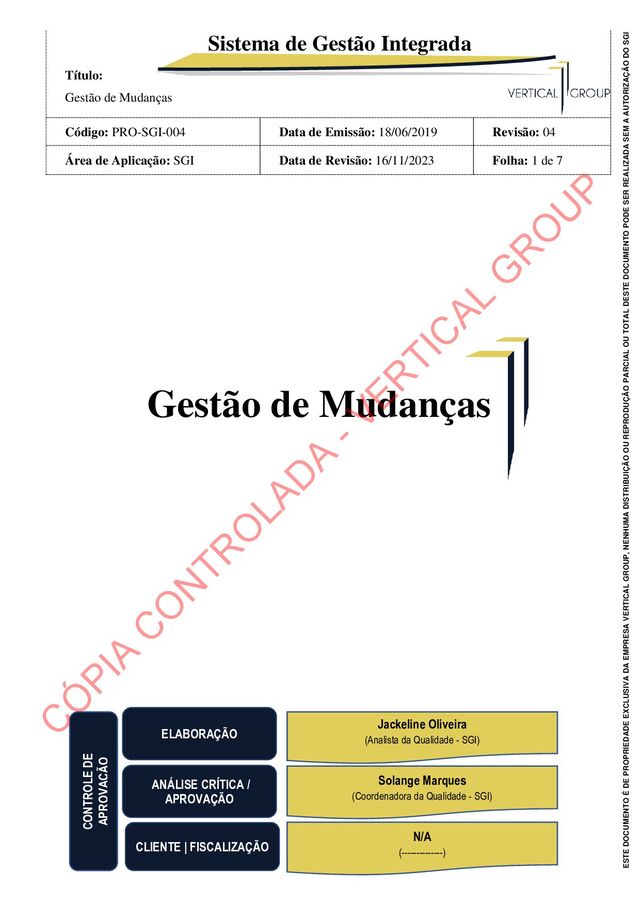 Data de Emissão: 18/06/2019 Revisão: 04 Área de Aplicação: SGI Data de Revisão: 16/11/2023 Folha: 3 de 7 ESTE DOCUMENTO É DE PROPRIEDADE EXCLUSIVA DA EMPRESA VERTICAL GROUP, NENHUMA DISTRIBUIÇÃO OU REPRODUÇÃO PARCIAL OU TOTAL DESTE DOCUMENTO PODE SER REALIZADA SEM A AUTORIZAÇÃO DO SGI O setor de SGI é responsável por: • Acompanhar periodicamente, as ações para avaliar a eficácia da mudança. 4.2 - TODOS OS COLABORADORES ONSHORE E OFFSHORE Os colaboradores são responsáveis por: • Identificar e registrar as mudanças no formulário pertinente, • Realizar as ações necessárias conforme plano de ação. 5 - TERMOS E DEFINIÇÕES Mudança: Qualquer alteração permanente ou temporária, que possa impactar a execução de um serviço e/ou que modifique riscos e/ou altere a confiabilidade de equipamentos ou sistemas. As mudanças abordadas nesse procedimento podem estar relacionadas à tecnologia, instalações, operações, especificações/aplicações originais de equipamentos, estrutura organizacional, funcionários (força de trabalho própria ou contratada), fornecedores críticos, procedimentos do sistema de gestão, projeto de realização de serviços; SGTotal: Software de Gestão do SGI. 6 - DETALHAMENTO 6.1 - ABRANGÊNCIA DOS PROCESSOS DE MUDANÇA a) Mudanças nas instalações - Mudança ou inclusão de itens nas instalações, edificações, sistemas, equipamentos e componentes, durante todo o seu ciclo de vida, sem modificação da tecnologia. b) Mudanças nas pessoas - Mudança advinda de admissão, transferência, substituição temporária ou permanente, redução ou aumento do contingente, promoção com mudança de função ou retorno às atividades após afastamento, que possa caracterizar alteração no risco, ou no modo de operação, ou na forma de intervenção no processo, inclusive em emergências. c) Mudança no serviço – Qualquer mudança nos requisitos do cliente, nas metodologias de trabalho, no produto final ou no planejamento do serviço. d) Mudanças na tecnologia – Mudança nas características de insumos e produtos (inclusive resíduos) de um processo e nas condições em que o processo é desenvolvido (incluindo software). C Ó PIA C O N TR O LAD A - VER TIC AL G R O U P