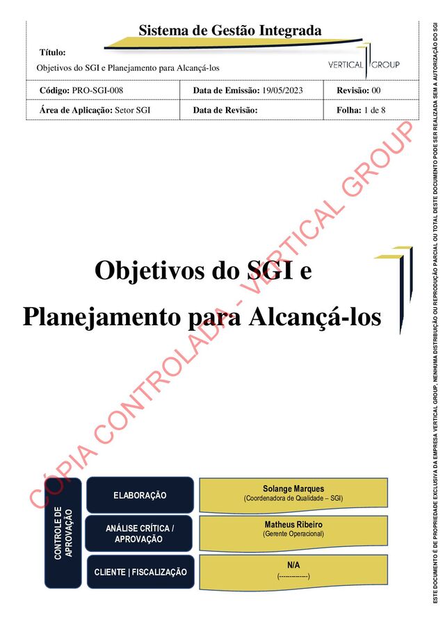 para Alcançá-los Código: PRO-SGI-008 Data de Emissão: 19/05/2023 Revisão: 00 Área de Aplicação: Setor SGI Data de Revisão: Folha: 5 de 8 ESTE DOCUMENTO É DE PROPRIEDADE EXCLUSIVA DA EMPRESA VERTICAL GROUP, NENHUMA DISTRIBUIÇÃO OU REPRODUÇÃO PARCIAL OU TOTAL DESTE DOCUMENTO PODE SER REALIZADA SEM A AUTORIZAÇÃO DO SGI 6.2 - COLETA E ANÁLISE DOS DADOS A coleta de dados deve ser obtida através de fontes concretas e confiáveis, sendo lançadas no “indicador do objetivo”, conforme frequência estabelecida no POM-SGI-001_Plano de Objetivos e Metas - SGI. Para isso, o gestor de cada objetivo deve se atentar para os seguintes itens: a) as fontes de dados devem ser definidas, validadas e confiáveis; b) Os Indicadores (KPIs) devem ser enviados ao SGI, já com a análise e registro do gestor responsável, caso não tenha atingido a meta estabelecida e até mesmo superado a mesma. A coleta dos dados pode ser mensal. Porém, a entrega ao SGI deve ser trimestral e o prazo máximo para o envio é de 10 dias úteis do mês seguinte ao fechamento do trimestre (exemplo: 1º trimestre (jan.|fev.|març. => entregar até 10 dias úteis de abril - 14 de abril); c) realizar a análise de dados considerando as seguintes questões: Política de Gestão Integrada Objetivo Como? Processos Responsável Indicador Fonte de Extração Fórmula - KPI Meta Periodicídade de apresentação dos resuldatos ao SGI Reconhecer, avaliar e controlar os riscos e oportunidades do negócio Minimizar os riscos e maximizar as oportunidades Contexto da Organização / Mapeamento de Processo Desenvolvimento de Negocios Luiz Felipe 1 - Índice de Proposta/Orçamento Aceito Planilha de Propostas (Número de oportunidades geradas / número de solicitações recebidas)* 100 60% Proposta Aceita Trimestral Atender as expectativas das partes interessadas de forma proativa, satisfazendo suas necessidades Definir as estratégias para aumentar o apoio, reduzir as resistências e minimizar os impactos negativos das partes interessadas durante todo o ciclo de vida do projeto Análise SWOT Gerenciamento de projetos Matheus Ribeiro 2 - Índice de Satisfação do Cliente Externo (ISE) 3 - Índice de ações oriundas de RNC tratadas dentro do prazo 2 - Feedback do Cliente 3 - Prazos definidos nas RNC's emitidas 2 - Pesquisa enviada x Pontuação Obtida 3 - (Quantidade total de ações concluídas no prazo / quantidade total de ações previstas)*100 2 - 75% de satisfação dos clientes externo (bom + ótimo) 3 - 100% Trimestral Controlar os custos garantindo a integridade do orçamento Garantir uma boa saúde financeira para a organização. Planilha Finaceira Financeiro Mayara Neves 4 - Índice de Lucratividade Planilha de porcentagem ideal para o custo fixo Faturamento estipulado x Faturamento Realizado ≤30% do valor total do faturamento da empresa Trimestral Eliminar os perigos e reduzir os riscos, a fim de promover operações seguras e saudáveis aos colaboradores e sustentáveis ao meio ambiente ao atuarmos nos processos de montagem, manutenção e inspeção de estruturas metálicas Garantir a segurança dos colaboradores e o respeito ao meio ambiente REM (Resumo estatístico mensal) SMS Mary Ferreira 5 - Índice de Acidentes, Incidentes e doenças ocupacionais REM (Resumo estatístico mensal) 4: Dias x 1000000/H 5: Dias x 1000000/H 6: TF x HHT 0% Trimestral Proteger o meio ambiente, consumir os recursos naturais de forma responsável, não poluir e não causar acidentes; Atender todos os requisitos legais e outros aplicáveis ao sistema de QSMS; Medidas de mitigação, recuperação, melhoria ou manutenção da qualidade ambiental Gerenciamento de Resíduos SMS Mary Ferreira 6 - Índice de resíduo coletado e corretamente destinado Planilha gestão de resíduos (Quantidade de resíduos coletados com CDF emitido / quantidade total de resíduos coletados) * 100 100% dos resíduos com CDF Trimestral Facilitar a participação, ouvir os colaboradores e cooperar ativamente para melhorar continuamente a cultura interna; Incentivar a representatividade e a interação do trabalhador em assuntos de QSMS(Qualidade, Segurança, Saúde e Meio Ambiente) Canal de Comunicação eficiente SMS Mary Ferreira 7 - Índice de pesquisa enviada e respostas recebidas Enquete com colaboradores Quantidade enviada X Quantidade recebida 80% recebida Trimestral Disponibilizar os recursos necessários para atendimento dessa Política; Melhorar continuamente o Sistema de Gestão Integrado através de um monitoramento objetivo, ouvindo clientes, fornecedores e colaboradores. Definir as estratégias para aumentar o apoio, reduzir as resistências e minimizar os impactos negativos das partes interessadas durante todo o ciclo de vida do projeto Sistema de monitoramento de Provedores Externos Compras Decio Vieira 8 - Índice de Desempenho dos Provedores Externos Dados controlado pelo time de compras (Quantidade de fornecedores com IDPE >= 75% / quantidade total de forncedores avaliados)*100 80% Trimestral Controlar os custos garantindo a integridade do orçamento Garantir uma boa saúde financeira para a organização. Planilha de Logistica Pessoal Logística de pessoal Laiane Mello 9 - Índice de no show Dados da planilha de controle de programação de embarque. (Quantidade de embarques programados / quantidade de embarques realizados)*100 100% das programações atendidas Trimestral Disponibilizar os recursos necessários para atendimento dessa Política; Melhorar continuamente o Sistema de Gestão Integrado através de um monitoramento objetivo, ouvindo clientes, fornecedores e colaboradores. Definir as estratégias para aumentar o apoio, reduzir as resistências e minimizar os impactos negativos das partes interessadas durante todo o ciclo de vida do projeto Plano de Treinamentos RH (T&D - Desempenho) RH (T&D - Desempenho) 11 - Índice de atendimento ao plano anual de treinamento Plano de treinamento (Qantidade de treinamento realizados / quantida