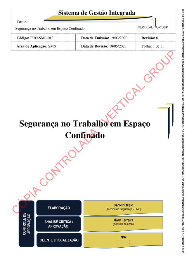 Confinado Código: PRO-SMS-013 Data de Emissão: 19/03/2020 Revisão: 01 Área de Aplicação: SMS Data de Revisão: 18/05/2023 Folha: 5 de 11 ESTE DOCUMENTO É DE PROPRIEDADE EXCLUSIVA DA EMPRESA VERTICAL GROUP, NENHUMA DISTRIBUIÇÃO OU REPRODUÇÃO PARCIAL OU TOTAL DESTE DOCUMENTO PODE SER REALIZADA SEM A AUTORIZAÇÃO DO SGI Ordenar o abandono do espaço confinado sempre que reconhecer algum sinal de alarme, perigo, sintoma, queixa, condição proibida, acidente, situação não prevista ou quando não puder desempenhar efetivamente suas tarefas. 4.5 - O Segurança do Trabalho, Supervisores e Líderes Cabe a Segurança de o Trabalho exercer a função de Supervisor de Entrada e assegurar que todas as disposições legais e os procedimentos normativos pertinentes, foram cumpridos e liberar acesso dos colaboradores ao espaço confinado, através da emissão da P.E.T. - Permissão de Entrada e Trabalho em espaço confinado em 3 vias, vinculada ao tipo de trabalho projetado. Proceder à inspeção prévia do local, identificando os riscos e a avaliação atmosférica em espaço confinado, para as seguintes condições: • concentração de oxigênio • gases e vapores inflamáveis • contaminantes do ar potencialmente tóxicos ou explosivos (poeiras) 5 - TERMOS E DEFINIÇÕES Alívio: o mesmo que abertura de linha; Purga: método de limpeza que torna a atmosfera interior de espaço confinado isenta de gases, vapores e outras impurezas indesejáveis através de ventilação ou lavagem com água ou vapor; Análise Preliminar de Risco (APR): avaliação inicial dos riscos potenciais, suas causas, consequências e medidas de controle; Atmosfera IPVS - Atmosfera Imediatamente Perigosa à Vida ou à Saúde: qualquer atmosfera que apresente risco imediato à vida ou produza imediato efeito debilitante à saúde; Base técnica: conjunto de normas, artigos, livros, procedimentos de segurança de trabalho, e demais documentos técnicos utilizados para implementar o Sistema de Permissão de Entrada e Trabalho em espaços confinados. Contaminantes: gases, vapores, névoas, fumos e poeiras presentes na atmosfera do espaço confinado. Deficiência de Oxigênio: atmosfera contendo menos de 20,9 % de oxigênio em volume na pressão atmosférica normal, a não ser que a redução do percentual seja devidamente monitorada e controlada; C Ó PIA C O N TR O LAD A - VER TIC AL G R O U P