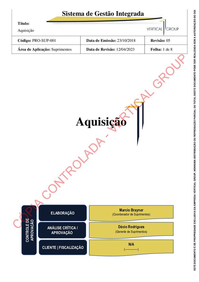 Emissão: 23/10/2018 Revisão: 05 Área de Aplicação: Suprimentos Data de Revisão: 12/04/2023 Folha: 6 de 8 ESTE DOCUMENTO É DE PROPRIEDADE EXCLUSIVA DA EMPRESA VERTICAL GROUP, NENHUMA DISTRIBUIÇÃO OU REPRODUÇÃO PARCIAL OU TOTAL DESTE DOCUMENTO PODE SER REALIZADA SEM A AUTORIZAÇÃO DO SGI Após a criação da Ordem de Compra, a mesma é submetida a aprovação Gerencial através do Sistema. Após analisada e aprovada via sistema (aprovação gerencial), a Ordem de Compra é enviada via e-mail ao provedor para faturamento e preparação/entrega do pedido. Nota: Preferencialmente a condição de pagamento junto aos provedores é a prazo, podendo este, variar de provedor para provedor. Porém, podem ser solicitados pagamentos à vista (adiantado) desde que sejam aprovados de forma prévia, via e-mail pela gerência responsável. 6.4.2 - APROVAÇÃO DE COMPRAS RETROATIVAS Em caso de Contratos e/ou Fornecimento de Serviços, a Ordem de Compra é emitida após o período acordado para faturamento, conferência do BM (boletim de medição) com devida evidência da prestação do serviço. Para provedores de serviços essenciais como Logística, RH, fornecimento de gases industriais e contratação de transportes (frete), onde conferência do Boletim de medição e aprovação do faturamento é feita pelo responsável dos respectivos setores solicitantes, são geradas ordens de compra retroativa, após a devida aprovação gerencial via e-mail ou sistema. Após análise, conferência e aprovação dos processos feitos pelo setor requisitante, os boletins de medição, aprovação das faturas e boletos são enviados para o setor de compras, a fim de realizar a inserção no sistema (criação de ordem de Compra). Após a inserção dos dados e criação da OC em sistema, o setor de compras protocola as notas fiscais e envia ao setor financeiro para pagamento e conclusão do processo. 6.5 - CADASTRAMENTO E HOMOLOGAÇÃO DE PROVEDORES Cabe ao setor de compras, desenvolver, analisar e homologar novos provedores de acordo com as prioridades e política da Vertical Group. O mesmo deve ser homologado conforme PRO-SUP-003- Provedores Externos. 6.6 - RECEBIMENTO DO MATERIAL O recebimento de Produtos deve ocorrer de acordo com o PRO-SUP-002-Recebimento Manuseio e Gestão de Estoque e o setor de compras deve ser notificado sobre a chegada do material e se há alguma divergência quanto ao recebimento. Nos casos de materiais que chegam em divergência com o pedido de compras, o setor de almoxarifado comunica ao compras que realiza a tratativa junto ao provedor, para definir, de forma C Ó PIA C O N TR O LAD A - VER TIC AL G R O U P