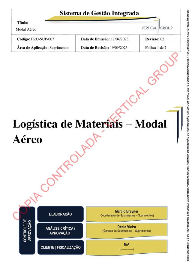 de Emissão: 17/04/2023 Revisão: 02 Área de Aplicação: Suprimentos Data de Revisão: 19/09/2023 Folha: 4 de 7 ESTE DOCUMENTO É DE PROPRIEDADE EXCLUSIVA DA EMPRESA VERTICAL GROUP, NENHUMA DISTRIBUIÇÃO OU REPRODUÇÃO PARCIAL OU TOTAL DESTE DOCUMENTO PODE SER REALIZADA SEM A AUTORIZAÇÃO DO SGI 6.2 - Disponibilidade de Materiais Caso algum item não esteja disponível em estoque, deve ser gerado um processo de aquisição. Em caso de não atendimento completo à requisição, deve ser informado no mesmo loop de e- mail da requisição que o atendimento será parcial e alinhado com o requisitante referente ao complemento do envio. Nota: Todo processo deverá ficar registrado no loop de e-mail da requisição. 6.3 - Tratativa inicial dos pedidos a. Cria-se um pedido via Sistema e após aprovado, o pedido é visualizado pelo almoxarifado e colocado dentro da Plataforma de gerenciamento de trabalho, para as devidas tratativas (separação, embalagem, emissão de nota fiscal, agendamento etc.). Dentro da atividade serão criadas as subtarefas direcionando para cada profissional responsável por cada etapa do processo, como por exemplo: Pedido Consumíveis, Pedido Ativos, Pedido TI e demais segmentos, até que o mesmo esteja totalmente pronto e disponível e liberado para embarque. b. A embalagem do pedido seguirá com informações para que se possa direcionar da melhor forma. Informações como: Projeto xxx – Número do Pedido/Requisição xxx –Unidade xxx – RT xxx - Data do embarque xxx (conforme etiqueta de identificação), no campo observação deve ser inserido o nome do profissional que irá receber o material e contato do mesmo. C Ó PIA C O N TR O LAD A - VER TIC AL G R O U P
